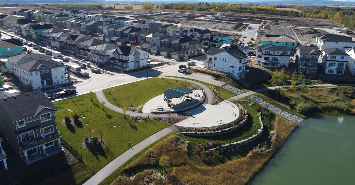 Vermilion Hill is a master-planned community located in southwest Calgary, developed by Qualico Communities Calgary. This thoughtfully designed neighborhood combines the tranquility of nature with the convenience of urban amenities. The community features a connecting greenway throughout and four park areas, including a storm pond with pathways and gathering spaces, providing ample opportunities for residents to enjoy the outdoors.