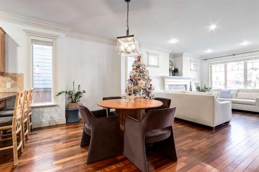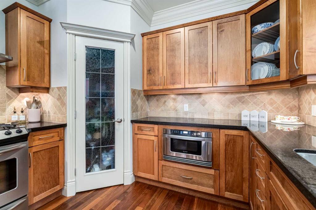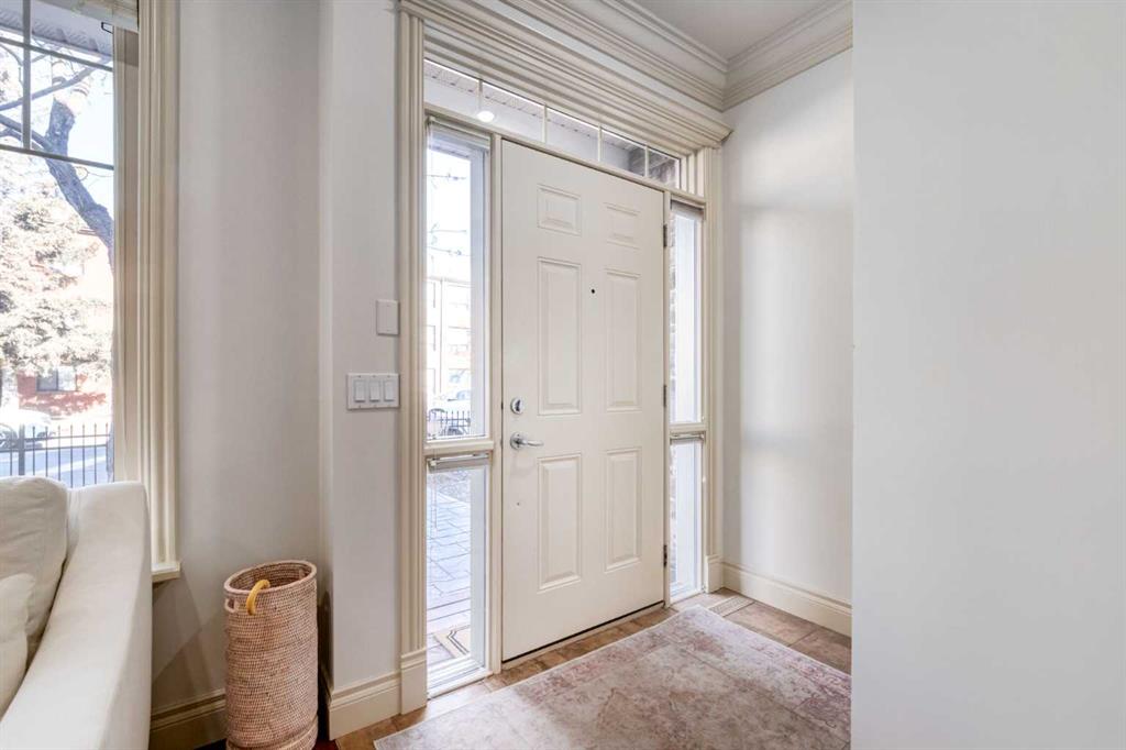 Welcome to the Brownstones of West Hillhurst. Presenting this unique opportunity to own a timeless and traditionally crafted home designed by locally acclaimed architect John Hadden. This highly sought-after location is walking distance to the trendy Kensington district featuring fine cafes, restaurants and retail shops. Minutes away from the University of Calgary and convenient access to downtown, this home is perfect for all demographics. This exceptional 3-bedroom front unit offers over 2100 square foot of living space, enhanced by luxurious finishes, soaring 9’ ceilings, crown moulding, recessed pot lighting, exquisite trim and hardwood floors. The home opens effortlessly into the living room featuring a cozy stone faced gas fireplace with mantle and overlooks your private north facing fenced patio allowing for abundant sunlight, creating a bright and welcoming atmosphere. Beyond the living room you will find the dedicated dining room which flows into a culinary dream. The impressive gourmet kitchen features a gas range and convection oven, 20 amp outlets, under-cabinet lighting, Frigidaire Gallery stainless steel appliances, built-in drawer microwave, shaker panel stained maple cabinets and rich granite counters. The laundry room with wash sink and 2-piece bathroom complete the main floor. On the upper level, the primary bedroom is detailed with elegant wainscoting, vaulted ceiling with remote operated ceiling fan and walk-in closet with custom organization. The spa inspired 5 piece ensuite features dual vanities, an oversized soaker tub and a standalone glass shower. The second bedroom includes 2 large closets and jack-and-jill 4-piece bathroom. Venture into the fully finished basement, a flexible space ideal for relaxation, entertainment or extra workspace. Here you’ll find a generous recreation room featuring a dry bar with bar fridge, wine rack and granite counter top. An additional bedroom with private 4-piece bathroom, large storage room and utility room completes this lower level. Low monthly condo fees take care of all exterior yard maintenance, irrigation, snow removal, garage utilities and more. Welcome to a thoughtfully designed residence that offers a traditional style with an exceptional location —welcome home to the Brownstones.