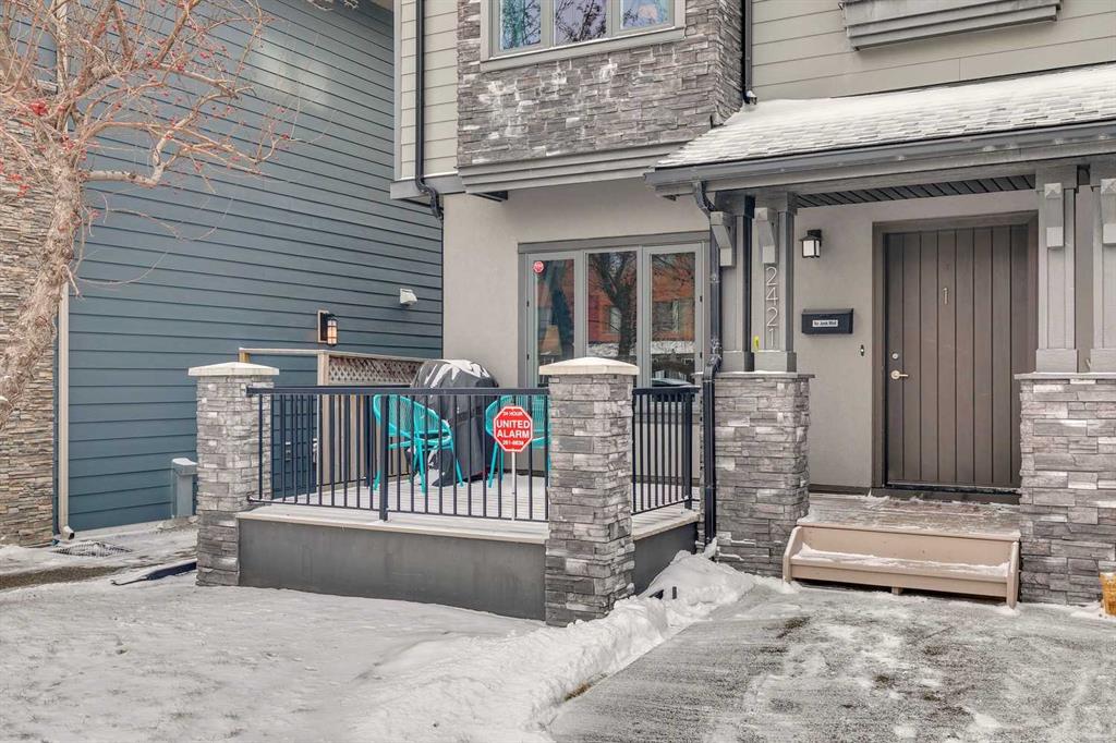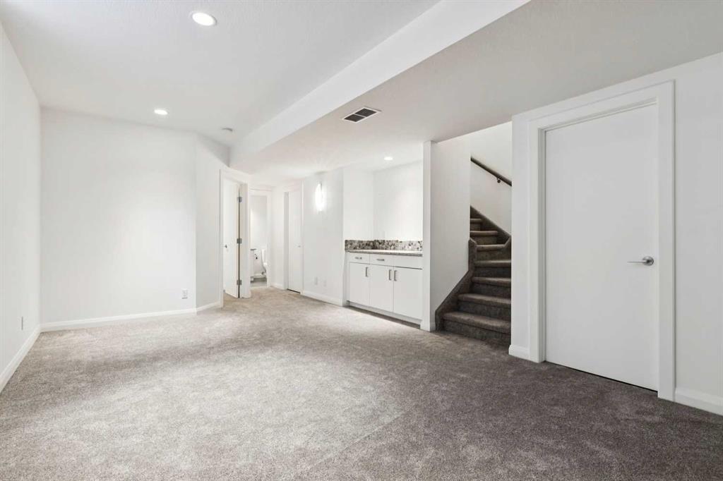 Looking to enter West Hillhurst, but don’t want to sacrifice space or quality? Welcome to #1, 2421 2 Avenue NW: a beautiful front-facing 3-storey townhouse in sought-after West Hillhurst offering over 2,500 sqft of total living space, including a fully developed basement. The home sits at the front of the complex with a welcoming front deck and aggregate concrete exterior, and includes one stall in the detached garage off the back lane along with a visitor parking pad. The main floor features 9-foot ceilings, an extra-wide front door, hardwood flooring, and an open-concept living room, dining area, and kitchen, plus a convenient half bathroom with quartz countertops and tile floors. The kitchen includes stainless steel appliances, an in-wall oven, an induction stovetop with range hood, quartz countertops, pantry storage, a bar fridge, and a microwave replaced in 2023. Soundproofing between units is exellent, and solid doors are installed throughout the home. On the second floor, you will find 2 carpeted bedrooms, laundry, and a full bathroom with quartz countertops, tile floors, and a tiled tub/shower combination. The primary bedroom also includes a large private ensuite with dual sinks, quartz countertops, a tiled shower, and a large soaker tub. The incredible top floor is a bright and versatile space with vaulted ceilings, skylights, a ceiling fan, and a Juliet balcony, making it ideal for a bedroom, office, workout space, playroom, or media room. The developed basement offers new carpet, a large rec room with wet bar, a spacious bedroom, and a full bathroom with quartz countertops, tile floors, and a tiled tub/shower combination, along with the boiler system. Carpet throughout the top two floors and basement was replaced in 2022, and shingles were replaced in 2023. Maintenance fees are a low $418 per month and include reserve fund contributions, snow removal, annual exterior window cleaning, exterior insurance, and electricity for the garage. Located in the highly desirable community of West Hillhurst, this home is within walking distance to the amazing Bow River pathway system, close to a grocery store, and near several schools and local amenities, with quick access to downtown and Kensington. Book your showing before it’s too late!