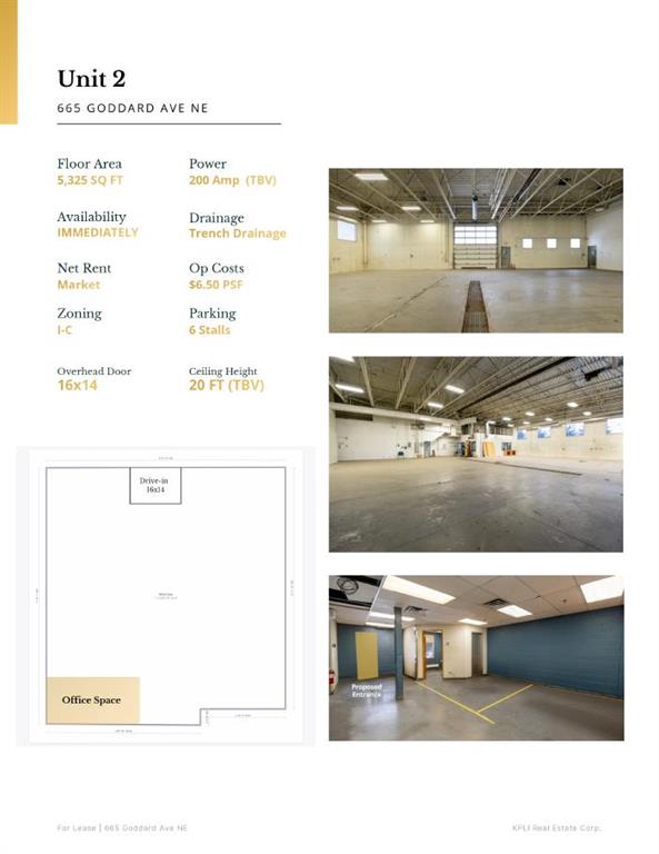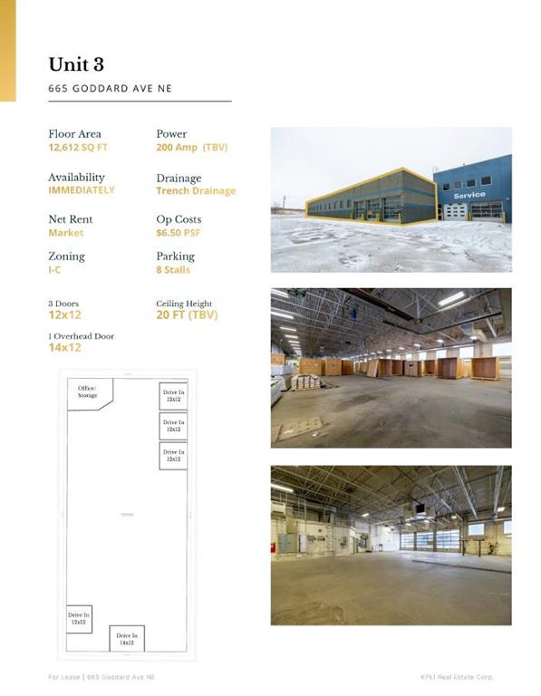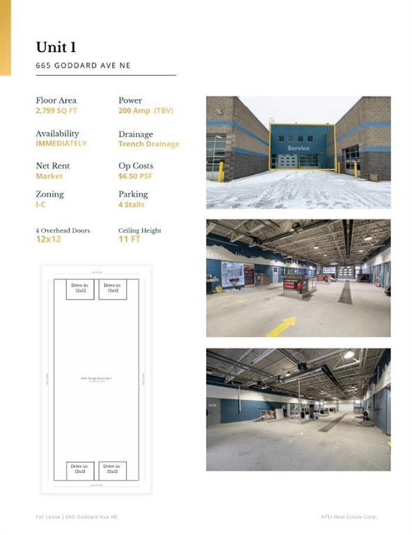 The unit features four 12’ x 12’ drive-in overhead doors, providing exceptional vehicle access and operational flexibility. Inside, the bay offers 11-foot clear ceiling height, trench drainage, and 200 amp power (to be verified), supporting a wide range of operational uses. The property is zoned I-C (Industrial – Commercial), allowing for various industrial and commercial applications.
