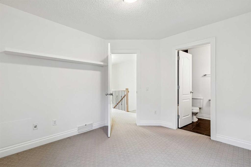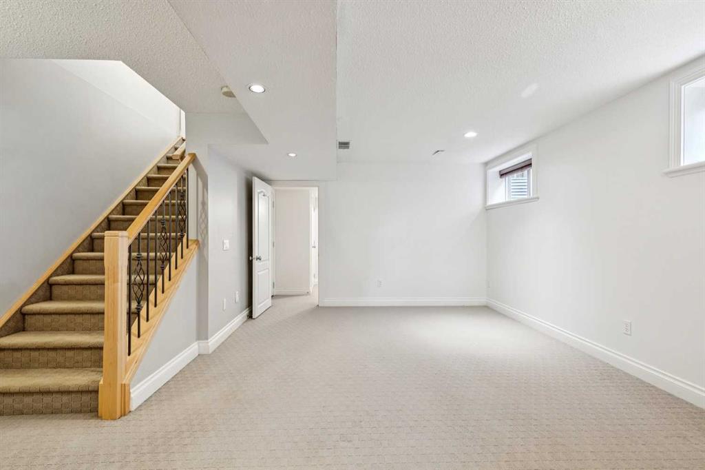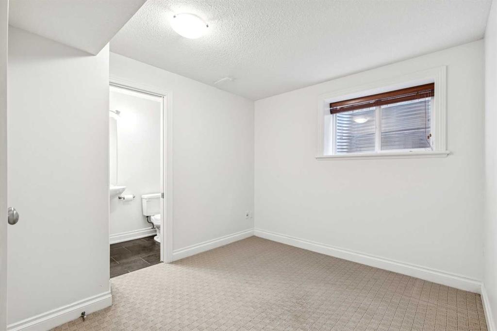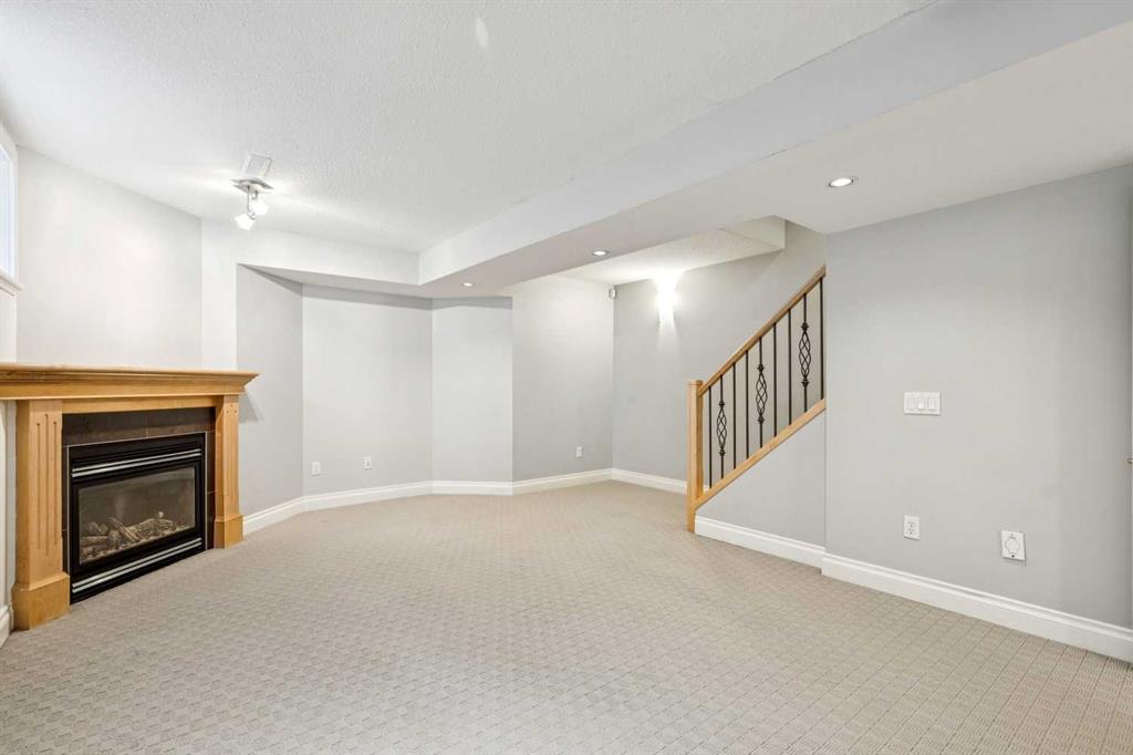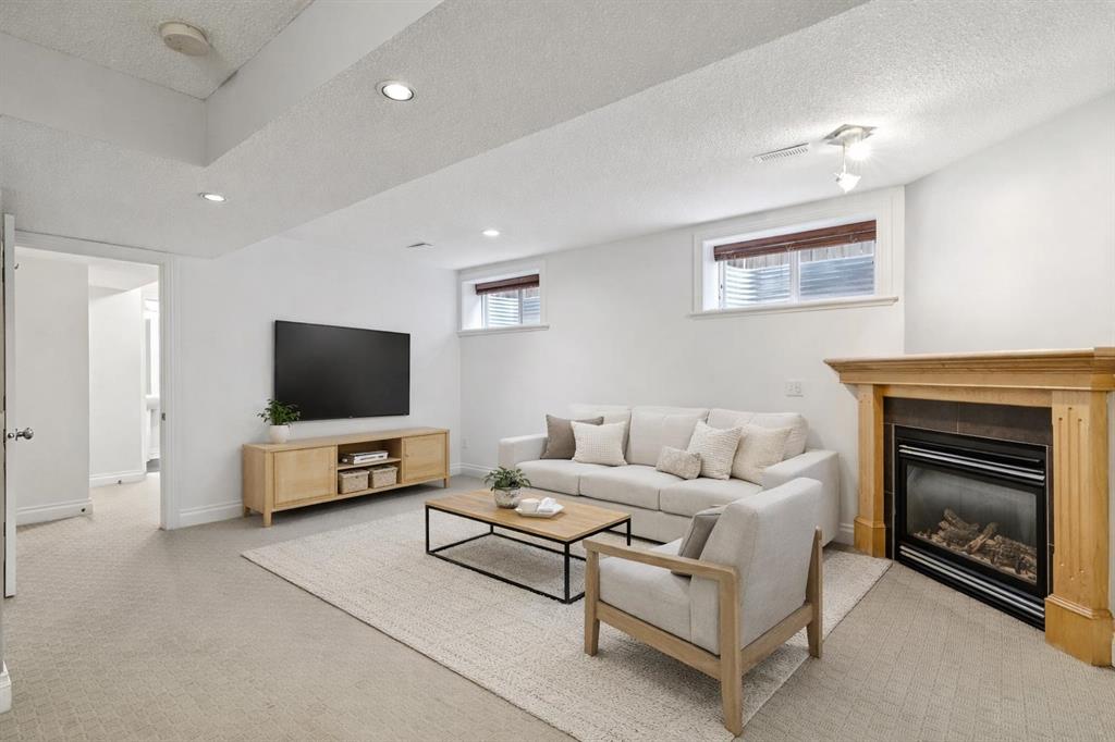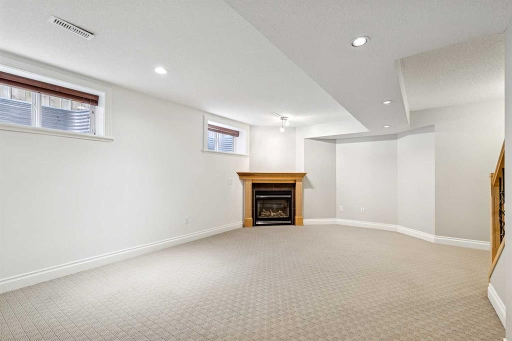 The fully finished basement expands the living space with a second gas fireplace in the sitting or recreation area, plus a third bedroom with its own ensuite — ideal for guests, a home office, or extended family. (Yes — every bedroom in this home has its own ensuite.) Additional storage and a tidy utility room with built-in shelving complete the lower level.