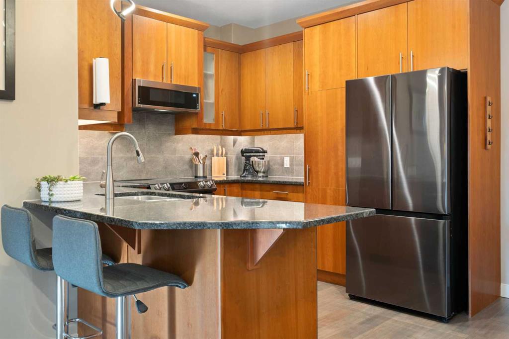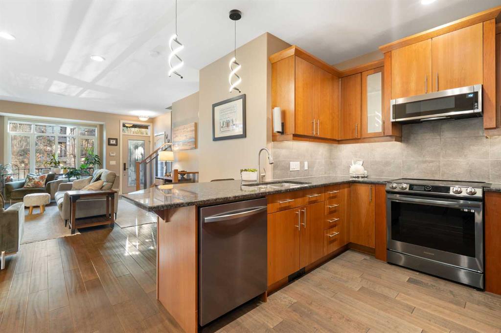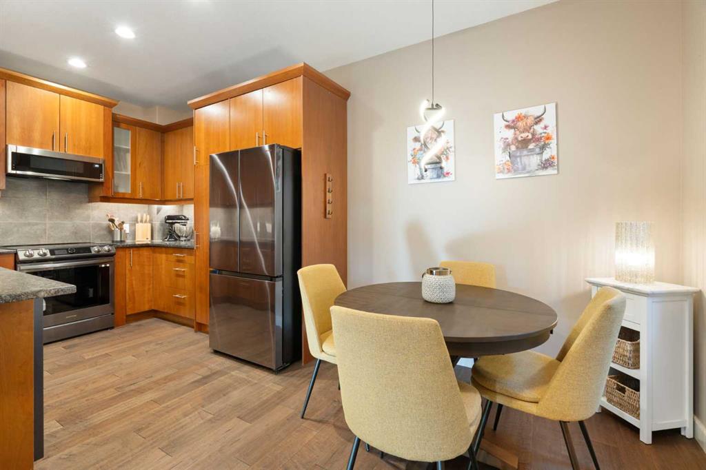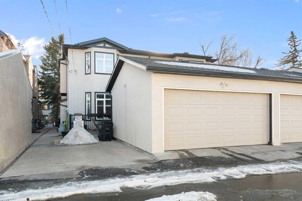 Located in Windsor Park, one of Calgary’s most convenient and desirable communities, this south-facing two-storey townhome is impeccably maintained and shows true pride of ownership throughout. The home has been carefully cared for and features a number of well-chosen upgrades. The bright main level features 9-foot ceilings, a sun-filled living room with east and south-facing windows, rich hardwood flooring, and a cozy inset fireplace. The open-concept layout flows effortlessly into the dining area and well-appointed kitchen—spotless, functional, and ideal for both everyday living and entertaining. New kitchen appliances were installed in 2024, including energy-efficient, smart Samsung appliances (fridge, dishwasher, and stove). The stove features an induction cooktop and a convection oven with a steam-cleaning function, while a Whirlpool microwave completes the newer appliance package. A convenient powder room adds to the functionality of the main level. Upstairs, the home offers two spacious bedrooms, each with its own 4-piece ensuite, all maintained in immaculate condition. The primary bedroom is a comfortable retreat, featuring a cozy electric fireplace and a well-appointed ensuite with a skylight, spacious vanity, large soaker tub, and separate shower. A convenient upper-level stacked washer and dryer adds everyday practicality. The recently completed basement extends the living space and includes a rec room with wet bar and refrigerator, ideal for relaxing or entertaining. A barn door provides stylish access to the utility and storage room. Additional features and upgrades include custom blinds installed in 2023, with thermal blinds in the primary bedroom and motorized blinds in the living room, central air conditioning (2023), R60 blown-in attic insulation (2024), and a smart thermostat—all contributing to the home’s comfort, efficiency, and excellent condition. A separate side entrance off the kitchen makes bringing in groceries easy and provides convenient access to the detached garage with assigned parking. Additional street parking in front of the home is easy and convenient. Outside, the pride of ownership continues with one of the most charming and well-kept yards on the street, featuring a covered front porch and an additional patio space, ideal for enjoying summer days. Ideally located with quick transit to downtown, easy access to Glenmore Trail, walking distance to Chinook Centre, and minutes from the trendy Britannia Plaza Shopping Centre, as well as parks, schools, and everyday amenities, this beautifully maintained home is perfect for professionals or families seeking comfort, quality, and an unbeatable location.
