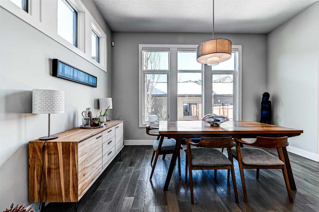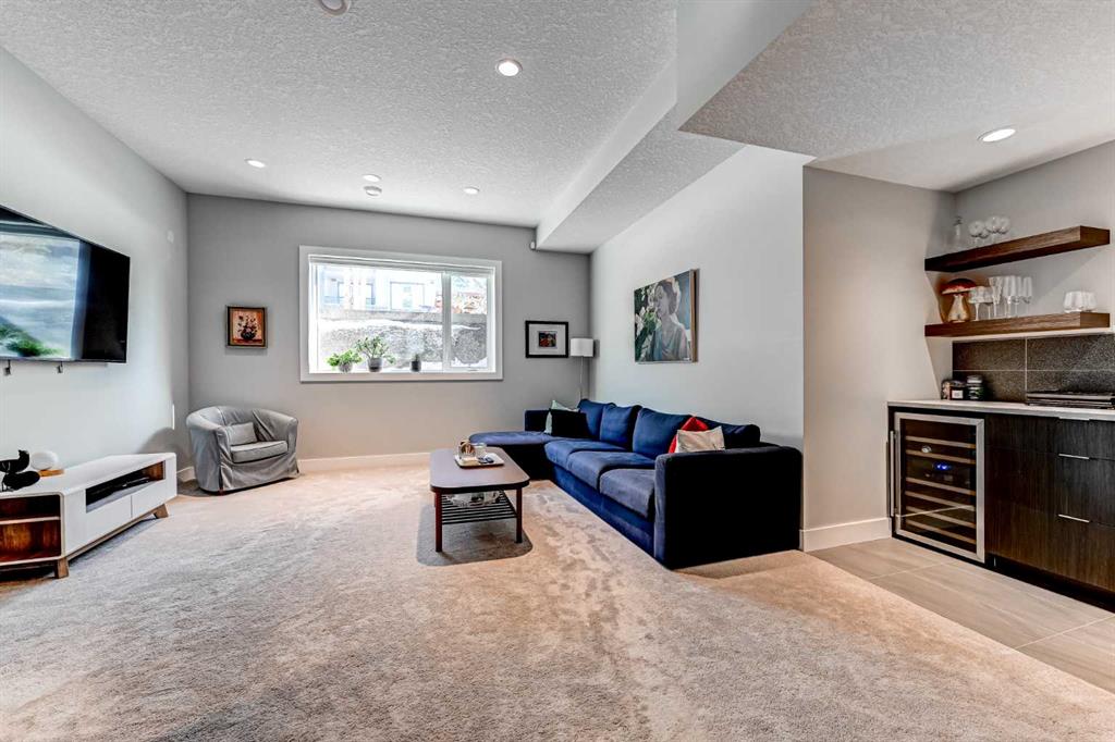 Upstairs, the primary retreat offers generous proportions and a serene ambiance, highlighted by grand east-facing windows and a custom walk-in closet complete with built-in shelving, drawers, and cabinetry. The spa-inspired ensuite features heated tile floors, a contemporary dual vanity with abundant storage, a curb-less glass shower with full-height tile, and a freestanding soaker tub — creating the ultimate space to unwind. The fully developed basement continues the home’s spacious feel with 10-foot ceilings, a custom media wall, and a full wet bar with built-in cabinetry, sink, and bar fridge — ideal for entertaining. Outside, enjoy a private fenced yard with a patio and detached garage, offering both comfort and convenience. Additional highlights include Built-in air conditioning, High-efficiency furnace with humidifier, 75-gallon hot water tank, Rough-in for radiant in-floor heating in the basement, Central vacuum system and Security system. Currie Barracks is a dynamic, award-winning master-planned community known for its pedestrian-friendly streets, urban gardens, and beautifully connected pathways. Residents enjoy nearby amenities including The Inn on Officers’ Garden — home to dining, craft beverages, a café, and local favorites — along with convenient access to Glamorgan Shopping Centre (Glamorgan bakery), Marda Loop, and Mount Royal University. Downtown Calgary is just minutes away, making this location as practical as it is prestigious. With nearby parks, including Currie Bark Park and Airplane Park, plus proximity to top schools, this exceptional home offers an unmatched lifestyle in one of Calgary’s most sought-after communities.