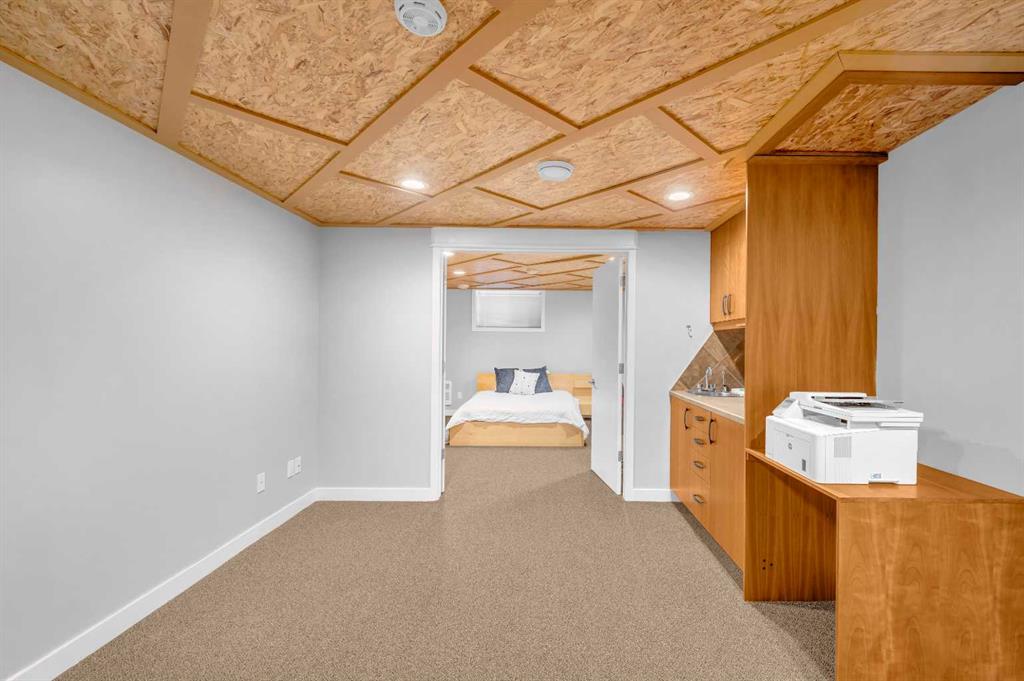The home includes two bedrooms and a master retreat with a vaulted ceiling in the addition, which features a large built-in wall closet and a private ensuite with a spacious tiled shower, granite countertops, and a low-flush toilet. The main floor also offers a large living room, dining room, and ample closet space. Relax by the gas fireplace in the basement rec room, which includes a wet bar area. A large fourth bedroom with a spacious built-in wall closet and another beautiful four-piece bathroom with a jetted soaker tub large enough for two, a low-flush toilet, heated tile floors, and an oversized tiled shower complete the basement. The basement offers versatile options, suitable for additional living space or as a reconfigurable basement suite(illegal), with a kitchen area already in place, including a refrigerator, cabinets, and sink.