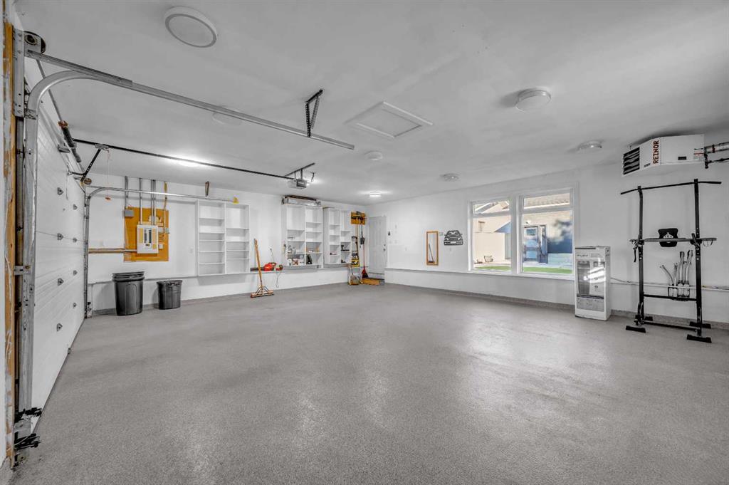 The property also includes an oversized double-car garage (25’x28’) built in 2002, accommodating three vehicles, featuring epoxy flooring (2016), full insulation, heating with 220 wiring, and two additional outdoor paved parking stalls with paved back alley access, along with a matching custom-built, oversized shed in the backyard. A must view property.