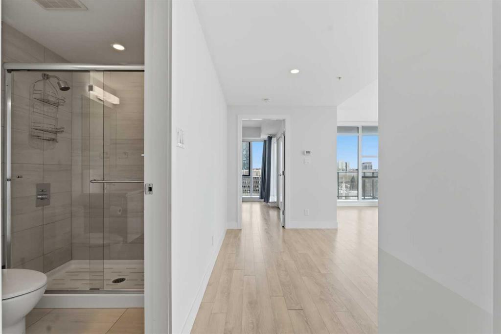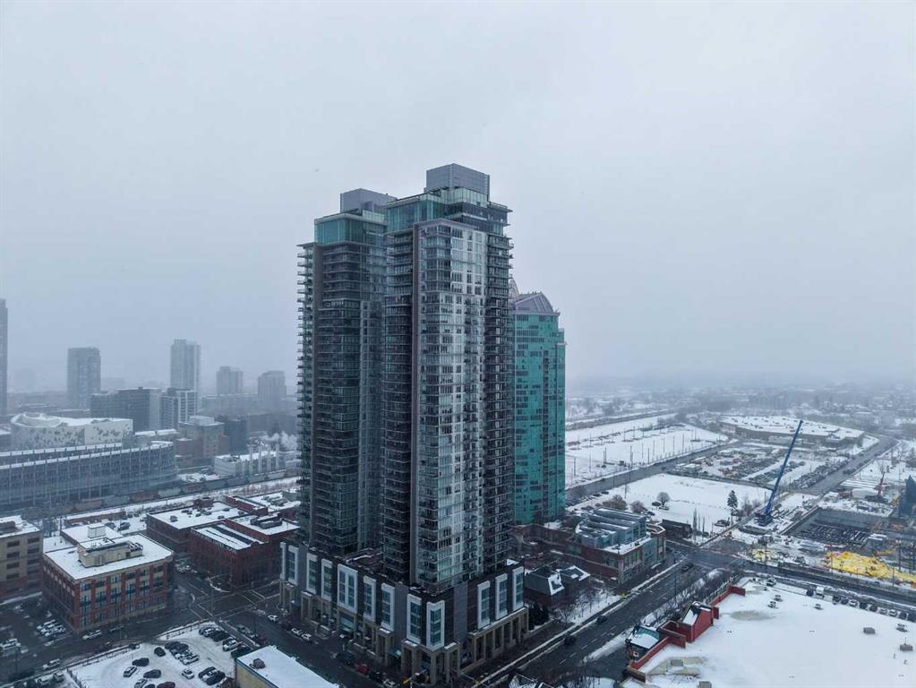 VACANT FOR QUICK POSSESSION | 2 BEDROOMS AND 2 BATHROOMS | END UNIT WITH INCREDIBLE PANORAMIC VIEWS | TITLED UNDERGROUND PARKING | FULL-HEIGHT WINDOWS THROUGHOUT | SOPHISTICATED AMENITY-RICH BUILDING IN AN ULTRA-CHIC URBAN LOCATION | This end unit in the Guardian building pairs modern design with a bright, elevated setting and a layout that enhances privacy and everyday comfort. Fresh paint in a soft neutral palette creates a clean backdrop for luxury vinyl plank flooring that flows through the grand open floor plan. Full-height windows draw in extensive natural light and frame unobstructed views of the city and surrounding skyline, enriching daily living with an ever-changing landscape. A contemporary kitchen anchors the main living area with quartz countertops, sleek cabinetry, refined backsplash detailing and a centre island that encourages gathering with friends. The adjacent living space sits against a dramatic corner window configuration that enhances the sense of openness and offers a relaxing place to unwind. Patio sliders lead to a covered balcony with glass railings that preserve the views, transforming this outdoor space into an appealing setting for morning coffee, summer barbeques or quiet evenings at home. The elegant primary bedroom includes chic wallpaper, floor-to-ceiling windows and a crisp 4-piece ensuite for comfort and convenience. A thoughtful split-bedroom design places the second bedroom on the opposite side of the main living areas, improving privacy for guests, roommates or a home office. This second bedroom is generously sized with its own floor-to-ceiling window and easy access to the second bathroom. In-suite laundry and titled underground parking add everyday practicality. Residents enjoy access to an impressive selection of amenities including a concierge (no more lost packages!), a fully equipped fitness centre, yoga studio, workshop and an expansive garden terrace with BBQ, fire pit and multiple seating areas. The attached lounge, ideal for hosting, offers a full kitchen, 2 TVs, ping pong table and inviting seating arrangements. Exceptional walkability places the C-Train station, Stampede Park, the casino, Repsol Centre, East Village paths and a wide variety of award-winning restaurants and vibrant 17th Ave destinations mere steps away, enriching your lifestyle with unmatched urban convenience!