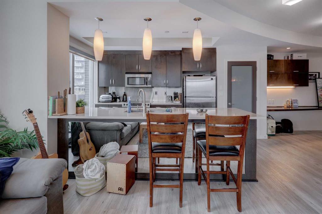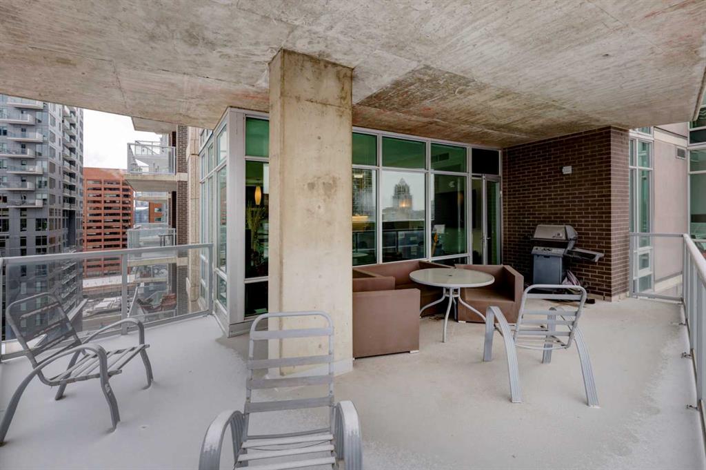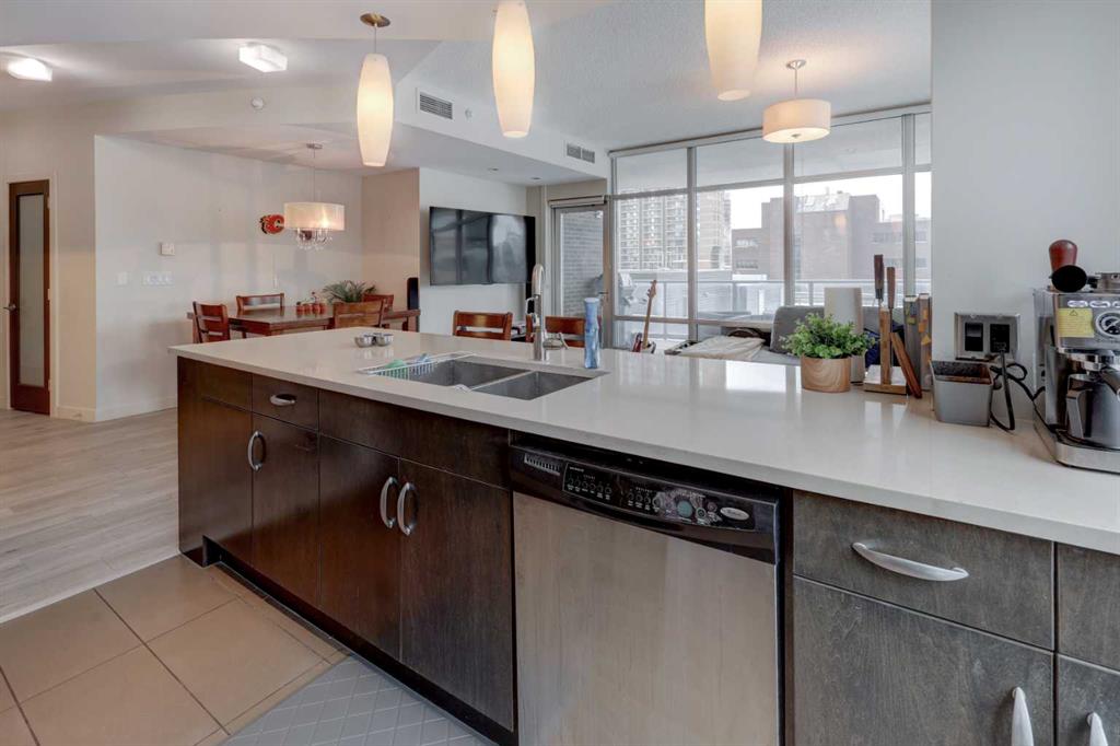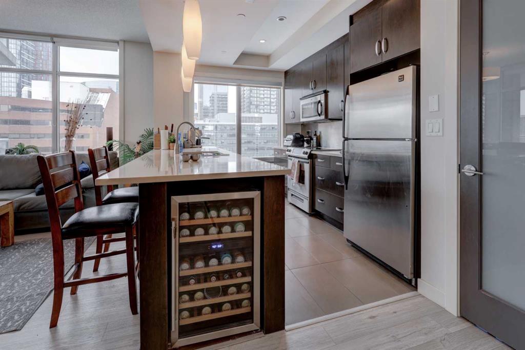 Welcome to this beautiful, modern 2 bedroom, 2 bathroom Premium Beltline condo featuring panoramic views to the north & west and titled parking stall and storage unit. Spanning 1,116 sqft, the sophisticated corner layout is framed by floor-to-ceiling windows capturing sweeping sunset, mountain and city skyline views. A huge, almost 300 sqft patio, is an entertainer’s dream, ideal for summer barbeques, morning coffee or evening cocktails under Calgary’s glowing skies. Inside we have a sleek open-floorplan with luxury vinyl plank and tile flooring throughout, quartz kitchen countertops, 9 ft ceilings, stainless steel appliances, a wine fridge and convenient office/study corner with built-in desk and cabinets. The kitchen overlooks the living area with spacious countertop and cabinet space, pantry and stainless steel appliances. The serene primary suite features a generous walk-in closet and spa-inspired ensuite with dual sinks, while the second bedroom offers ideal flexibility for guests, roommates or a home office with its own access to a full bathroom. In-suite laundry and central A/C are an added bonus. Castello is one of Calgary’s premier executive buildings, offering residents a fitness centre, guest suite, concierge services, car wash, bike rack area and pets are welcome (with restrictions). Perfectly located in the heart of the Beltline, you’re steps from 17th Ave and 4th Street restaurants, shops and vibrant nightlife.