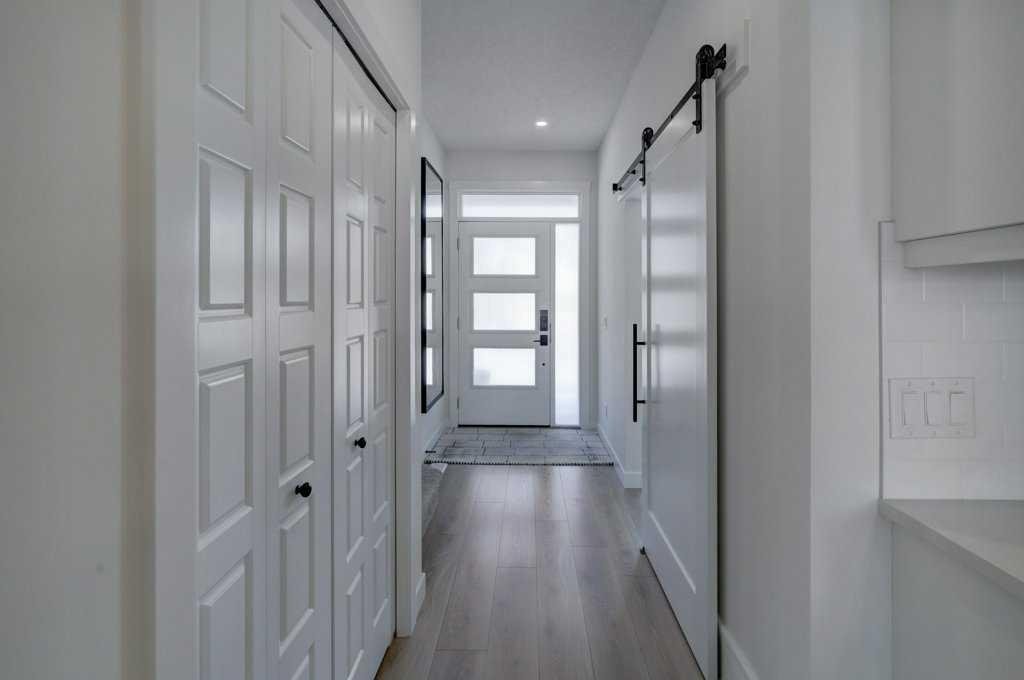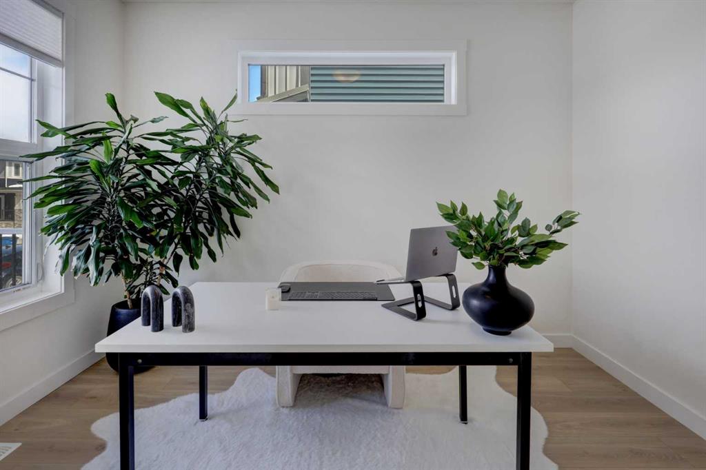Step inside to a bright, open main floor with 9′ ceilings and a layout that brings people together. The kitchen sits at the center, finished with quartz countertops, stainless steel appliances, a corner pantry, and a large island where meals, conversations, and daily routines naturally unfold. The adjoining dining and living areas create a comfortable, connected space, anchored by a warm gas fireplace and filled with natural light. A main floor office with a barn door offers a quiet place to work or focus, along with a convenient 2-piece bathroom.