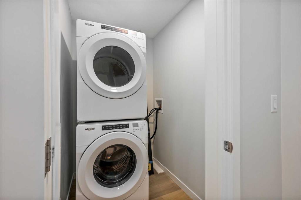 The primary bedroom boasts high ceilings and a beautiful outlook, while the second bedroom provides flexible space for guests, a home office, or additional living needs. A well-appointed full bathroom features quartz countertops and a tub/shower combination, complemented by the convenience of in-suite laundry.