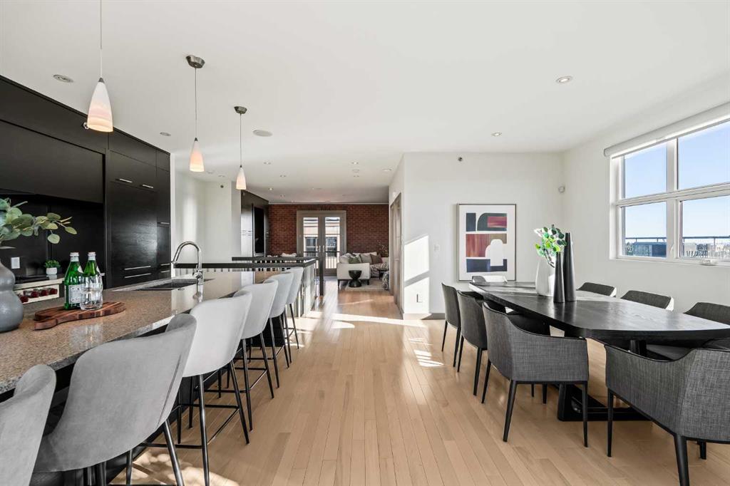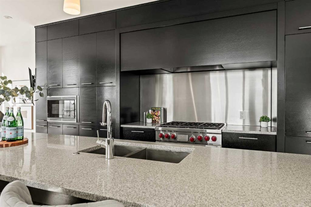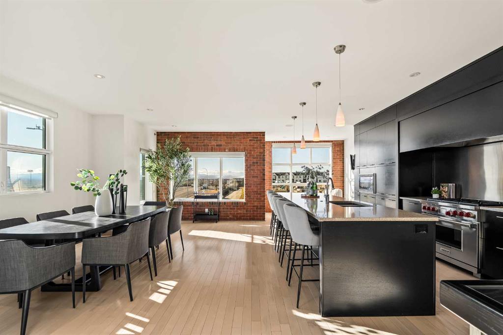 The top floor is designed for both entertaining and relaxation, featuring a stunning family room with an electric fireplace, an expansive dining area, and a second chef-inspired kitchen complete with premium appliances including Sub-Zero, Wolf, and Miele. Beautiful exposed brick adds warmth, character, and a timeless architectural element, creating a striking backdrop that elevates the entire space. Large windows frame the sweeping mountain views and capture sunlight throughout the day thanks to the home’s east south west exposure.