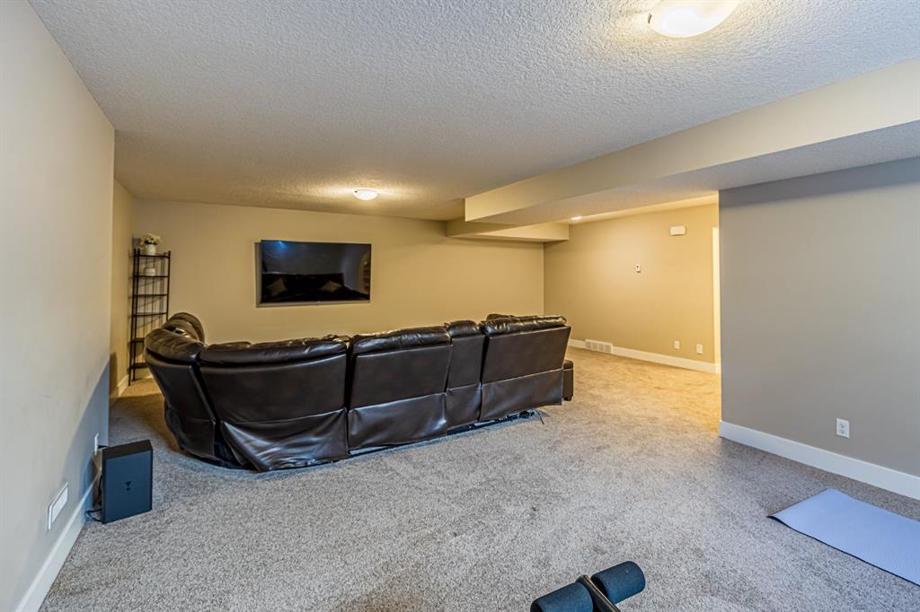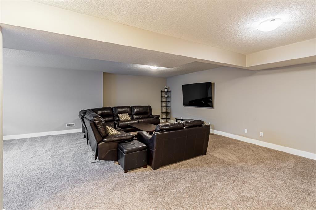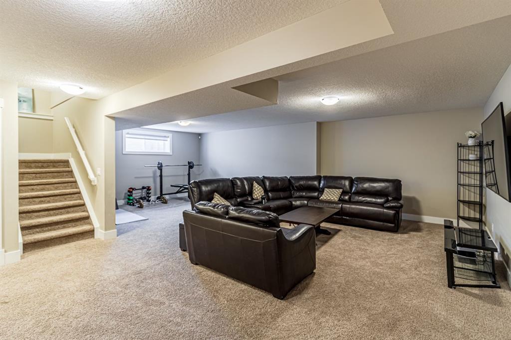 Fully finished basement professionally developed by the builder, complete with rough-in for a future kitchen or wet bar