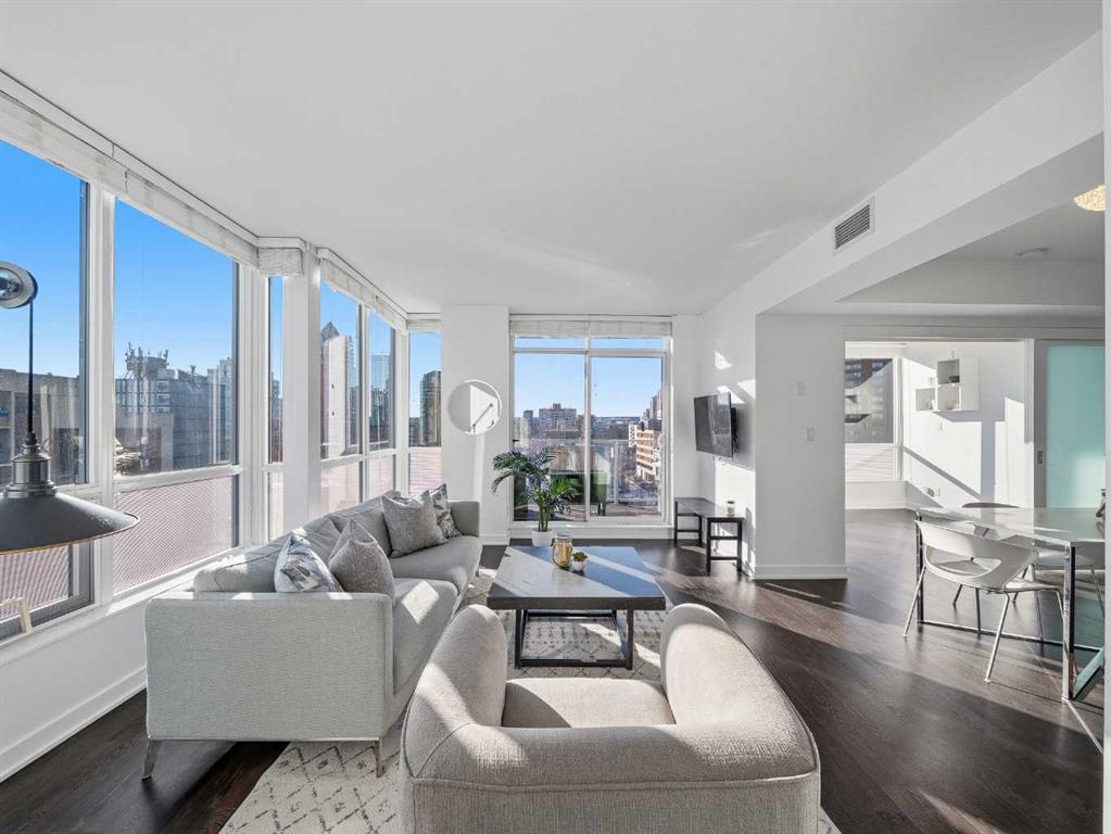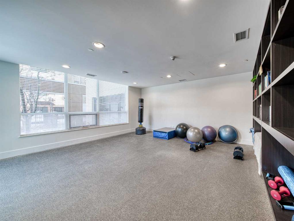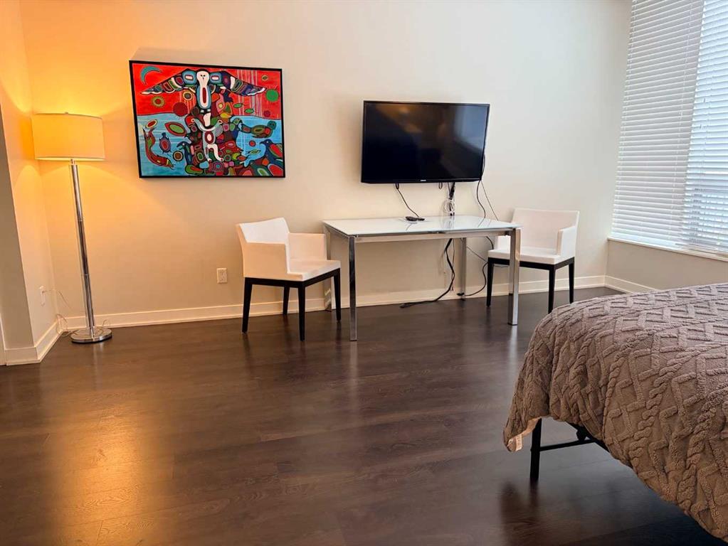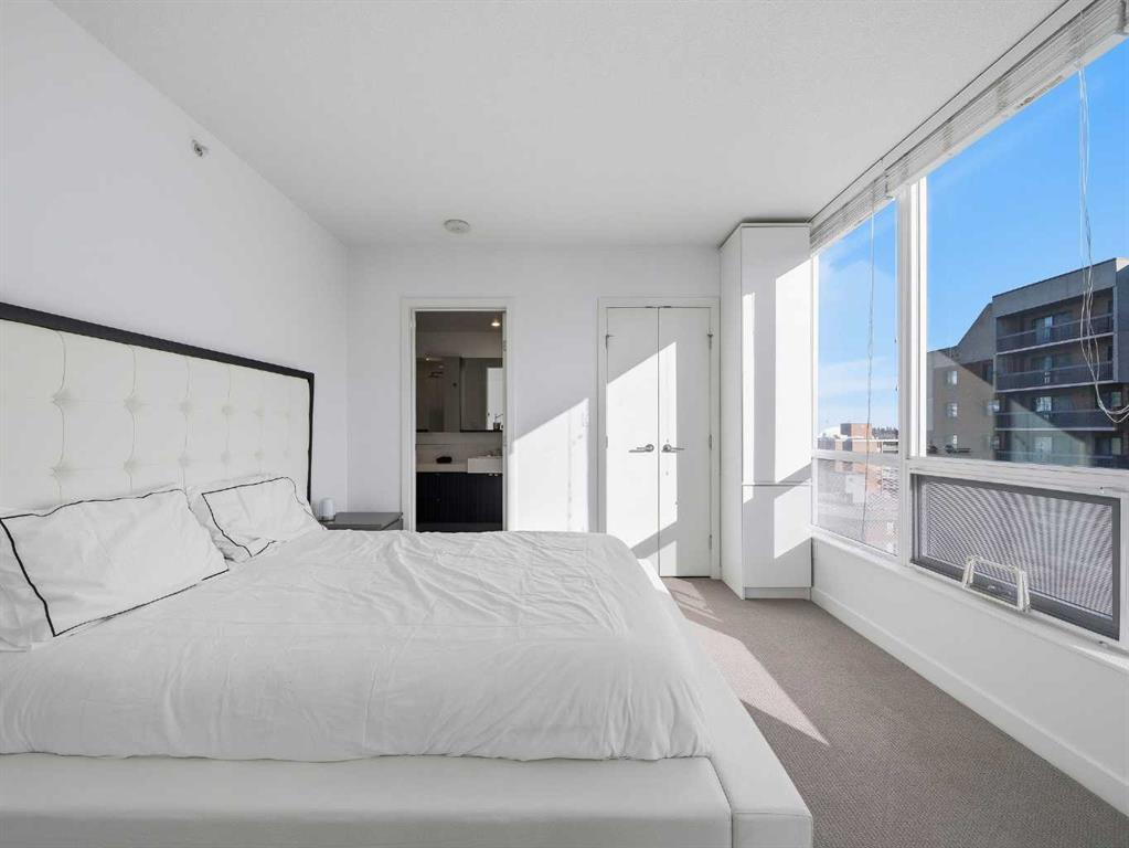 The second bedroom features floor-to-ceiling windows and can serve as a guest room or office. Flooring includes laminate throughout, carpet in the primary bedroom, and tile in both bathrooms.The balcony offers excellent city views and enough space for a patio set, with barbecues permitted. Additional features include in-unit storage near the entrance, a same-floor storage locker, and a titled heated underground parking stall. The building also provides heated visitor parking and bicycle storage, with convenient 2-hour street parking out front. Building amenities include a fitness centre, yoga studio, guest suite (available for $75/night), and concierge from Tuesday through Saturday for deliveries and added security and convenience. A well-designed, quiet, and spacious unit in one of downtown Calgary’s most desirable buildings.