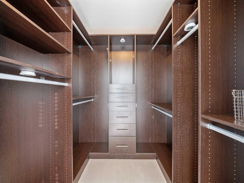 The primary bedroom includes a custom walk-in closet plus an additional built-in for extra storage. The ensuite bathroom has dual sinks, a tiled shower, and a soaker tub. The second bathroom includes a tiled shower, stone countertop vanity, and the in-suite stacked washer and dryer.