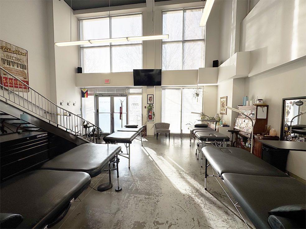 The open-concept main floor features dramatic double-height windows, filling the space with natural light and creating an inviting atmosphere. The flexible layout is ideal for retail, office, or professional services. A bright mezzanine-level office overlooks the main floor, providing an open, connected workspace perfect for administrative or consulting use.