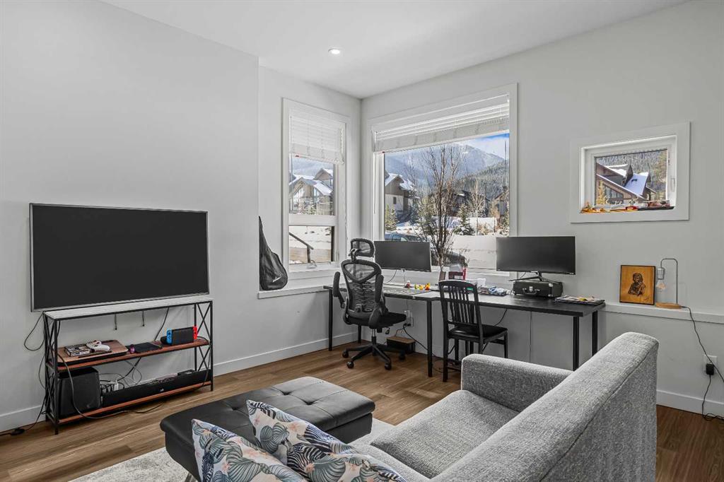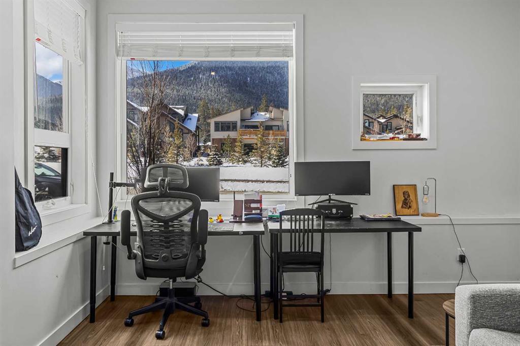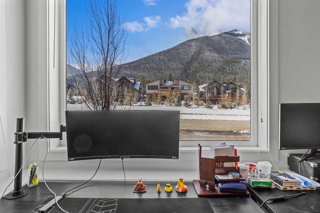 A standout feature of this home is the flexible workspace positioned beside oversized windows, creating a bright and inspiring area for working from home while enjoying views of the surrounding peaks.