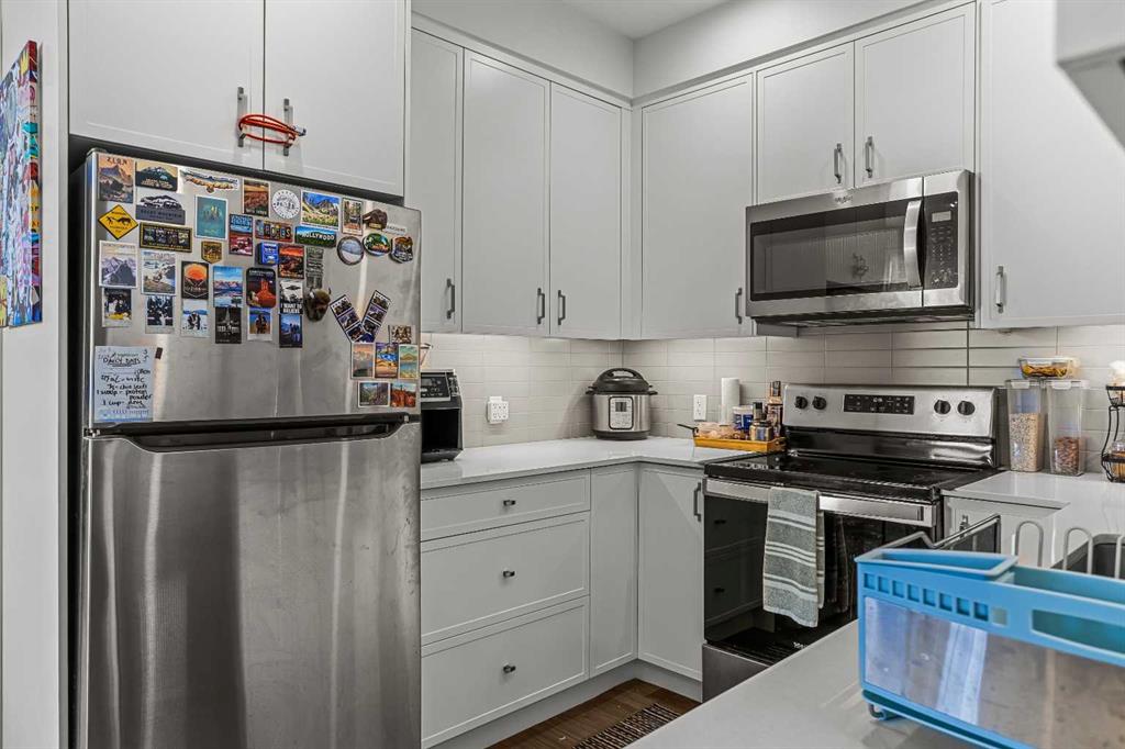 The modern kitchen offers clean contemporary finishes including quartz countertops, stainless steel appliances, full-height cabinetry, and a stylish tile backsplash. Its efficient design provides excellent storage and workspace while maintaining an open connection to the living area—ideal for both everyday living and entertaining.