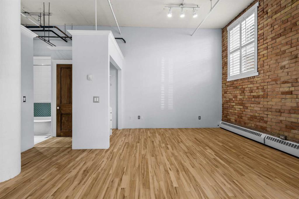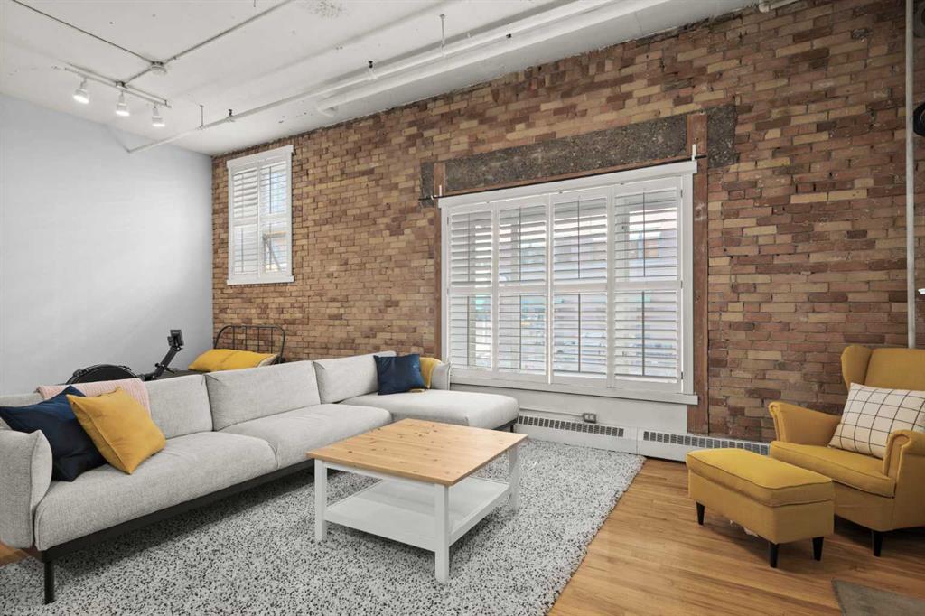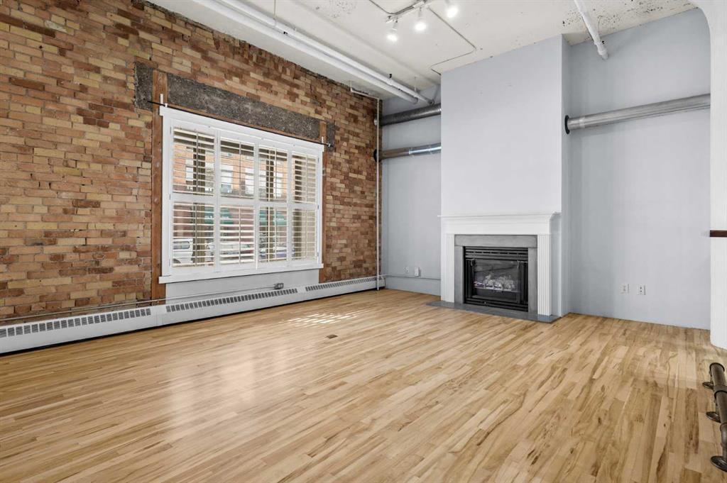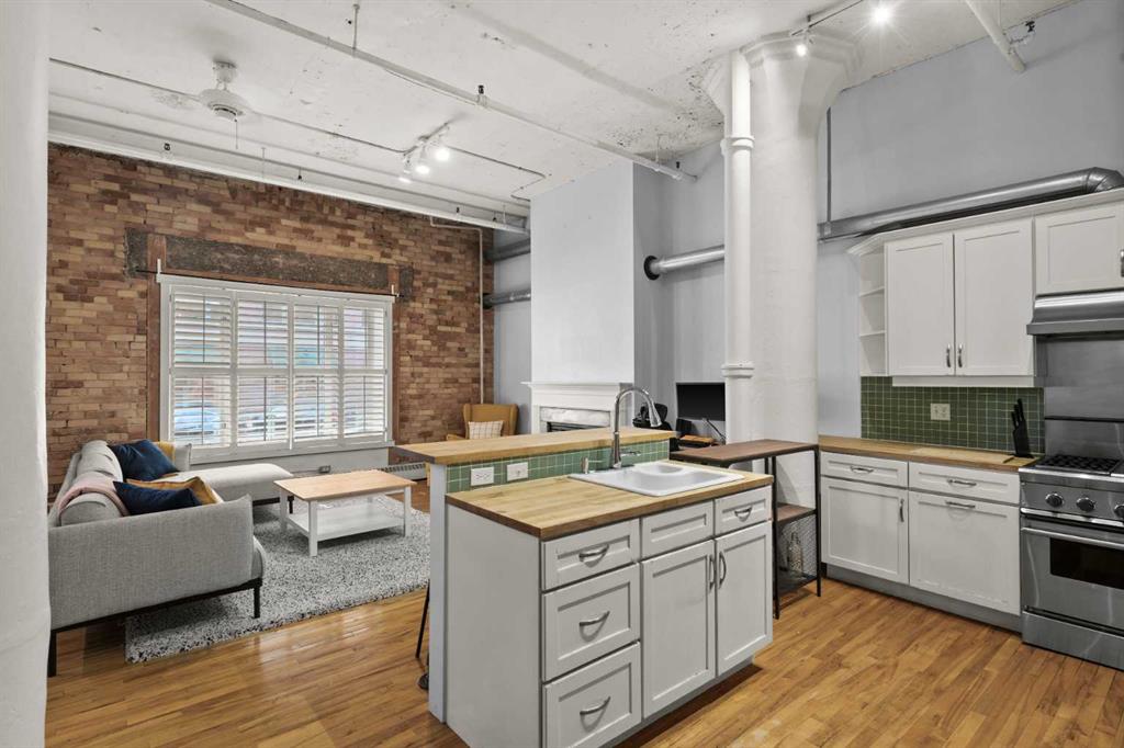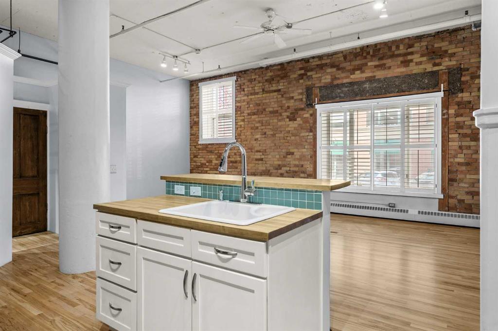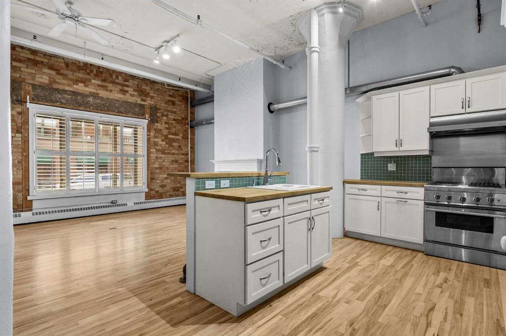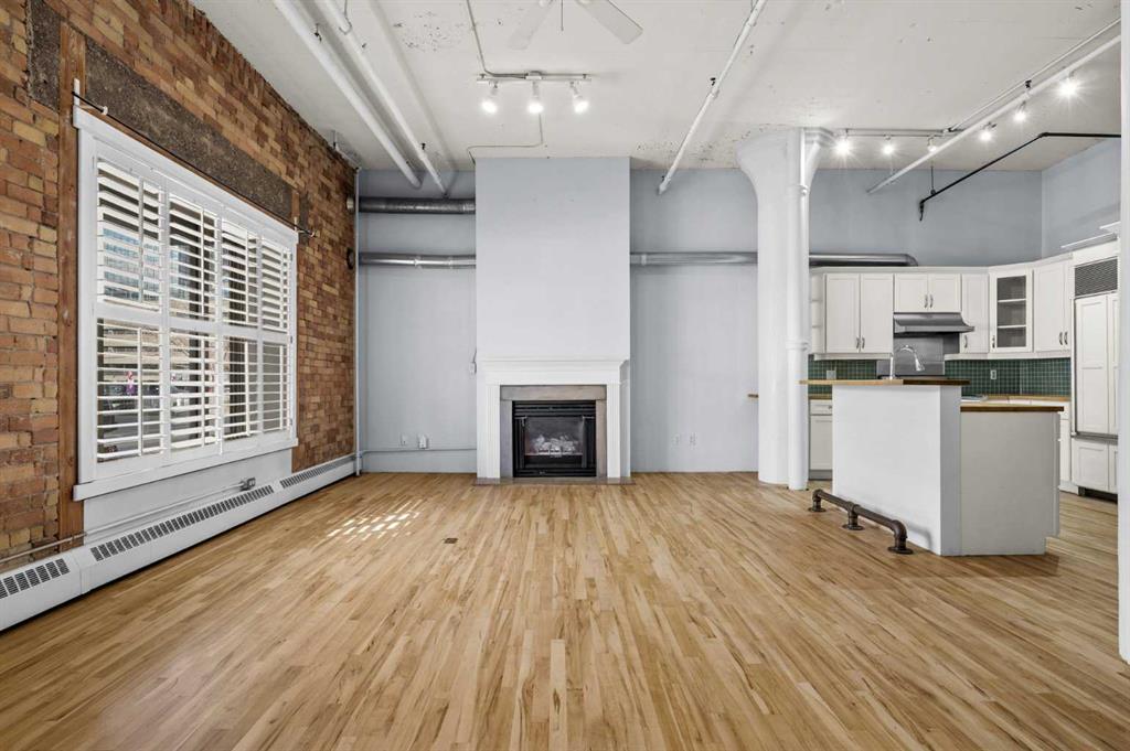 Welcome to the Lewis Loft Building, a historic gem nestled in the vibrant Beltline district of Downtown Calgary. This stunning unit boasts an open layout that seamlessly combines modern luxury with vintage charm. Hardwood floors and soaring high ceilings complement the exposed brick walls, creating an inviting and spacious atmosphere. The kitchen features stainless steel appliances, gas range, and striking butcher block countertops. A breakfast bar and ample cupboard space make this kitchen as functional as it is stylish. The living room is a cozy retreat with a large window that floods the space with natural light and a gas fireplace that adds a touch of warmth and elegance. Convenience is key with in-suite laundry, underground heated parking ( #45), and an additional storage locker (#56). Note the exceptional roof top retreat/patio area just one floor above. Attention to detail and meticulous care of this unit includes … Floors – repaired, sanded and refinished (January), ceiling painted (March), unit painted (2022), cabinets refinished (2024), wash/dryer (2022).