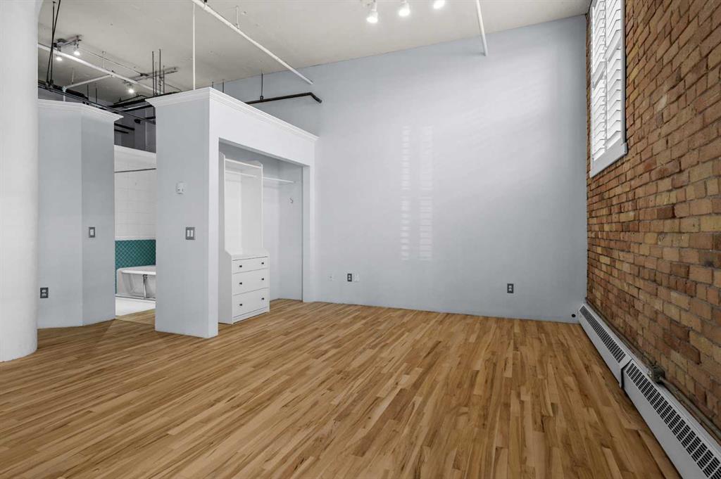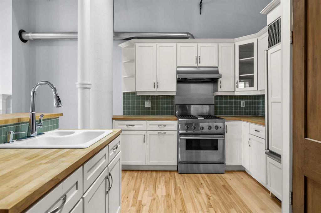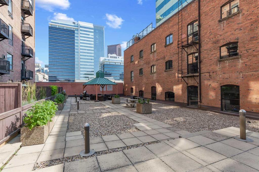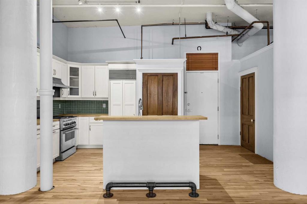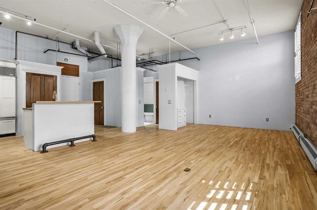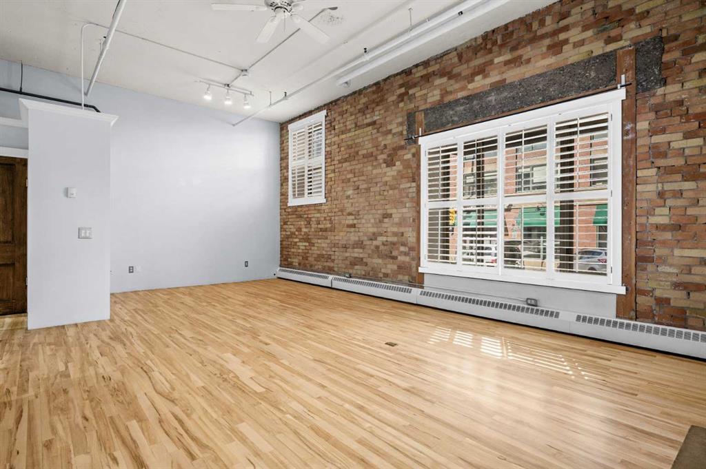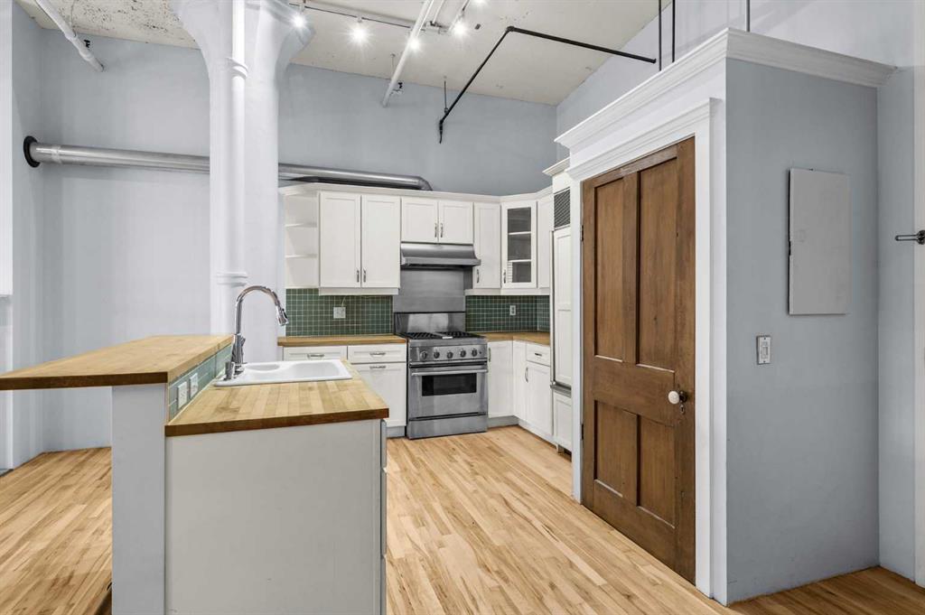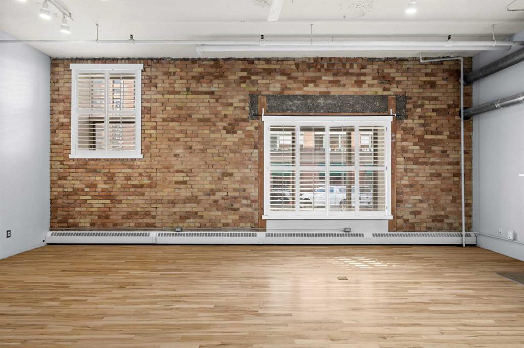 Welcome to the Lewis Loft Building, a historic gem nestled in the vibrant Beltline district of Downtown Calgary. This stunning unit boasts an open layout that seamlessly combines modern luxury with vintage charm. Hardwood floors and soaring high ceilings complement the exposed brick walls, creating an inviting and spacious atmosphere. The kitchen features stainless steel appliances, gas range, and striking butcher block countertops. A breakfast bar and ample cupboard space make this kitchen as functional as it is stylish. The living room is a cozy retreat with a large window that floods the space with natural light and a gas fireplace that adds a touch of warmth and elegance. Convenience is key with in-suite laundry, underground heated parking ( #45), and an additional storage locker (#56). Note the exceptional roof top retreat/patio area just one floor above. Attention to detail and meticulous care of this unit includes … Floors – repaired, sanded and refinished (January), ceiling painted (March), unit painted (2022), cabinets refinished (2024), wash/dryer (2022).