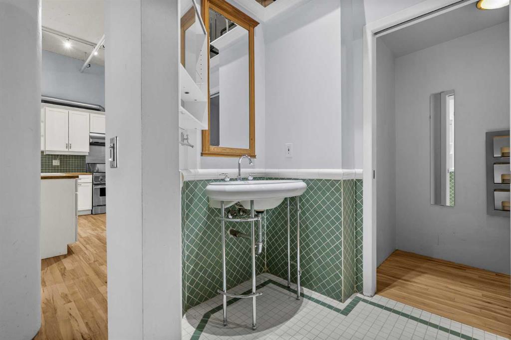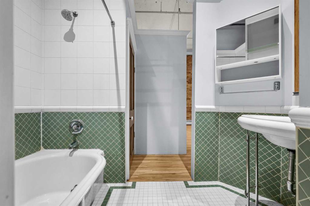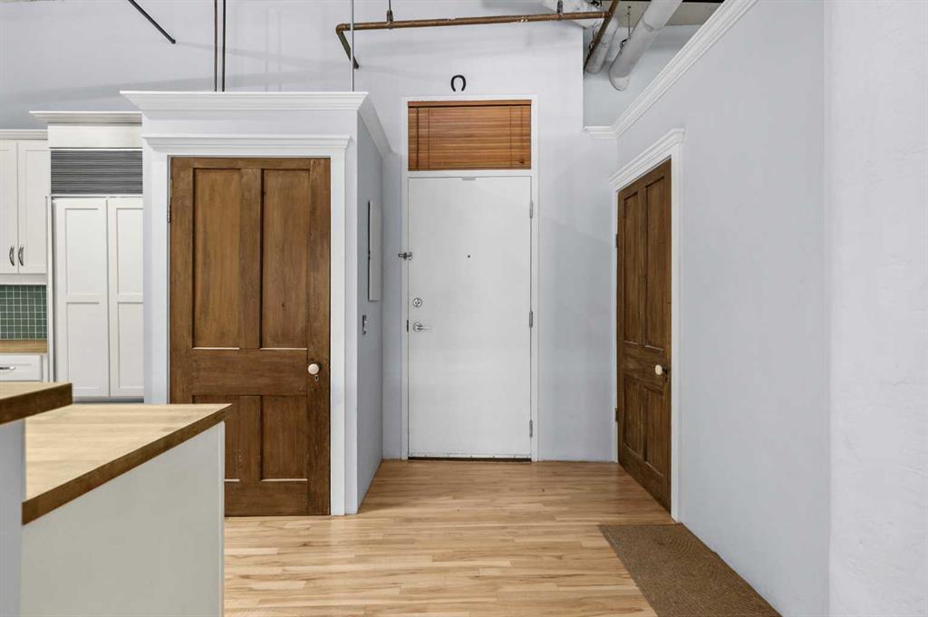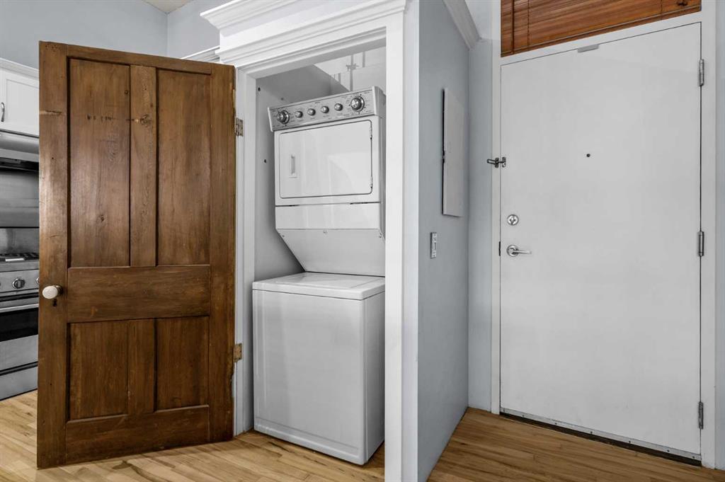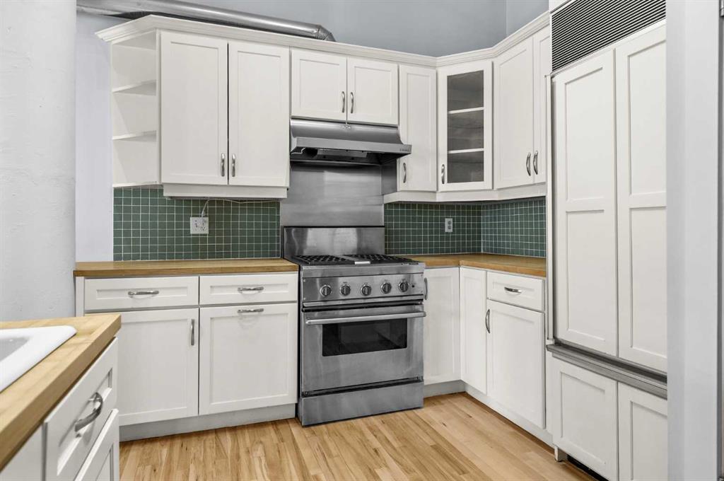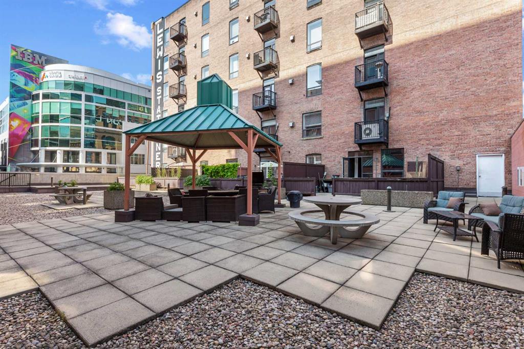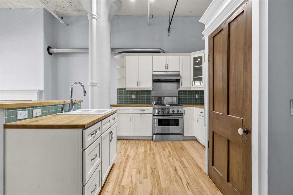 Welcome to the Lewis Loft Building, a historic gem nestled in the vibrant Beltline district of Downtown Calgary. This stunning unit boasts an open layout that seamlessly combines modern luxury with vintage charm. Hardwood floors and soaring high ceilings complement the exposed brick walls, creating an inviting and spacious atmosphere. The kitchen features stainless steel appliances, gas range, and striking butcher block countertops. A breakfast bar and ample cupboard space make this kitchen as functional as it is stylish. The living room is a cozy retreat with a large window that floods the space with natural light and a gas fireplace that adds a touch of warmth and elegance. Convenience is key with in-suite laundry, underground heated parking ( #45), and an additional storage locker (#56). Note the exceptional roof top retreat/patio area just one floor above. Attention to detail and meticulous care of this unit includes … Floors – repaired, sanded and refinished (January), ceiling painted (March), unit painted (2022), cabinets refinished (2024), wash/dryer (2022).