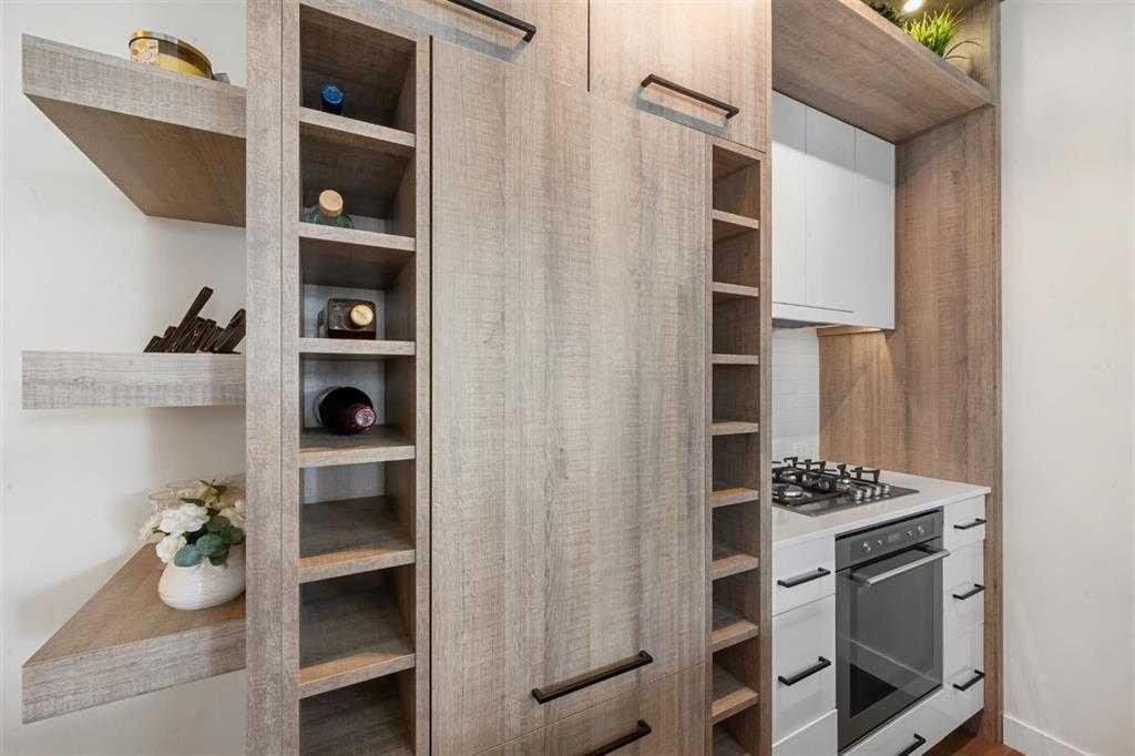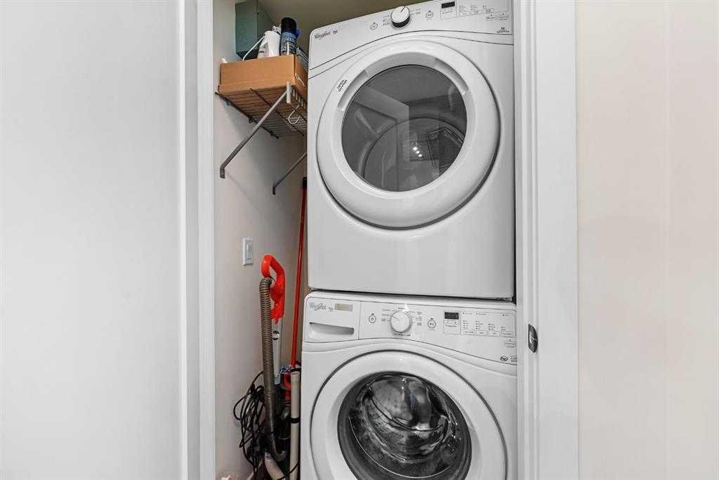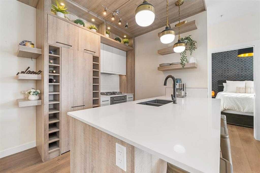 Originally the show home for the building, this condo offers an open-concept layout designed for modern living. The upgraded kitchen flows seamlessly into the living space, while brick accent walls and an enhanced lighting package add a refined, urban touch. The primary bedroom includes a walk-in closet and ensuite, and the second bedroom is generously sized and versatile. A full 4-piece second bathroom, in-suite laundry, and same-floor storage add everyday convenience.