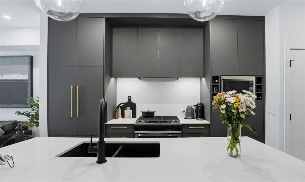 Inside, you’re greeted by a bright and airy open-concept layout, enhanced by 9 FOOT CEILINGS, expansive windows with custom window coverings, and a seamless flow designed for both relaxing and entertaining. The contemporary kitchen is a true showpiece, featuring QUARTZ COUNTERTOPS, full-height soft-close cabinetry, integrated panelled appliances, a gas range, stylish pendant lighting, and a generous island ideal for casual dining or hosting guests.
