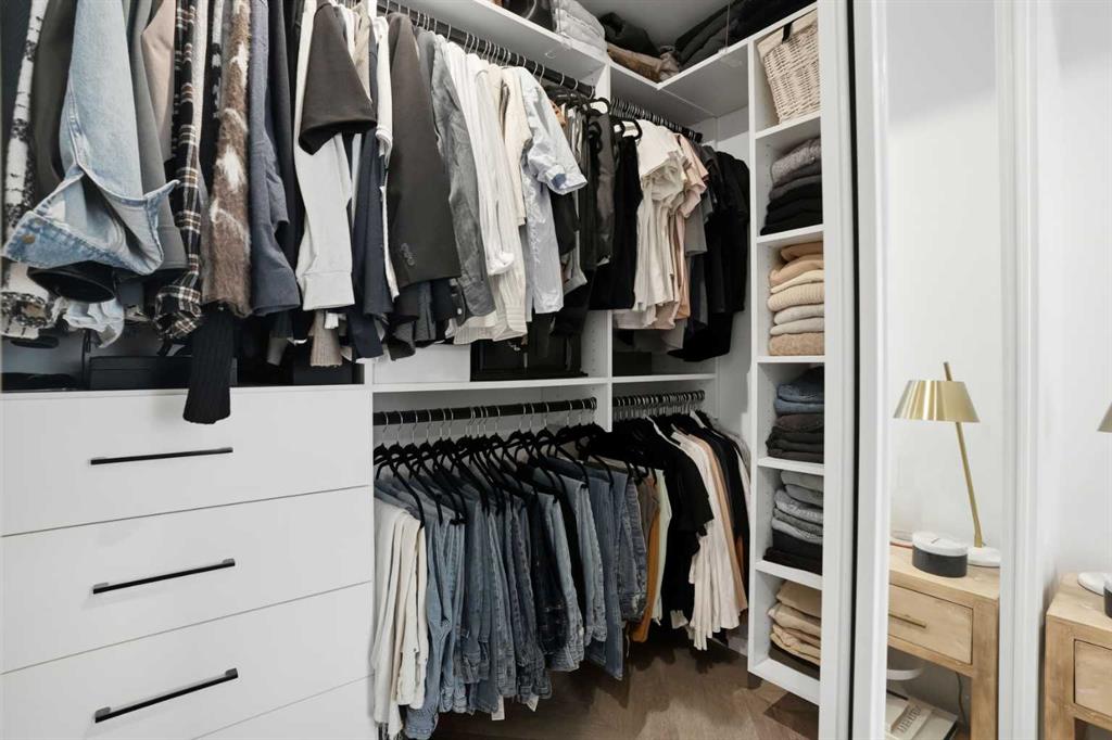 Both bedrooms are well-sized and flexible, easily accommodating a home office, guest space, or personal retreat. Thoughtfully UPGRADED CALIFORNIA CLOSETS provide smart storage solutions with warranty remaining. The bathroom is finished with sleek tilework and modern fixtures, while full size in suite laundry adds everyday convenience. Durable luxury vinyl plank flooring runs throughout, tying the space together with a clean, modern feel.