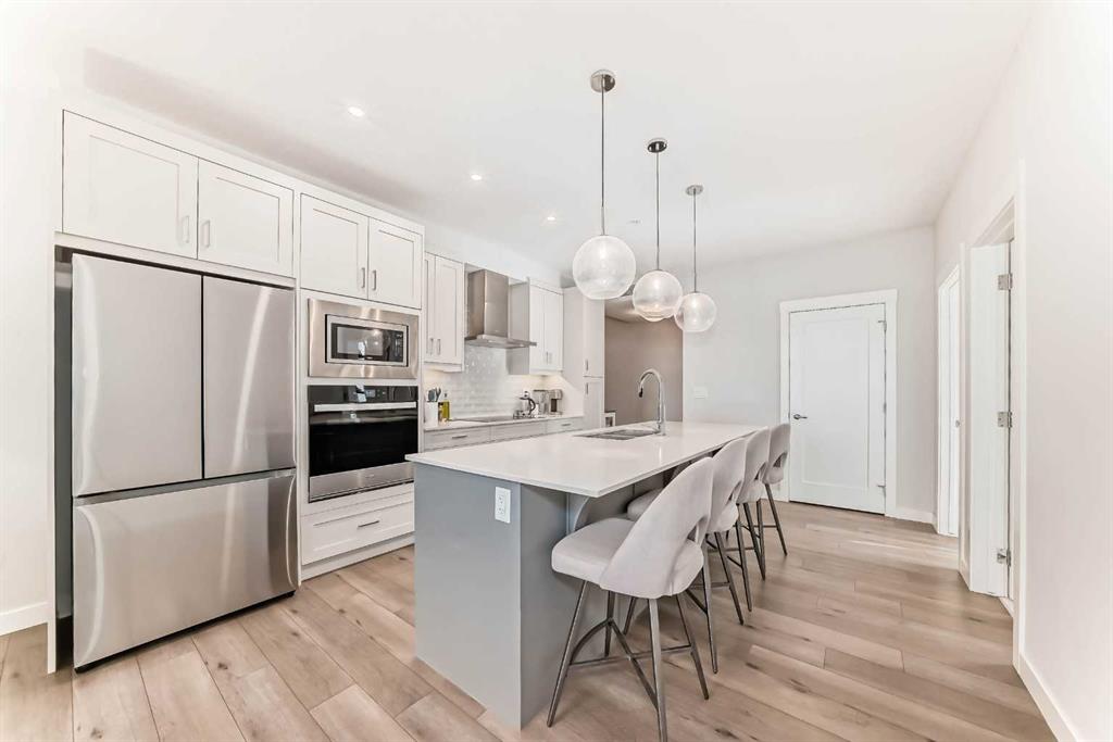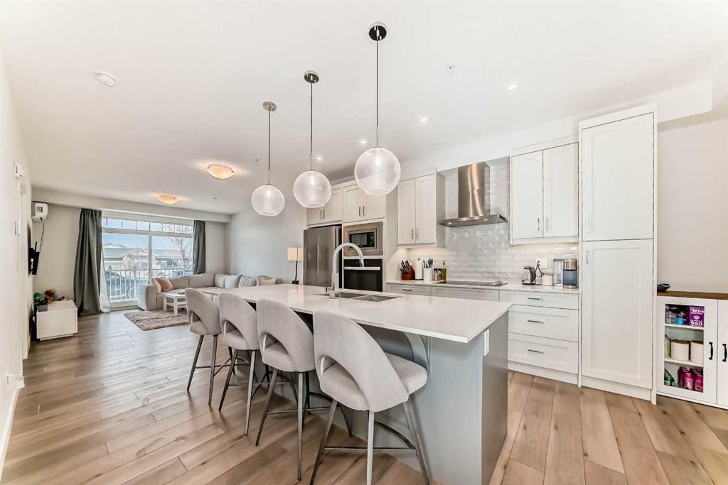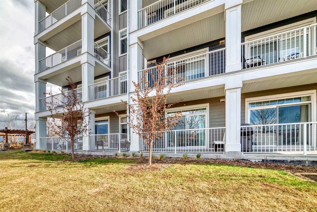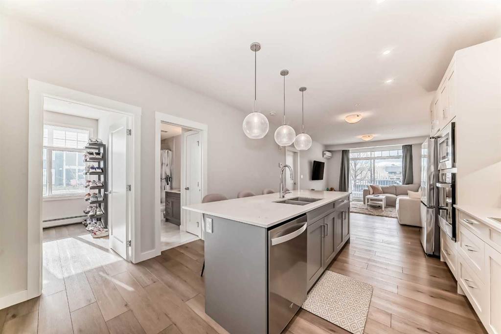 Welcome home to this IMMACULATE ground floor corner unit that features TWO bedrooms, TWO bathrooms, TWO parking stalls, A/C, and just under 1000 sq ft! Wide open floor plan on this beautiful unit and the proximity to ALL of the amenities is hard to beat…close to EVERYTHING! Hospital, the LAKE, VIP Theatre, numerous bars, restaurants, shops, YMCA, parks, playgrounds, transit, school and so much more! As you enter this home you have a small hallway that leads to the living space with the amazing kitchen being the focal point of this one and has quartz countertops, gorgeous white cabinets, built in wall oven and microwave, upgraded lights, large island and gorgeous tiled backsplash. As you move into the living room there is plenty of space for a sectional couch and other furniture and has the sliding doors to access the large balcony/patio! The primary bedroom is drenched in natural sunlight (3 windows!) and has a full spa inspired ensuite bathroom with floor to ceiling tile, quartz countertop and there is also a walk in closet! The 2nd bedroom is a good size as well and has access to the 2nd full bathroom (cheater ensuite) You will also LOVE the A/C, tandem parking stall, extra storage locker, in suite laundry room with a bit of extra storage, central courtyard, ground floor corner unit and the location is gonna be hard to beat! This home still looks BRAND NEW! Please come and have a look if you love beautiful condos in amazing communities!