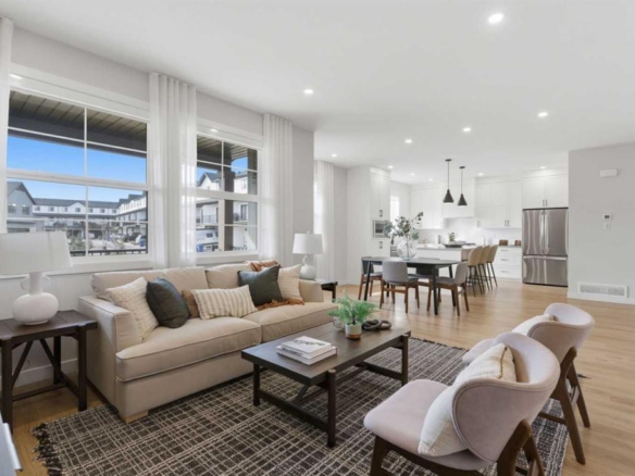 Welcome to 1047 Bayview Crescent, a beautifully designed street-side luxury townhome with NO CONDO FEES! This interior Jasper townhome features an attached double garage, a rooftop patio, and low-maintenance living. The tastefully designed home offers over 1400 sq ft. of above-grade living space plus an unfinished basement with 9′ ceilings, ready for your design ideas. On the main floor, you will find soaring ceilings in the open-concept living space and large windows that let natural light flow through. The chef-inspired kitchen offers beautiful cabinetry and stone countertops and is well-equipped with stainless steel appliances. The kitchen is open to the dining and living room, perfect for entertaining family and friends. Complimenting the main floor is a convenient half bath, storage and entry from the attached garage. Venturing upstairs, you will find a spacious primary retreat with a spa-like ensuite, a spacious shower, and a generous walk-in closet. Two additional bedrooms, a full bath, a 4-piece bath and laundry complete the upper level. Outside, enjoy time on your upper south-facing rooftop patio, which is situated above the garage. Bayview is a beautiful community with parks, benches and pathways that meander throughout the community and along the canals. Kids and adults alike will enjoy the outdoor basketball nets, gym, amphitheatre, and tennis courts, which convert into a skating rink in the winter. Come and see all the amenities the community offers for yourself! *RMS has been applied to the construction drawings provided by the builder. Taxes to be assessed.