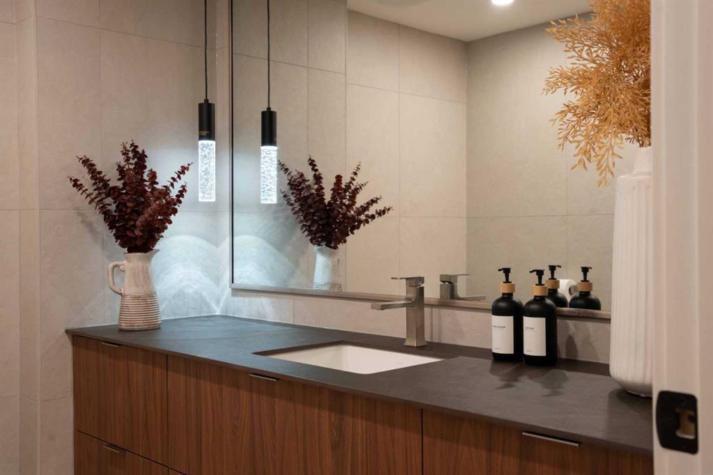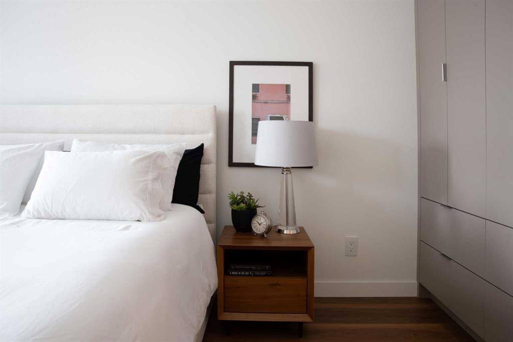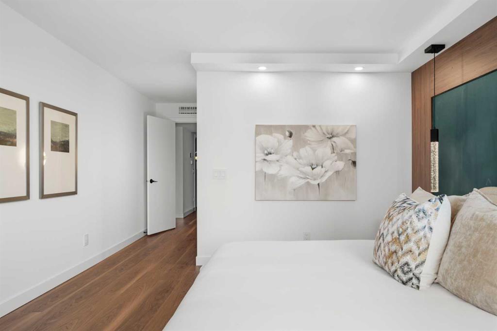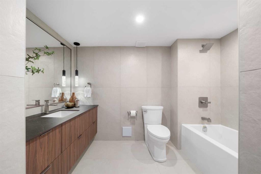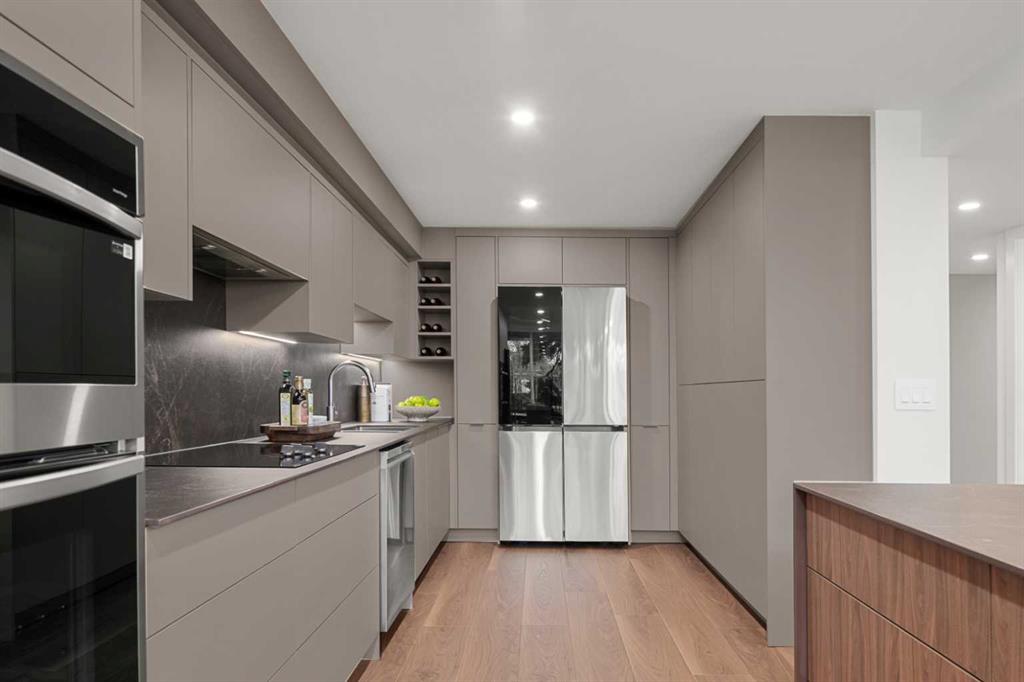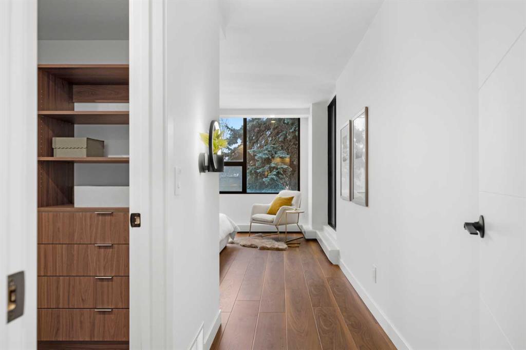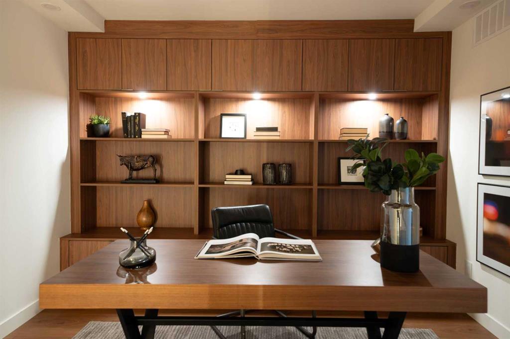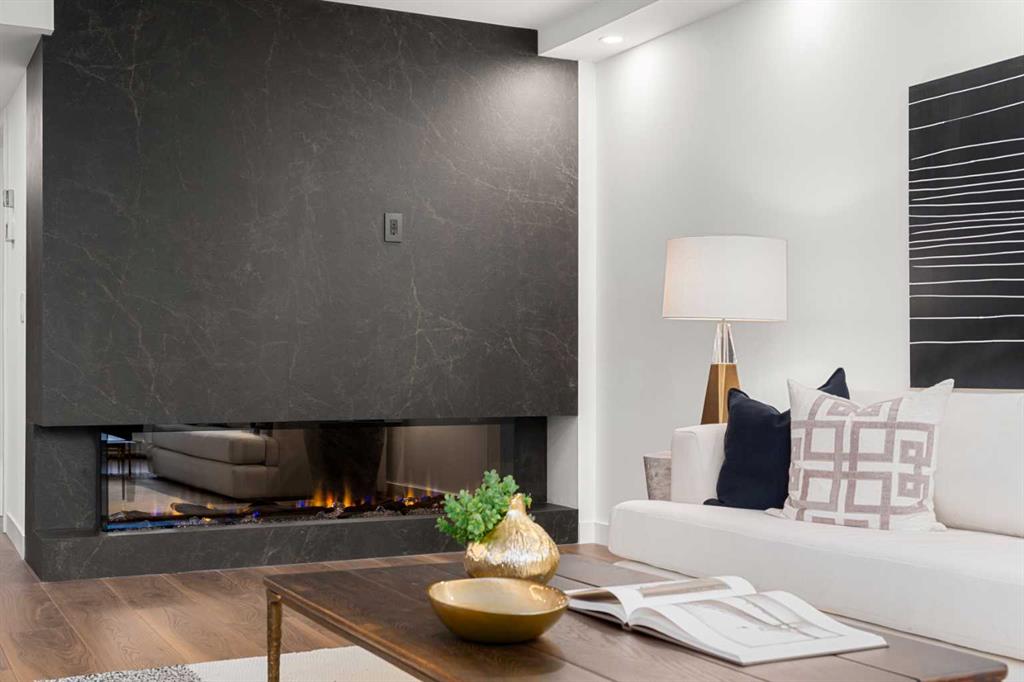 Rarely does a residence of this calibre become available—particularly one of the highly sought-after main-floor, south-facing townhomes with private yard access and river views. Recently redesigned with attention to detail, this two-level home offers the comfort and flow of a modern single-family residence, paired with the prestige and convenience of executive condo living in Roxboro House. The main floor unfolds in a bright, airy expanse framed by oversized south-facing windows that flood the space with natural light. A dramatic 74” Dimplex fireplace, wrapped in porcelain slab, anchors the living area and sets a sophisticated tone. The open-concept kitchen is a true showpiece, showcasing custom Metro cabinetry, porcelain countertops and backsplash, brand-new Samsung smart appliances, a Zephyr wine cooler, and designer Delta fixtures. Premium Coretec/HQ luxury vinyl flooring runs seamlessly throughout, while Cartwright lighting and an integrated bulkhead design elevate the architectural finish. From the living area, step directly into your private fenced yard and patio—an exceptionally rare offering in this buiilding hat delivers the ease of outdoor living within a luxury building. A beautifully appointed main-floor powder room adds both style and practicality for guests.m Upstairs, sleek glass railings lead to a striking imported wallpaper feature wall—an artful statement that reflects the thoughtful design carried throughout. At the top of the stairs, a dedicated library or home office provides a quiet, inspiring retreat, perfectly removed from the activity below. The upper level is designed with comfort and privacy in mind. The principal suite is a refined sanctuary, complete with a custom feature wall, built-in side tables, a spacious walk-in closet, and an elegantly finished ensuite with tile and glass shower. A private balcony extends from the bedroom, offering tranquil views of the Elbow River and the tree-lined streets of Rideau Park—the perfect setting for morning coffee or an evening unwind. The second bedroom also enjoys river views and features integrated custom cabinetry to maximize storage and functionality. A full bathroom is conveniently located across the hall, and the upper-level laundry area adds everyday ease and efficiency. Life here extends well beyond your front door. Residents of Roxboro House enjoy a full suite of amenities, including professional concierge service, an indoor pool and hot tub, a well-equipped fitness centre, a party room for entertaining and secure underground parking. Outside, the location is unmatched—river pathways are directly across the street; boutique shops, high-end retailers, and specialty services are all within walking distance; and groceries sit just steps from your door.