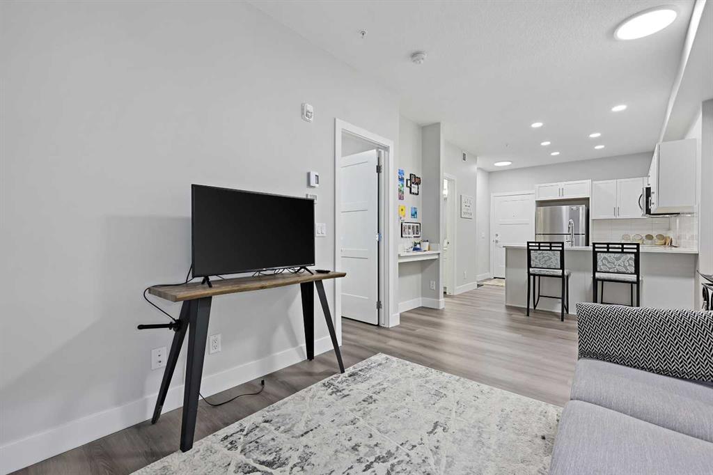 Welcome to this beautiful 1 bedroom, 1 bathroom luxury condo located in the highly sought-after community of Springbank Hill. This Cove Properties built condo is designed with both style and functionality in mind offering a bright open layout and high-quality finishes throughout. Step inside to warm luxury vinyl plank flooring that flows through the main living areas. The contemporary kitchen is as functional as it is stylish, featuring quartz countertops, crisp white cabinetry, stainless steel appliances, and ample workspace. A designated laundry room and additional storage add everyday convenience. The spacious primary bedroom is complemented by a walk-in closet with direct access to the elegant 4-piece bathroom, complete with a cheater door for added privacy and ease of use. Enjoy the outdoors on your massive ground-floor patio with a gas line, perfect for barbecuing and entertaining. This unit also comes with a titled underground parking stall and an additional storage locker. Set in an unbeatable location, you’ll appreciate being close to shopping, transit, schools, and all the amenities that make Springbank Hill such a desirable place to live.