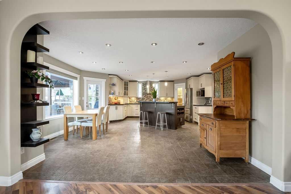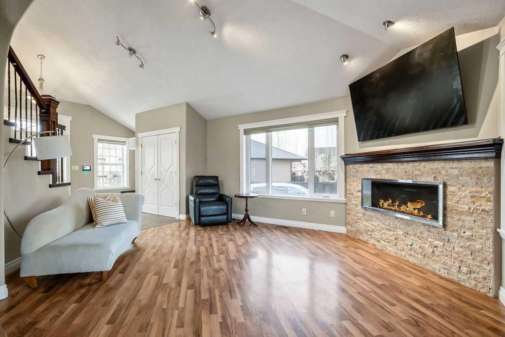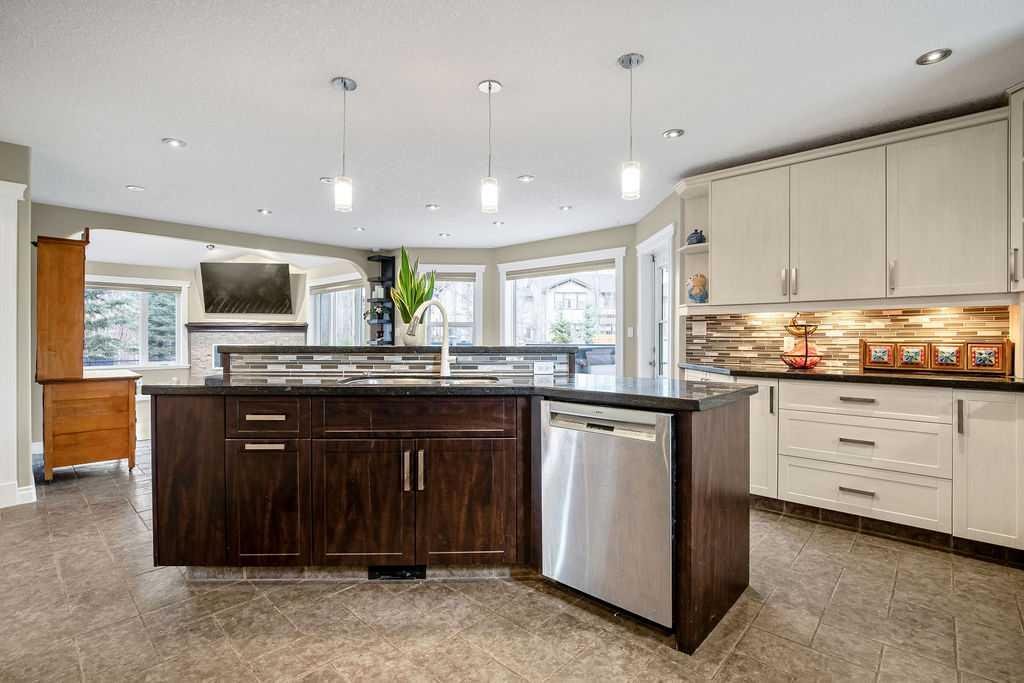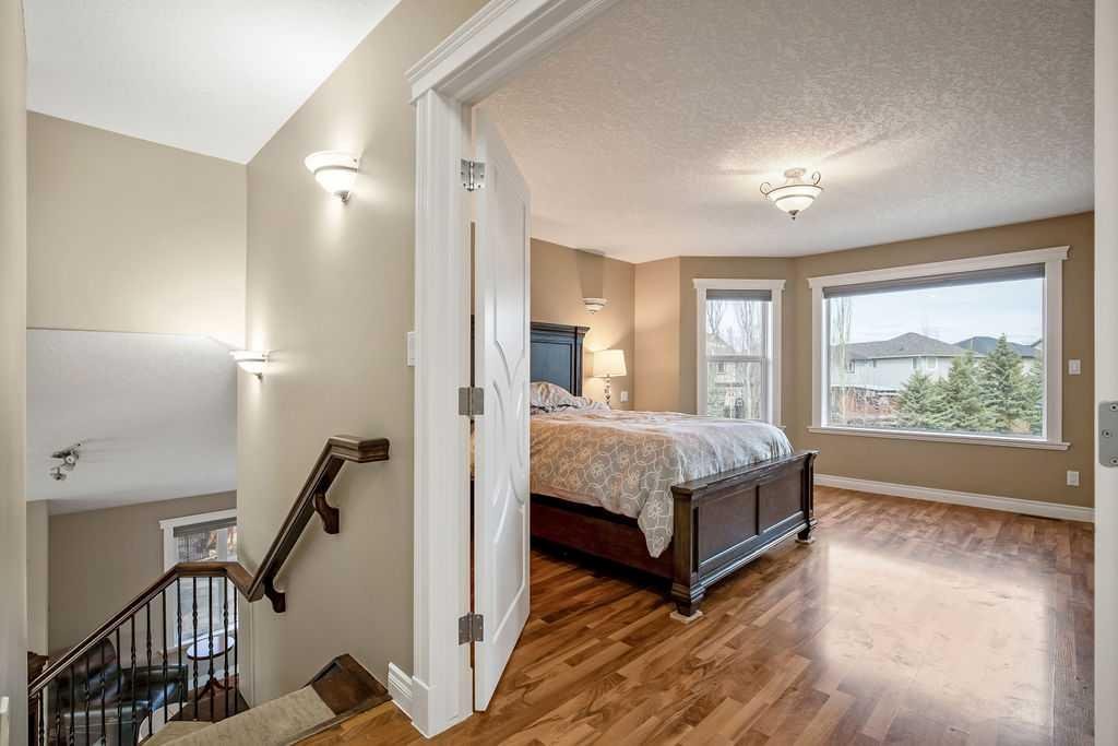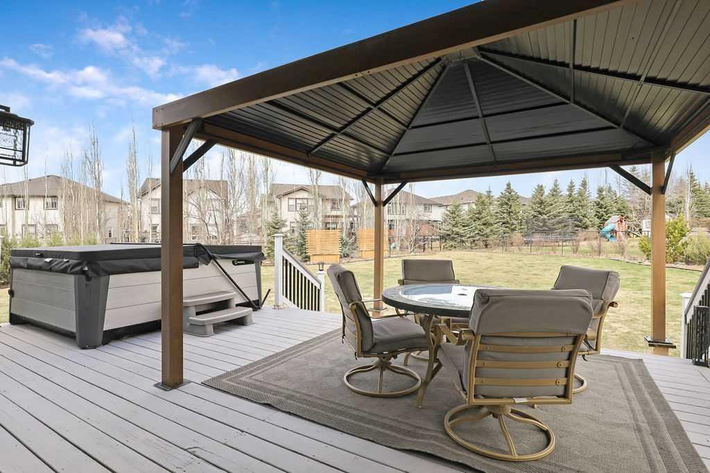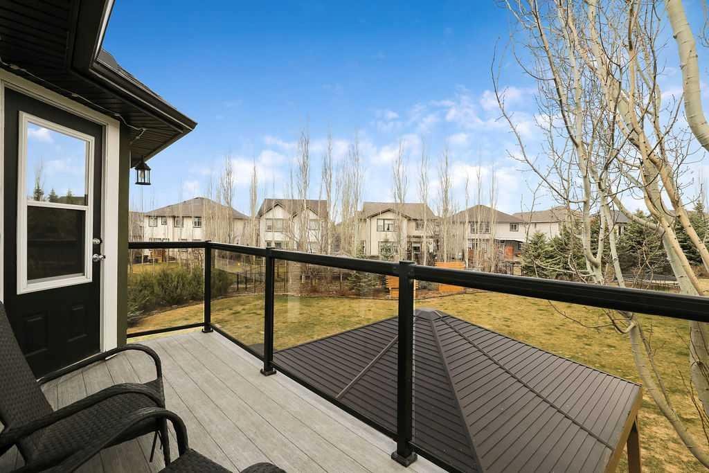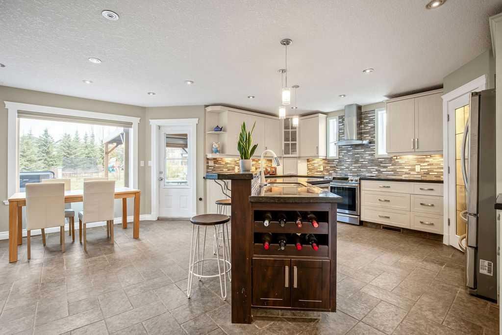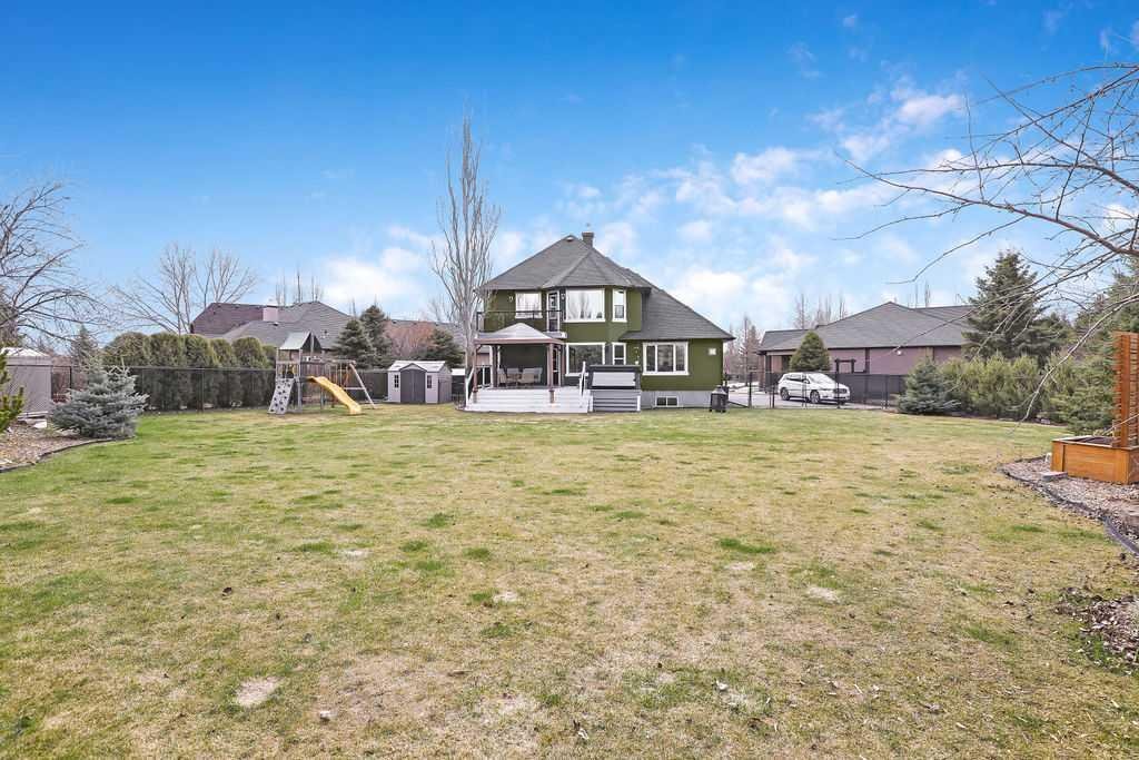 Experience refined country estate living in this exceptional custom-built home, ideally situated in the prestigious Air Ranch community. Set on an expansive 0.41-acre Pie lot—one of the largest in Okotoks—this remarkable property offers a rare blend of space, privacy, and natural beauty. The west-facing backyard is truly spectacular, surrounded by mature trees that create a private, park-like oasis—perfect for elegant outdoor entertaining or quiet evenings enjoying breathtaking sunsets. Positioned on a peaceful cul-de-sac, the property offers endless lifestyle possibilities, with ample space for RV parking, recreation, gardening, or seasonal outdoor features. It’s a setting that seamlessly balances tranquility with everyday convenience. Inside, the home showcases over 3,300 sq. ft. of thoughtfully designed and fully developed living space. The main level impresses with soaring vaulted ceilings and an open-concept layout, anchored by a warm and inviting gas fireplace. The beautifully renovated kitchen is both stylish and functional, featuring rich cabinetry with under-cabinet lighting, granite countertops, generous storage, and a well-appointed corner pantry. The upper level offers three spacious bedrooms along with a versatile bonus room—ideal as a private office, or elegant flex space. The primary suite is a true retreat, complete with double-door entry, a private west-facing balcony, a custom walk-in closet, and a luxurious 5-piece ensuite designed for relaxation. The fully finished lower level continues the home’s elevated feel with 9’ ceilings and the added comfort and convenience of motorized blinds. Recent system upgrades enhance both comfort and efficiency, including new furnaces, humidifiers, new central air conditioning units, hot water on demand, and solar panels—delivering modern performance with long-term energy savings. Additional features include a heated oversized garage, a premium ICF foundation, underground sprinklers, upgraded window coverings, rear window film, a water softener, and a built-in vacuum system. An exceptional offering, this home includes a hot tub, sauna, pool table, two sheds, and a children’s play structure—creating a true turnkey lifestyle opportunity. A distinguished property offering space, privacy, and elevated living in one of Okotoks’ most desirable communities.