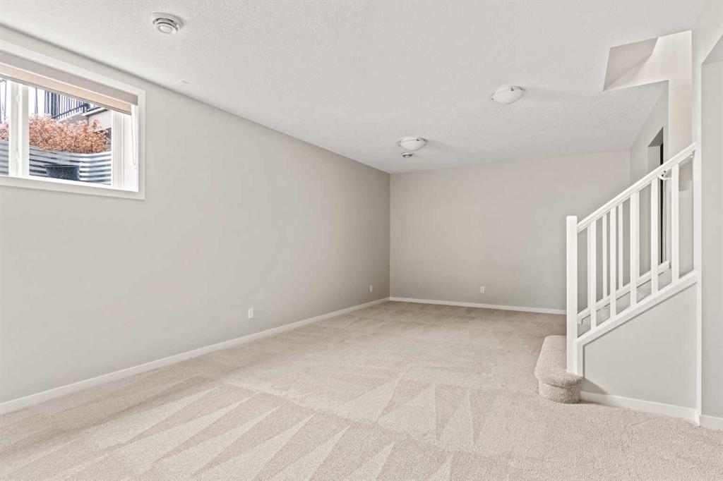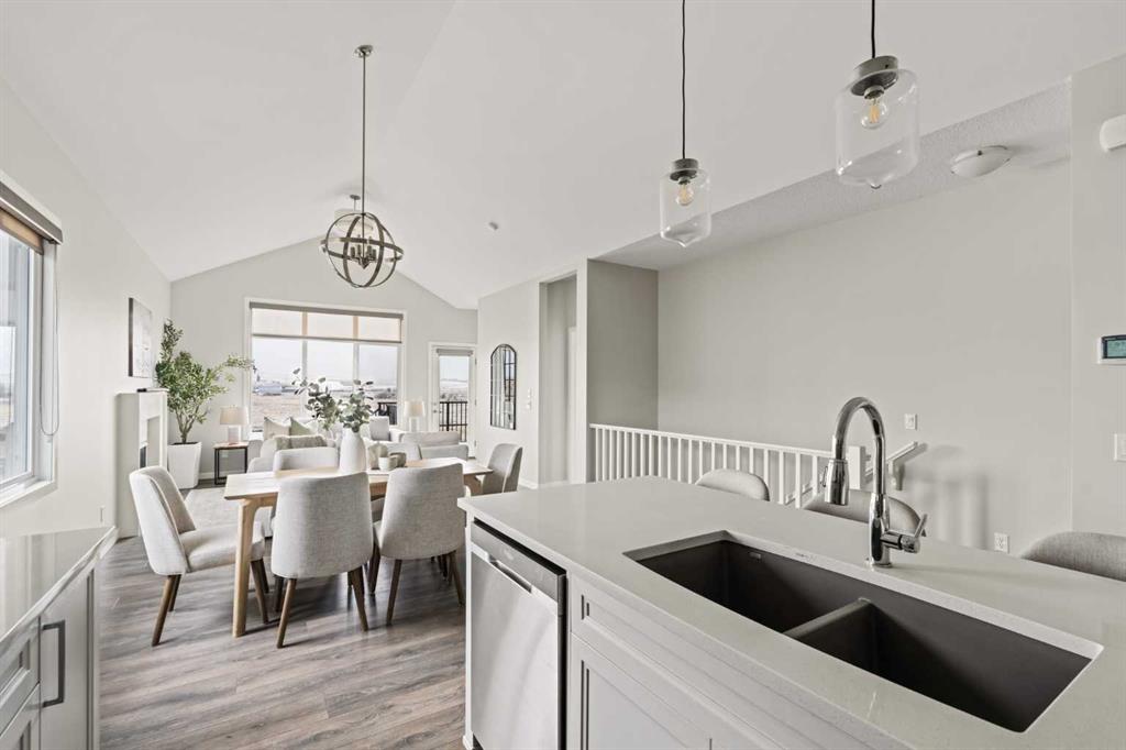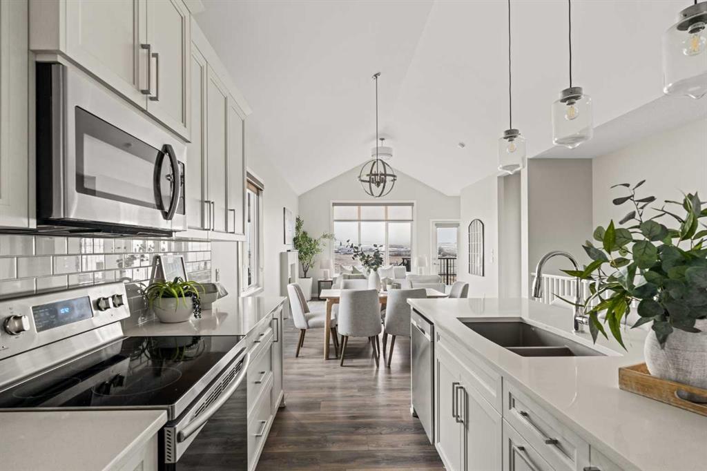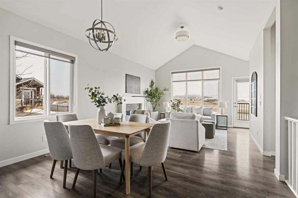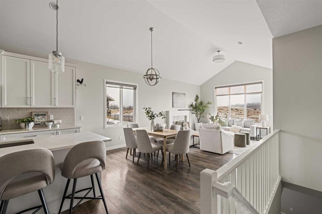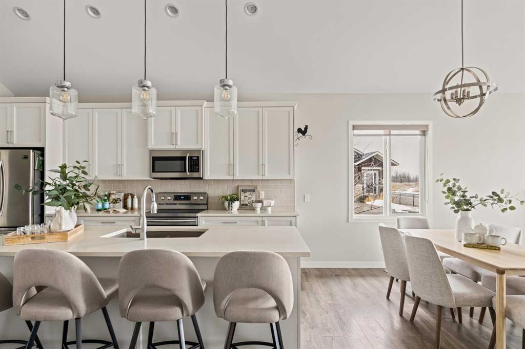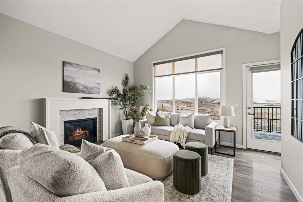 This beautifully maintained original-owner bungalow villa offers the perfect blend of elevated design and effortless living – ideal for downsizers, snowbirds, or anyone seeking a lock-and-leave lifestyle without compromise. Tucked into a quiet, small-town setting with no neighbours behind, this corner unit home delivers exceptional privacy and a peaceful backdrop, best enjoyed from the sunny south-facing backyard with viewings overlooking the pasture. Featuring 2 living areas, 3 bedrooms, 2.5 bathrooms and over 2,300 sq. ft. of developed living space, this property ensures you can easily host family and friends while creating the lifestyle you’re looking for. Inside, vaulted ceilings and resilient laminate flooring create a bright, airy atmosphere throughout the main level. The open-concept design is anchored by a stylish, timeless white kitchen featuring quartz countertops, a subway tile backsplash and a suite of stainless steel appliances. A large central island provides additional dining and prep space and a large pantry ensures ample storage. The kitchen seamlessly connects to the dining area and inviting living room making this the perfect space for entertaining. The expansive main living space is anchored by a central gas fireplace with a tile surround and mantle and a wall of south-facing windows provides breathtaking views all year long. The large primary suite spans ~13’x13′, offering ample space for a full bedroom suite and unobstructed views overlooking the green space behind. The primary suite includes a private ensuite featuring dual sinks, a walk-in shower, a private water closet, and a walk-in closet. The main level is complete with a conveniently located laundry room and a two-piece powder room, ensuring you can enjoy single-level living every day. The professionally developed lower level greets you with an expansive ~13’x26′ recreation room that has ample space for a TV-area, home gym and games area – the options are endless! The lower level includes two bedrooms, a full bathroom, and ample storage. This home has brand-new carpet throughout and has been freshly painted, making it fully move-in ready! Completing the home is a private double attached garage that enhances both convenience and lifestyle – offering secure access, additional storage, and true lock-and-leave functionality – perfect for seasonal living or travel. Situated on one of the most desirable lots in the entire development, this incredible opportunity offers optimal natural light, a large south-facing deck with views and no neighbours behind. It’s perfect for those wanting to downsize without compromise. Start enjoying a maintenance-free lifestyle now in the desirable new community of Fireside, just minutes from countless amenities and a short drive to the mountains!