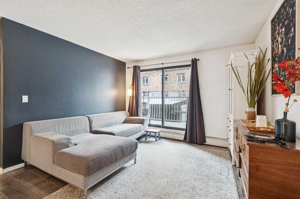 Located on the second floor, this charming condo offers a large, private south-facing balcony in a beautiful setting on a quiet street in Lower Mount Royal. Positioned on the quiet rear side of the building, the open-concept layout features new LVP flooring throughout; a functional kitchen; generous in-suite storage, plus a separate secured storage locker on the main floor; and full in-suite laundry. The spacious bedroom includes a double closet and comfortably accommodates a king-sized bed. The pet-friendly building offers covered, secure parking; elevator access; and ample street parking for guests. An exceptional location just steps to the vibrant 17th Avenue district; restaurants, coffee shops, fitness, groceries, shopping; and an easy walk to downtown.