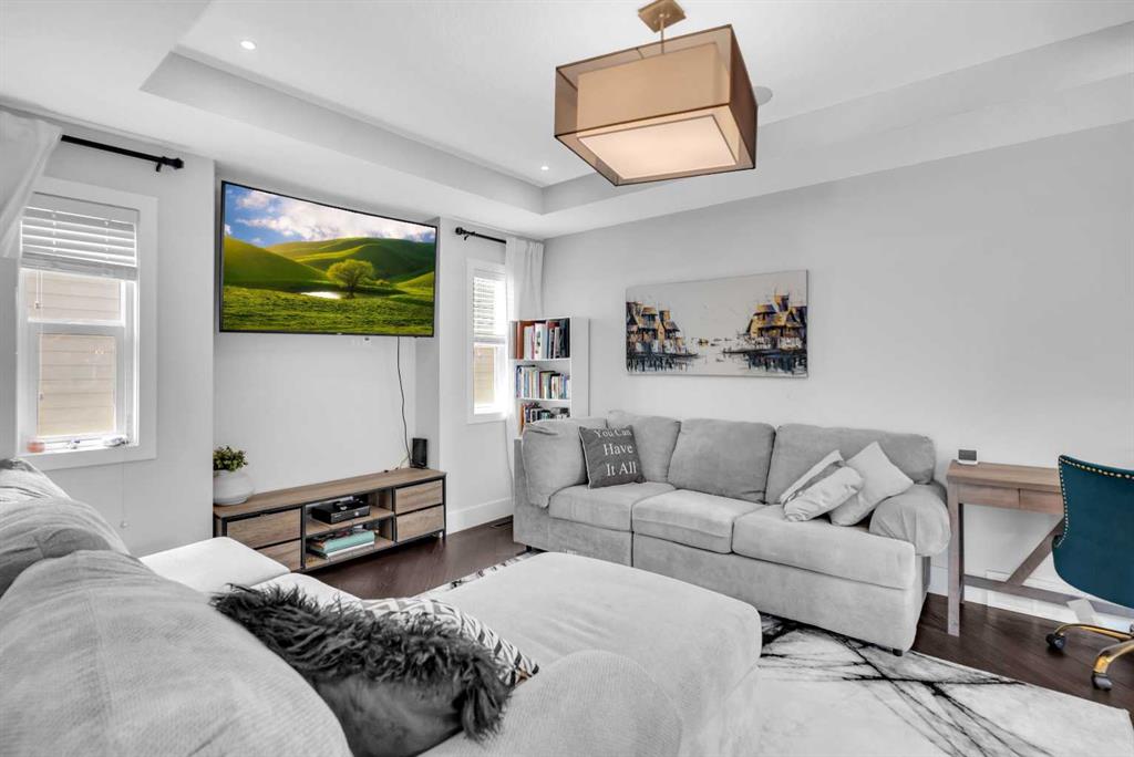 Nestled within the family-friendly enclave of Cornerstone and crafted by Truman Homes, this contemporary residence showcases bespoke finishes across its expanse, offering a total of six bedrooms and over 3,000 square feet of meticulously designed living space. The luminous main level boasts 9-foot ceilings and hardwood flooring, accentuating a spacious living area with a striking gas fireplace, a dining alcove, and an exquisite chef’s kitchen adorned with quartz countertops, an expansive island doubling as a breakfast bar, ample cabinetry, a walk-in pantry, and a comprehensive suite of appliances—an ideal setting for accommodating a large family. Upstairs, a bonus room provides additional flexibility, while the second floor hosts a laundry facility, four bedrooms, and a well-appointed 5-piece main bathroom. The master suite is a sanctuary unto itself, featuring hardwood flooring, a generous walk-in closet, and a spa-inspired 5-piece ensuite with marble floors, dual sinks, an indulgent oval soaker tub, and a separate shower stall. The lower level is thoughtfully finished to include two additional bedrooms, a 4-piece bathroom, a secondary laundry area, and a supplementary living space, ensuring ample room for relaxation and recreation. Completing this remarkable former show home is a practical mudroom situated off the garage, offering convenience and organization. Notably, this home is equipped with a side entrance, further enhancing its accessibility and versatility.