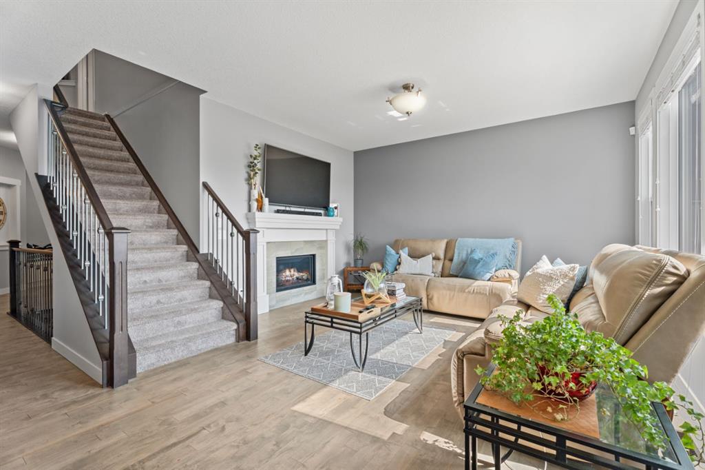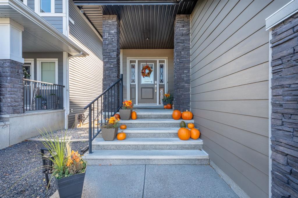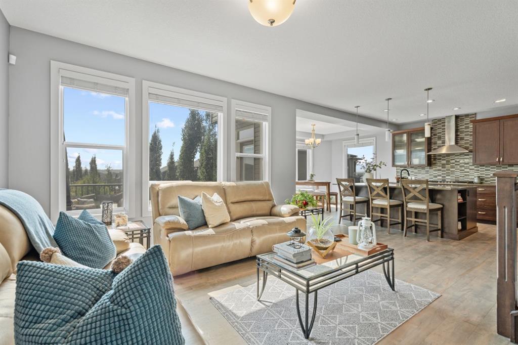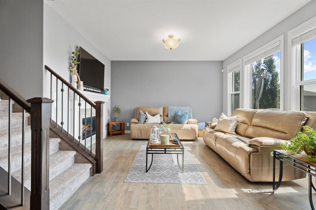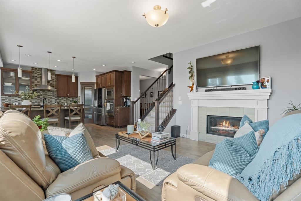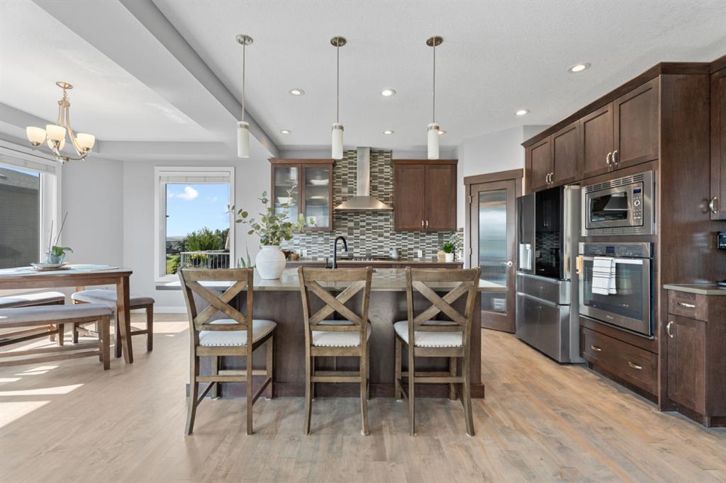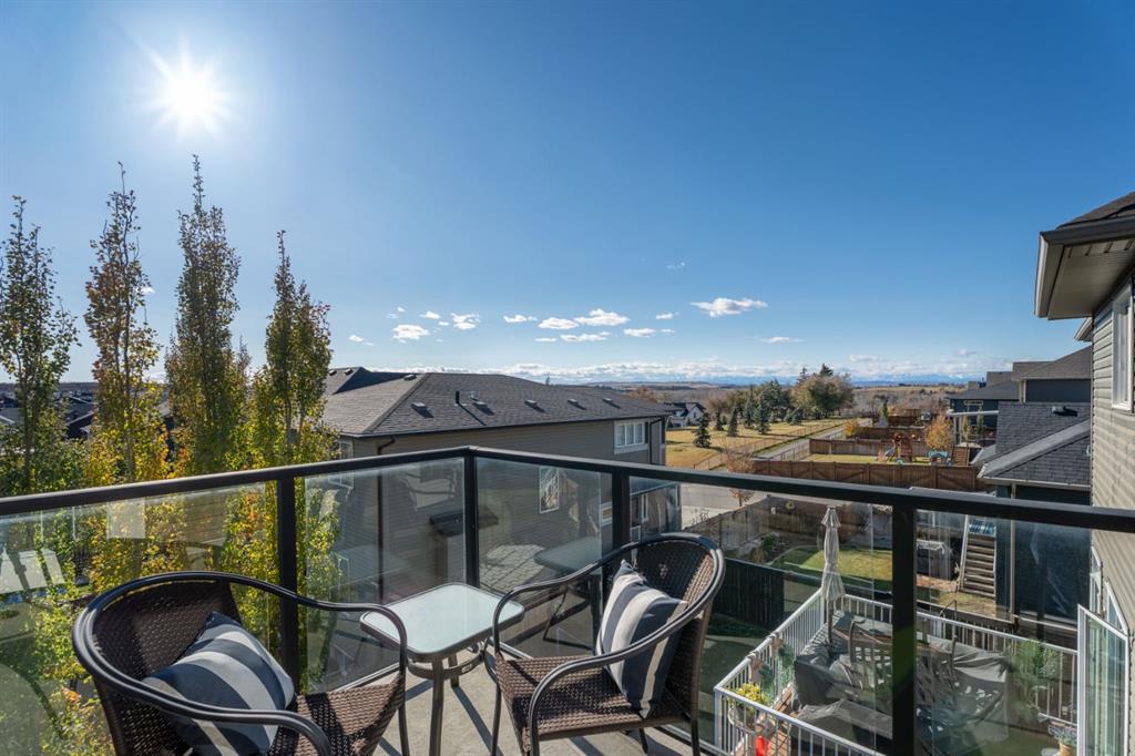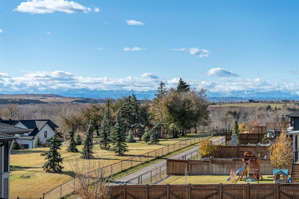 The family friendly community of Mountainview is a dream featuring over 35 acres of environmental reserve, including a lively creek, naturalized wet pond and pathway system along the ridge. This home truly has it all! With over 4,000 sq. ft. of beautifully developed living space, a walkout basement, mountain views, and thoughtful upgrades at every turn, this Sterling built gem delivers the full package. Add in an oversized, heated double garage, executive level finishes, and a layout that’s as functional as it is fabulous-check, check, check! The tiled foyer with its built in bench offers a warm welcome, while the front office with a double sided gas fireplace sets the stage for style and comfort. A formal dining room stands ready for your most memorable gatherings. And then there’s the kitchen… the true showstopper. A massive quartz island anchors the space, complemented by a gas cooktop with feature hood, built-in oven and microwave, a brand new upgraded fridge, wine fridge, pantry, and oversized windows framing those sweeping Rocky Mountain views. The bright breakfast nook opens onto your sunny south facing deck with west mountain views—where sunshine and scenery meet. The adjoining living room, centered around the cozy fireplace, is perfect for both family time and entertaining, with refinished hardwood floors and a seamless flow that’s an easy 10/10. Off the heated garage, the large mudroom provides ample storage, and even the main floor powder room is tastefully upgraded. Upstairs, the vaulted bonus room offers versatile living for movie nights, a playroom, or a quiet retreat. With four bedrooms on this level, everyone has their own space. The primary suite is a true haven, featuring oversized windows, a huge walk in closet, and a private den with its own balcony and more of those incredible views. Whether you use it as an office, nursery, yoga space, or reading nook, this bonus area is a dream. The ensuite impresses with dual sinks, a makeup station, a walk in shower, and a tiled soaker tub. The fully developed walkout basement continues to wow, complete with a full wet bar, large rec room, fifth bedroom, full bathroom, and access to the landscaped yard. Perfect for multi-generational living or guests. Imagine evenings under the covered patio, garden boxes in bloom, and maybe even a soak in the negotiable hot tub. Extras? This home is loaded with them: oversized heated garage, A/C (under contract), water softener, and year round trim lighting for curb appeal and effortless holiday sparkle. From top to bottom, this property blends luxury, comfort, size and family friendly design. Move in ready and perfectly poised to impress, this is mountain view magic you won’t want to miss. Be sure to check out the virtual tour!