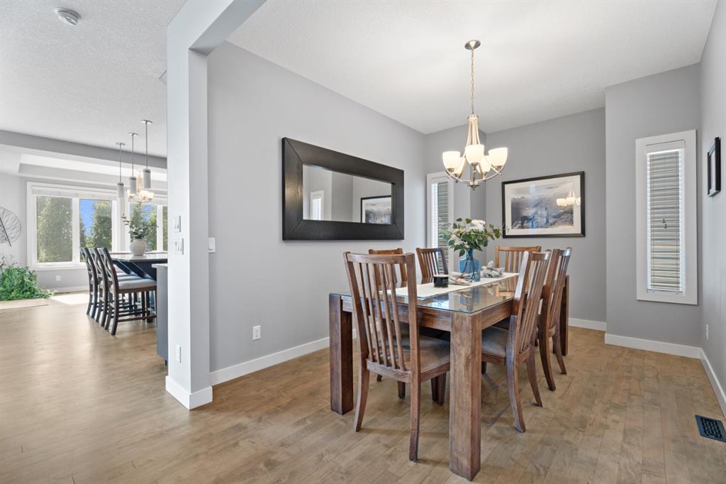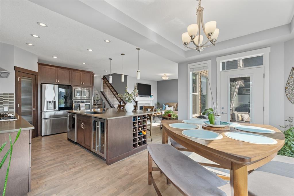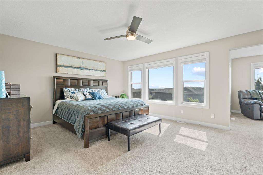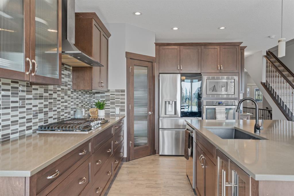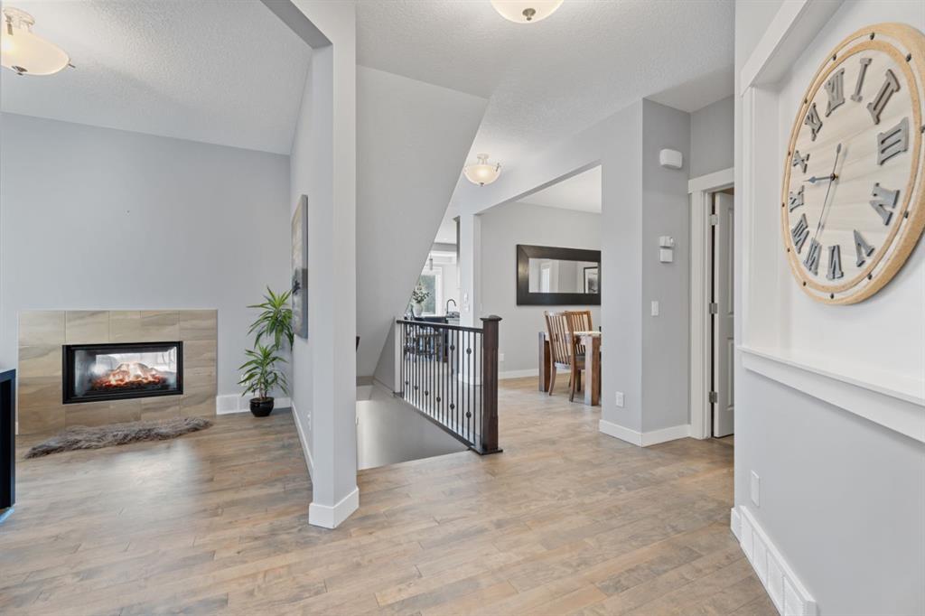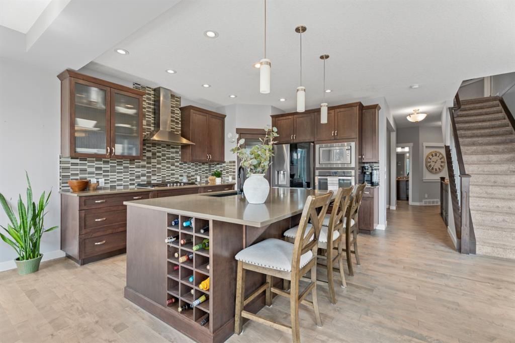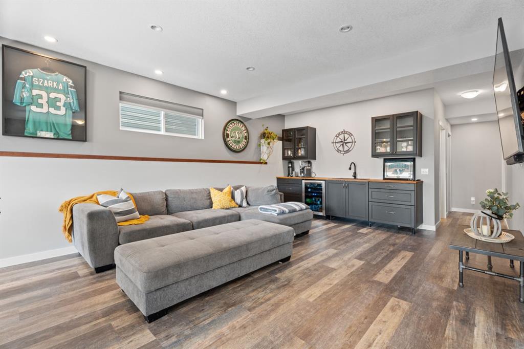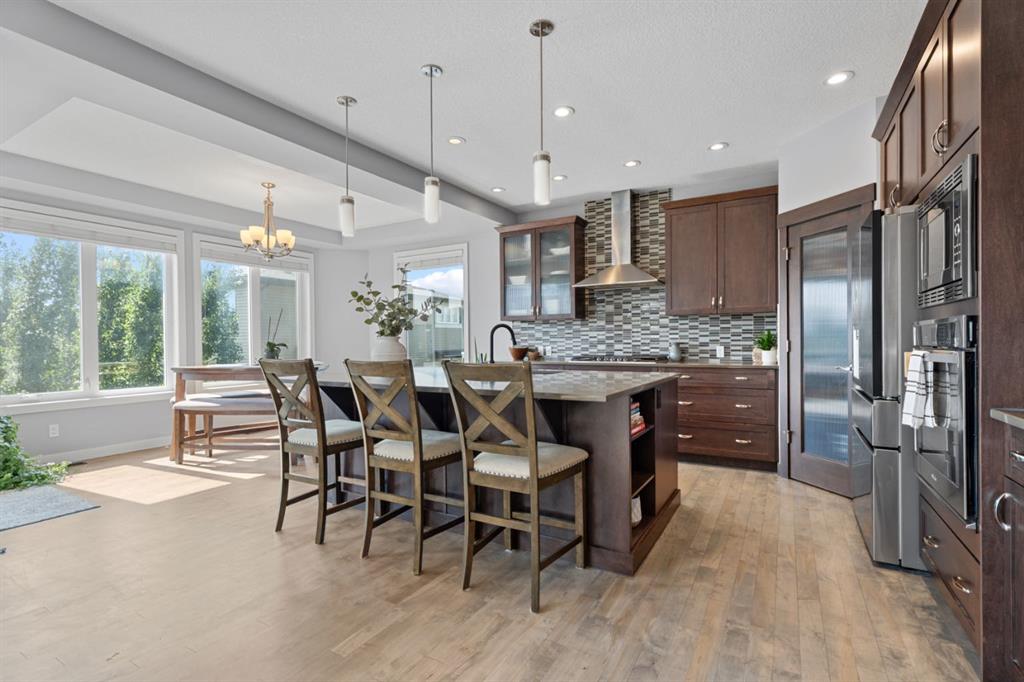 The family friendly community of Mountainview is a dream featuring over 35 acres of environmental reserve, including a lively creek, naturalized wet pond and pathway system along the ridge. This home truly has it all! With over 4,000 sq. ft. of beautifully developed living space, a walkout basement, mountain views, and thoughtful upgrades at every turn, this Sterling built gem delivers the full package. Add in an oversized, heated double garage, executive level finishes, and a layout that’s as functional as it is fabulous-check, check, check! The tiled foyer with its built in bench offers a warm welcome, while the front office with a double sided gas fireplace sets the stage for style and comfort. A formal dining room stands ready for your most memorable gatherings. And then there’s the kitchen… the true showstopper. A massive quartz island anchors the space, complemented by a gas cooktop with feature hood, built-in oven and microwave, a brand new upgraded fridge, wine fridge, pantry, and oversized windows framing those sweeping Rocky Mountain views. The bright breakfast nook opens onto your sunny south facing deck with west mountain views—where sunshine and scenery meet. The adjoining living room, centered around the cozy fireplace, is perfect for both family time and entertaining, with refinished hardwood floors and a seamless flow that’s an easy 10/10. Off the heated garage, the large mudroom provides ample storage, and even the main floor powder room is tastefully upgraded. Upstairs, the vaulted bonus room offers versatile living for movie nights, a playroom, or a quiet retreat. With four bedrooms on this level, everyone has their own space. The primary suite is a true haven, featuring oversized windows, a huge walk in closet, and a private den with its own balcony and more of those incredible views. Whether you use it as an office, nursery, yoga space, or reading nook, this bonus area is a dream. The ensuite impresses with dual sinks, a makeup station, a walk in shower, and a tiled soaker tub. The fully developed walkout basement continues to wow, complete with a full wet bar, large rec room, fifth bedroom, full bathroom, and access to the landscaped yard. Perfect for multi-generational living or guests. Imagine evenings under the covered patio, garden boxes in bloom, and maybe even a soak in the negotiable hot tub. Extras? This home is loaded with them: oversized heated garage, A/C (under contract), water softener, and year round trim lighting for curb appeal and effortless holiday sparkle. From top to bottom, this property blends luxury, comfort, size and family friendly design. Move in ready and perfectly poised to impress, this is mountain view magic you won’t want to miss. Be sure to check out the virtual tour!