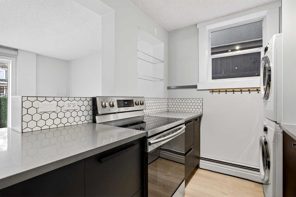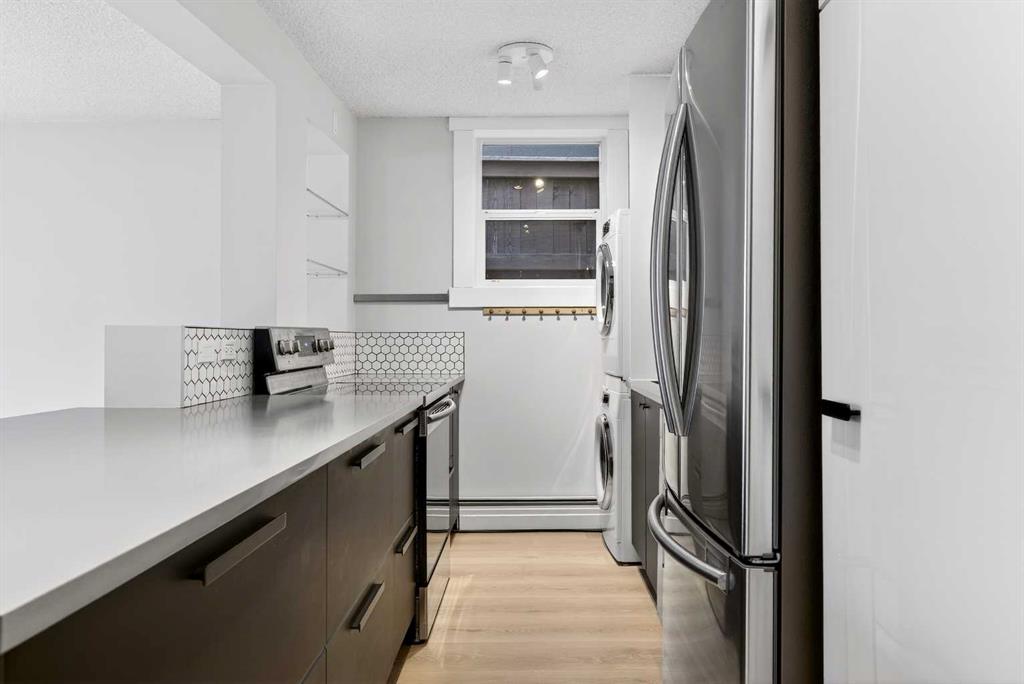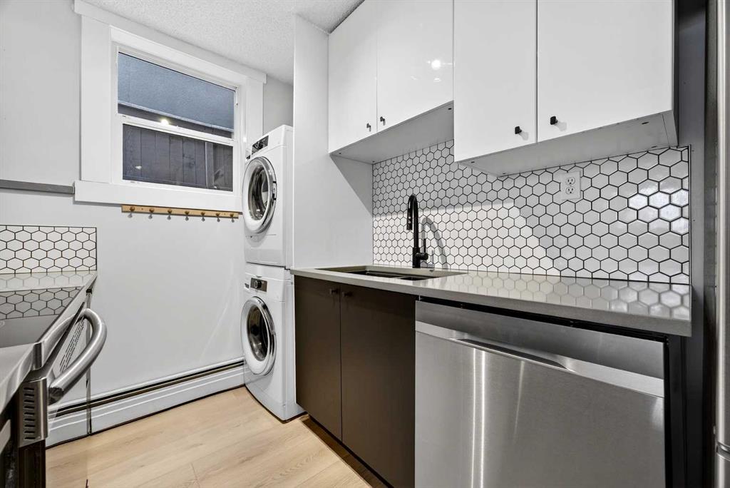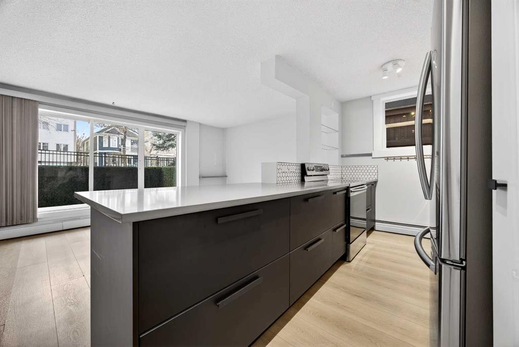 Bright and spacious south-facing corner unit located on a quiet, tree-lined street in the heart of Sunalta. This updated two-bedroom condo features quartz countertops, high-gloss cabinetry, new appliances, matte black fixtures and a stylish honeycomb backsplash in the kitchen. Luxury vinyl plank flooring (updated in 2023) runs through the living room, kitchen, and hallway, adding a modern touch. The primary bedroom offers ample closet space, while the second bedroom is ideal for a home office, guest room, or gym. Enjoy the convenience of in-suite laundry, plus additional building laundry on the same floor. Situated in a quiet concrete building with a private parking stall and in-suite storage. Just steps from the Calgary Tennis Club, C-Train station, parks, boutique shops, and some of the best breweries and dining the city has to offer. Exceptional value in one of Calgary’s most walkable inner-city neighbourhoods!