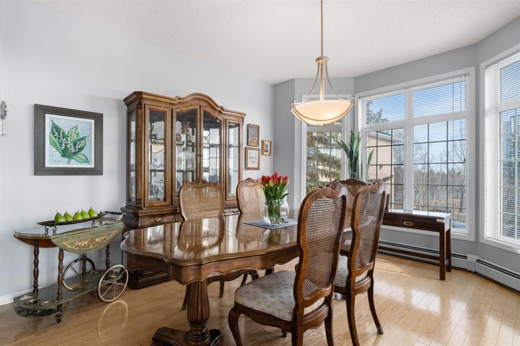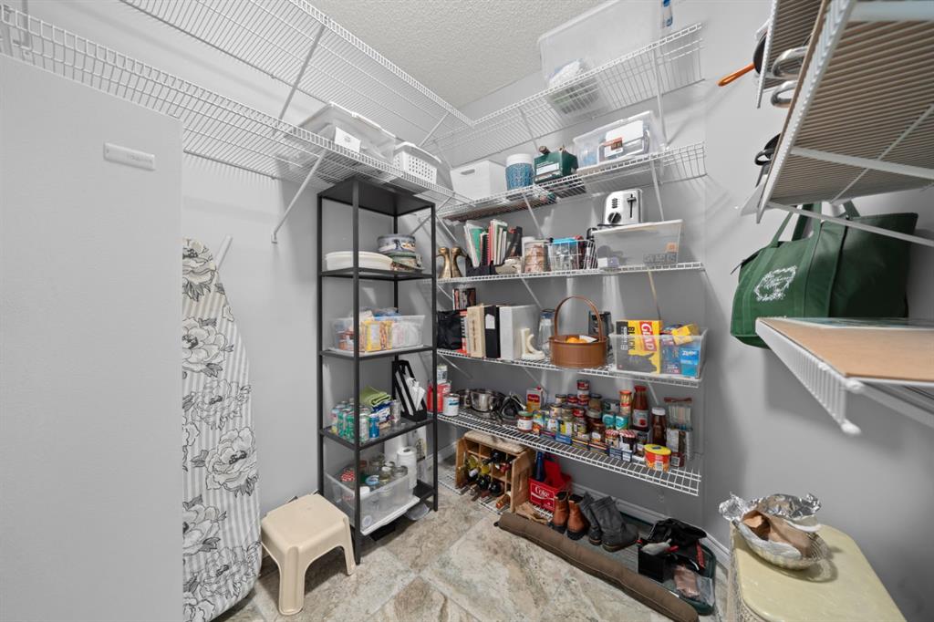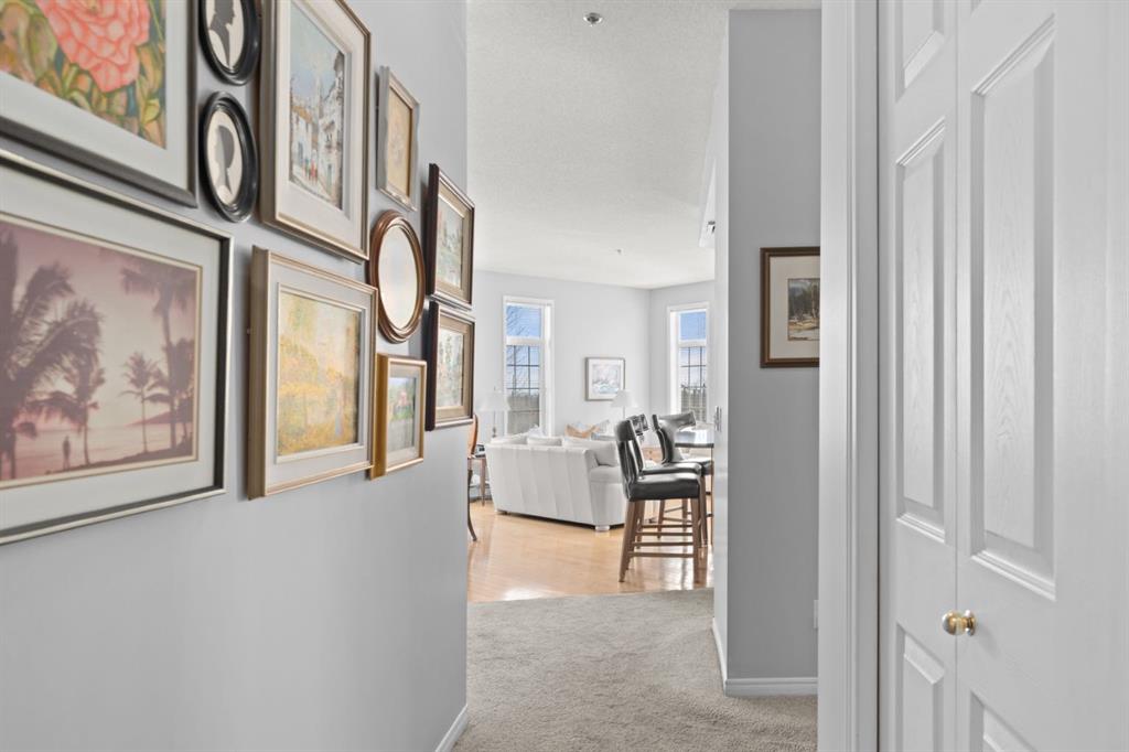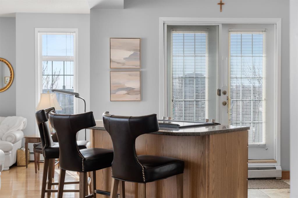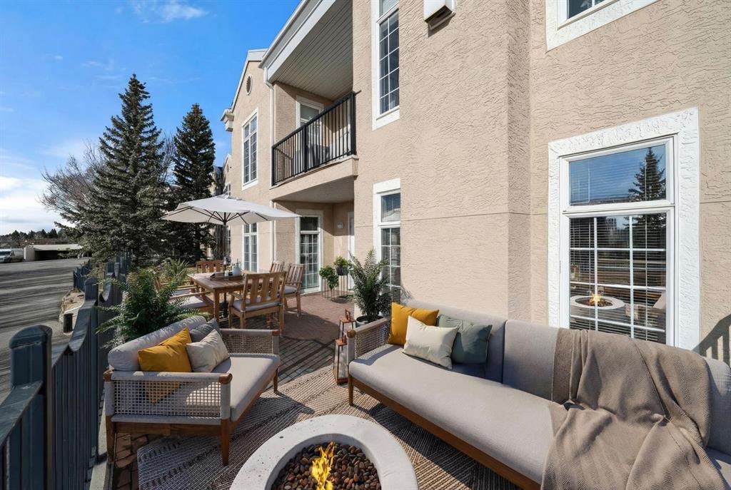 The kitchen is designed for both function and connection, featuring a generous island with seating, granite countertops, stainless steel appliances and ample counter space. The kitchen flows flows beautifully into the spacious dining area, which can easily accommodate sizeable gatherings. The living room invites relaxed, elegant comfort and frames the stunning outdoor views. The true showstopper is the massive patio, large enough for two distinct seating areas. Take in views of the mountains while enjoying your morning coffee, summer al fresco dining or a peaceful evening unwind. It is a rare outdoor space that genuinely extends your living area. The condo offers two spacious bedrooms, including a large primary retreat complete with a walk-in closet, additional linen storage and ensuite featuring a soaking tub and separate shower. The second bedroom is perfectly suited as a guest room or home office and is conveniently located near the additional two-piece bathroom, where you will also find in-suite laundry and another linen closet. Storage is exceptional throughout – there is a dedicated storage room at the front of the unit ideal for a freezer or pantry overflow, plus an impressive 6’ x 12’ (approx) storage room in the underground parkade located directly in front of your oversized titled parking stall. The building welcomes your pets (a small dog or cat) and is situated just steps from Dalhousie Station, with convenient access to shopping, restaurants and a Safeway grocery store. The Dalhousie LRT Station and central bus hub are a short walk away, with an additional bus stop located right outside the building. For those who enjoy walking or biking, numerous nearby pathways make it easy to stay active and connected to nature. Well managed with a highly attentive board, this low-density building offers a quiet, refined and friendly lifestyle, in an unbeatable location. Units here rarely come to market so don’t miss the opportunity to call this exceptional condo home! (Please click on the link for the 3D Tour.)