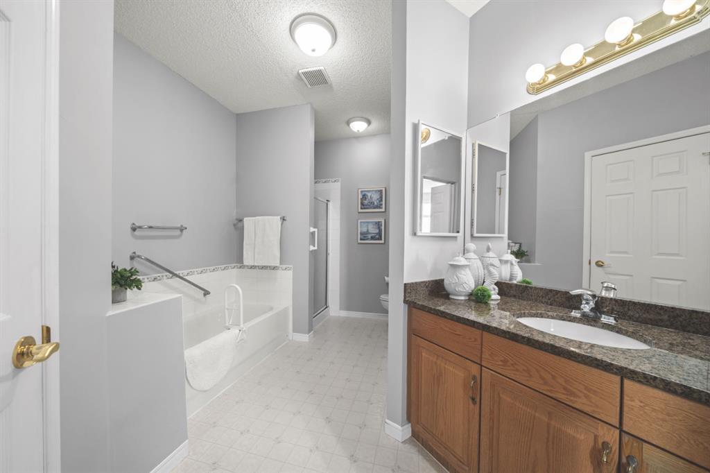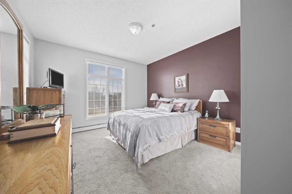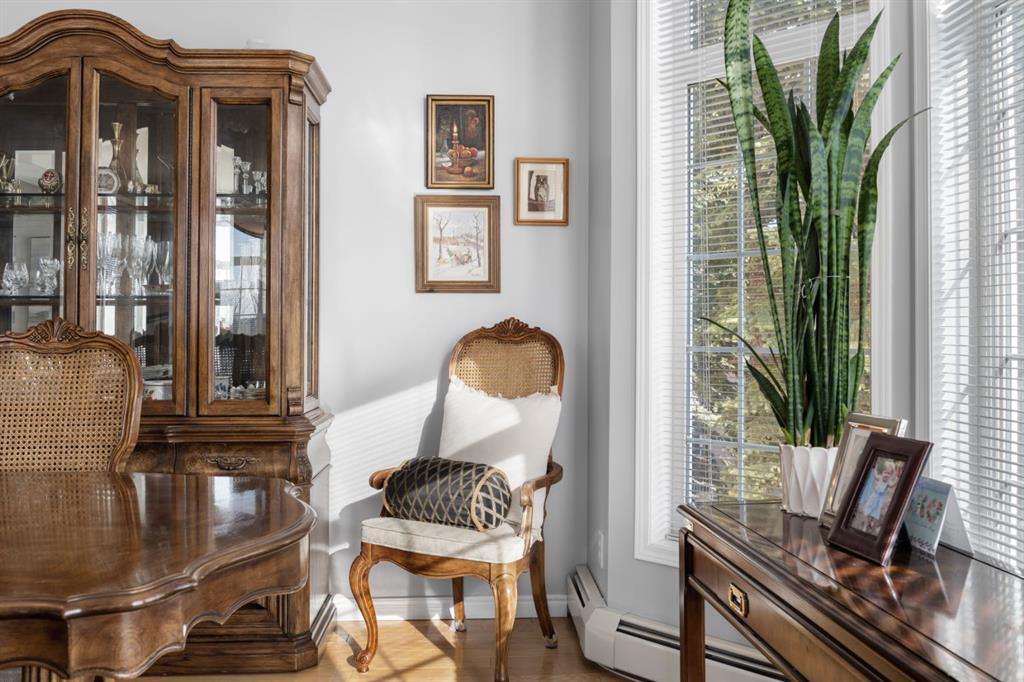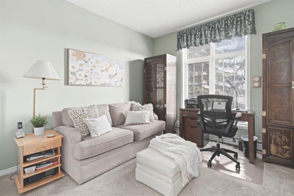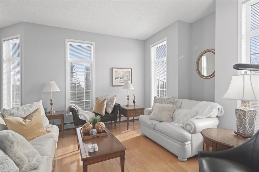 The kitchen is designed for both function and connection, featuring a generous island with seating, granite countertops, stainless steel appliances and ample counter space. The kitchen flows flows beautifully into the spacious dining area, which can easily accommodate sizeable gatherings. The living room invites relaxed, elegant comfort and frames the stunning outdoor views. The true showstopper is the massive patio, large enough for two distinct seating areas. Take in views of the mountains while enjoying your morning coffee, summer al fresco dining or a peaceful evening unwind. It is a rare outdoor space that genuinely extends your living area. The condo offers two spacious bedrooms, including a large primary retreat complete with a walk-in closet, additional linen storage and ensuite featuring a soaking tub and separate shower. The second bedroom is perfectly suited as a guest room or home office and is conveniently located near the additional two-piece bathroom, where you will also find in-suite laundry and another linen closet. Storage is exceptional throughout – there is a dedicated storage room at the front of the unit ideal for a freezer or pantry overflow, plus an impressive 6’ x 12’ (approx) storage room in the underground parkade located directly in front of your oversized titled parking stall. The building welcomes your pets (a small dog or cat) and is situated just steps from Dalhousie Station, with convenient access to shopping, restaurants and a Safeway grocery store. The Dalhousie LRT Station and central bus hub are a short walk away, with an additional bus stop located right outside the building. For those who enjoy walking or biking, numerous nearby pathways make it easy to stay active and connected to nature. Well managed with a highly attentive board, this low-density building offers a quiet, refined and friendly lifestyle, in an unbeatable location. Units here rarely come to market so don’t miss the opportunity to call this exceptional condo home! (Please click on the link for the 3D Tour.)