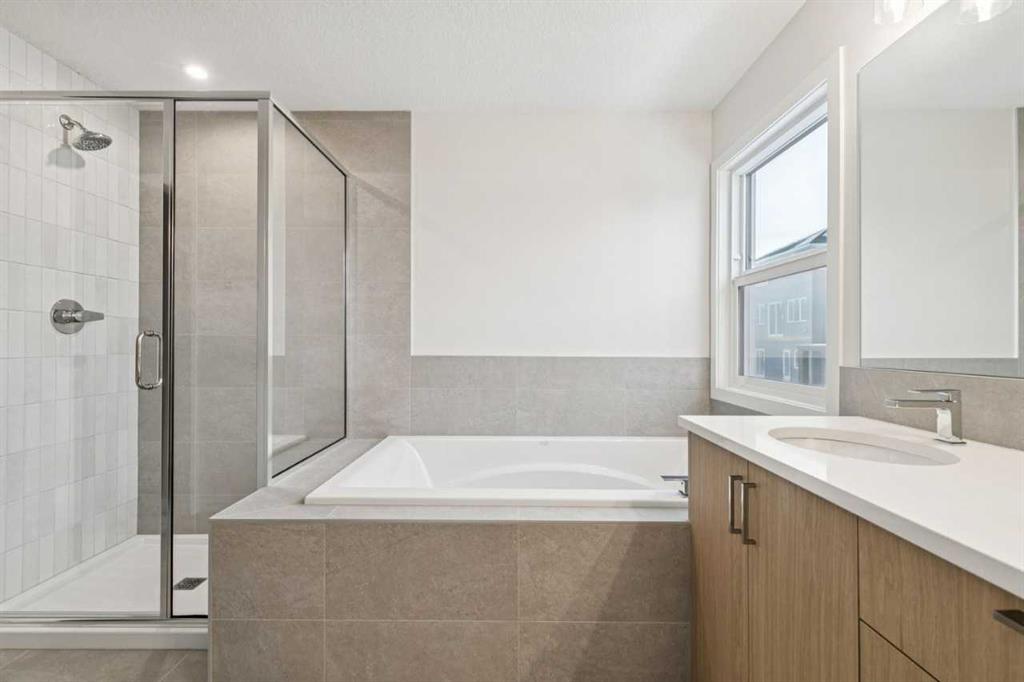 This Quick Possession Cedarglen Homes Showhome model boasts: all the luxury designs of our showhome in a brand-new space waiting for its rightful owner. This home was designed for family living: four spacious upper floor bedrooms with a central bonus room separating the primary from the kids as a nice sound buffer and privacy for the owner’s bedroom. The ensuite boasts a tile shower and glass surround with a soaker tub, creating an intimate oasis one would expect from a visit to the spa, and double vanities to keep order in a space that requires it. The kitchen is a sight to behold, beating as the heart of the home with an island meant for entertaining, replete with two-sided extended eating ledges, and large windows and a patio door to the rear deck and BBQ gasline promising endless summer feasts and lounging. The interior selections are what separate this home from the chaff. On top of the incredible upgrades in this home, like the spacious kitchen with cabinets tight to the ceiling, a designer electric fireplace detail that lends the great room its artistic flair, and railing opening up the stairwell to the second floor, the basement is ready for a future potential development, with a side entrance and a 9′ ceiling height that will make the future development of the basement as easy as passing your contractor the pre-designed basement layout Cedarglen’s already devised. Create new memories in the house of your dreams.