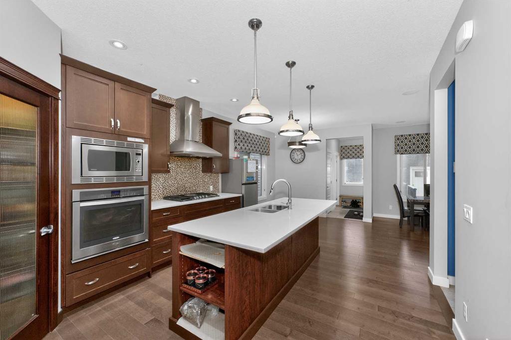 Designed for both everyday living and entertaining, the open-concept kitchen showcases stainless steel appliances, including a gas cooktop, built-in oven, and microwave, along with a refrigerator and dishwasher. Elegant maple cabinetry, a pantry, and a large island featuring an undermount sink, wine storage, and additional cabinetry provide both beauty and functionality. Stylish pendant lighting, recessed lighting, and under-cabinet illumination complete the space.