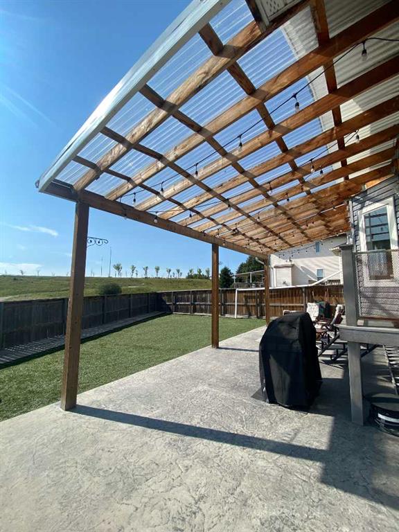 Notable upgrades include quartz countertops, luxury vinyl plank flooring, recessed LED lighting, modern white-painted doors, casings and baseboards, and a double attached garage with an extra-wide concrete driveway. The impressive 38′ x 14′ covered concrete rear patio extends your living space outdoors and overlooks a beautifully fenced south-facing backyard oasis with a large grassy area, wide side yards, concrete walkways, easy-care vinyl siding, and incredible valley views.