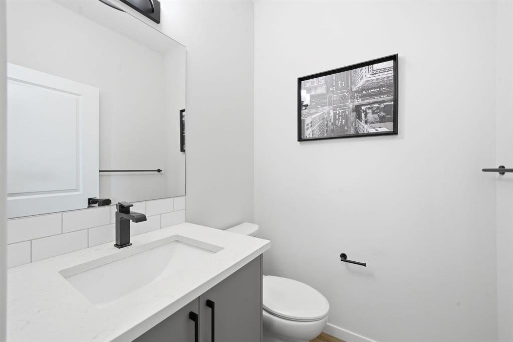 The gourmet kitchen flows seamlessly from the living area, complete with stainless steel appliances, a gas range, a stunning waterfall island, and a spacious dining area ideal for hosting family and friends. A convenient 2-piece powder room completes this level.