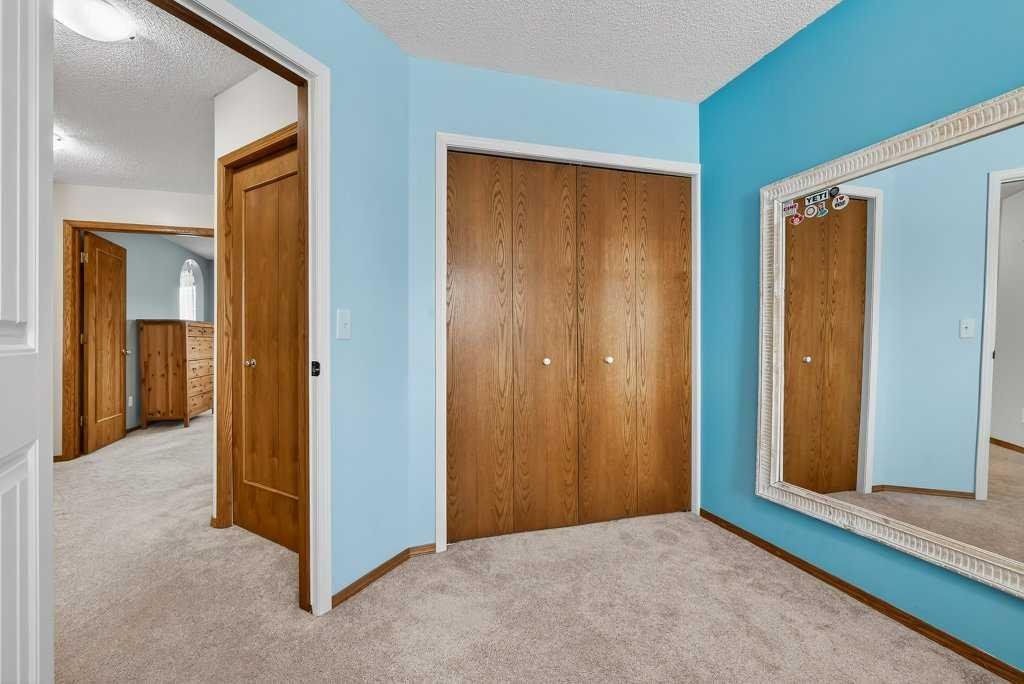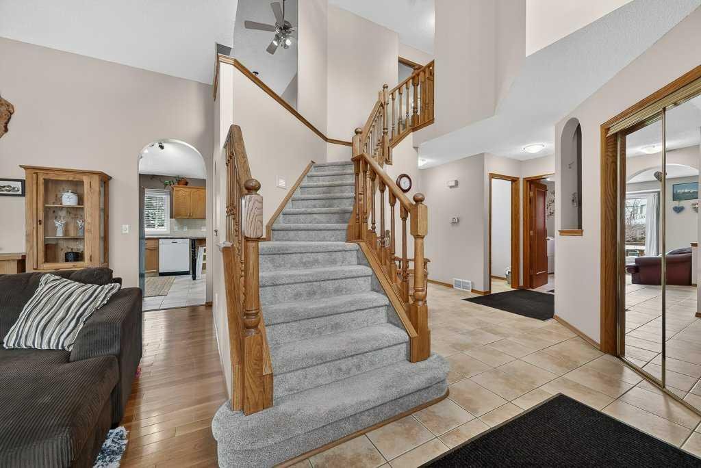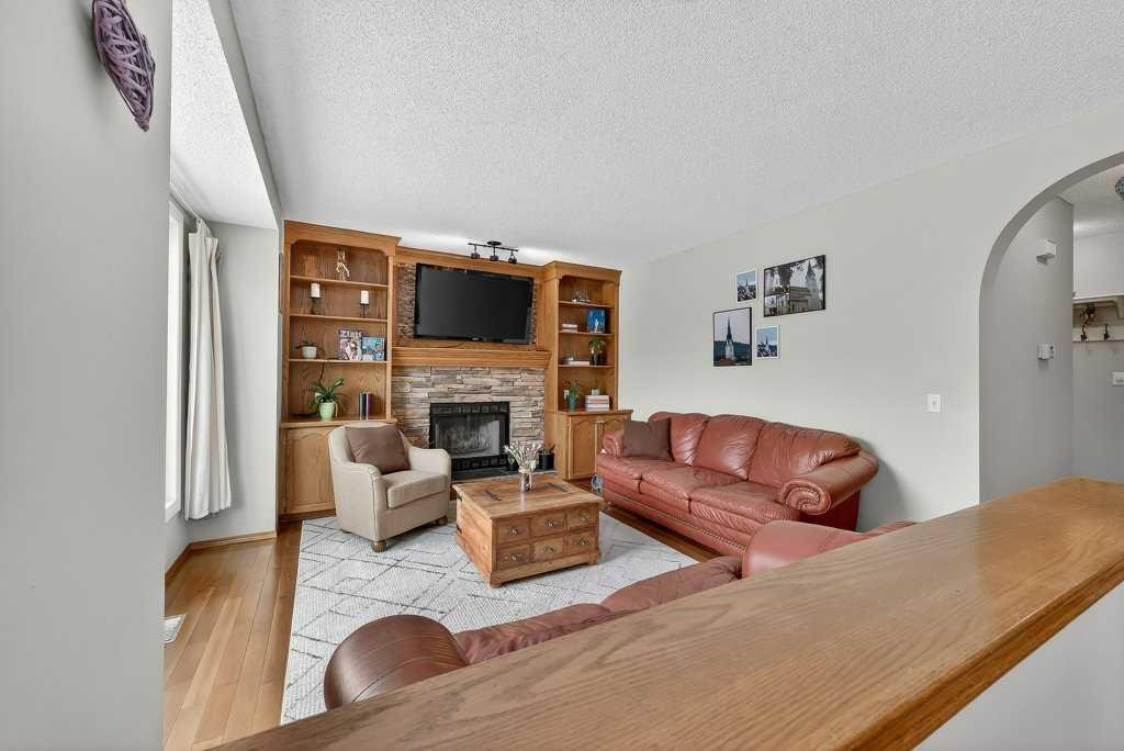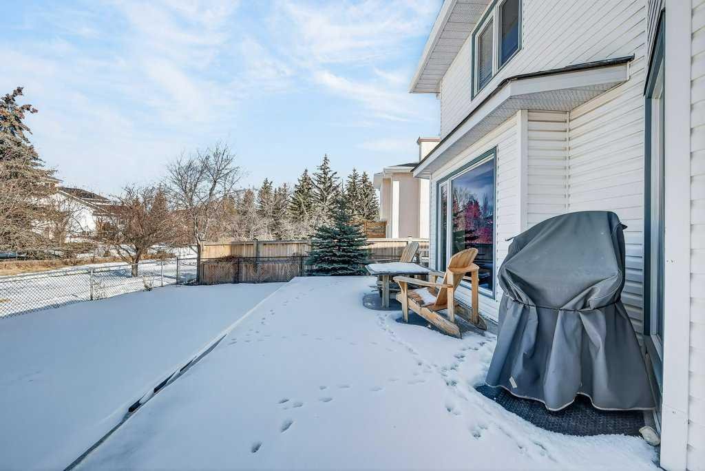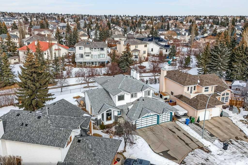 This is a rare opportunity to own a beautiful and solid family home, perfectly nestled on a quiet and safe cul-de-sac and backing onto a serene green belt in the highly desirable community of Hawkwood. With only six homes on the street, this property offers exceptional privacy and a wonderful sense of community. Its charming curb appeal, mature landscaping, and expansive triple-attached garage create a welcoming first impression and offer the lifestyle of comfort. Inside, the home features a bright living room, filled with natural light from large soaring windows, flows effortlessly into the formal dining area—perfect for hosting family dinners and special occasions. Just steps away, the cozy family room with a wood-burning fireplace connects beautifully to the well-appointed kitchen, where abundant cabinetry, a pantry, vaulted ceilings, and a large skylight create an inviting and open space for everyday living. A convenient powder room and warm hardwood flooring throughout the main level add both comfort and elegance. The second floor is designed with rest and privacy in mind. The spacious primary retreat, accessed through elegant French doors, easily accommodates a king-sized bed and features a generous walk-in closet along with a bright 4-piece ensuite complete with in-floor heating. Two additional well-proportioned bedrooms provide excellent space for family members of all ages and can comfortably accommodate queen-sized beds. The unspoiled basement is clean, open, and ready for your personal vision—whether that be additional living space, a home gym, a recreation room, or a customized entertainment area. Recent upgrades provide added peace of mind and value, including new carpet on the entire upper level and staircase (2025), fresh interior paint (2025), driveway lift and crack repairs (2025), new sump pump (2025), a new roof (2024), greenhouse (2024), and a furnace engine replaced in 2016. The home is also equipped with central air conditioning rough-in and includes the original 2007 A/C unit, which is being sold in as-is condition. Set on an impressive 7,168 sq. ft. lot, the backyard is truly a private retreat. A large patio finished with waterproof Duradek overlooks the peaceful green space lined with apple trees and leads toward a nearby playground. The generous yard offers endless possibilities—perfect for bonfire evenings, BBQ gatherings, or growing your own produce in the greenhouse. In springtime, when the apple trees bloom, the backyard view becomes truly breathtaking. The location is exceptional. St. Maria Goretti School in a 10-min walk and Hawkwood School 15 min away. Shopping and amenities at Superstore, Beacon Hill Shopping Centre, and Crowfoot Shopping Centre are a short drive away, along with the Crowfoot Library, YMCA, restaurants, and everyday conveniences. Quick access to Stoney Trail makes commuting across the city easy and provides a fast escape to the mountains. Opportunities like this do not come often. Book your private showing today!