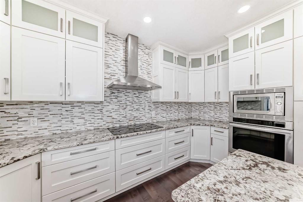 The chef inspired kitchen is the heart of the home, featuring built-in appliances, granite countertops, and a large centre island perfect for cooking, entertaining, and gathering with family and friends. The main floor offers exceptional versatility with a living room, dining room, den, and a cozy family room highlighted by a beautiful stone tile feature wall and built-in wall unit.