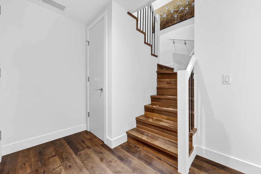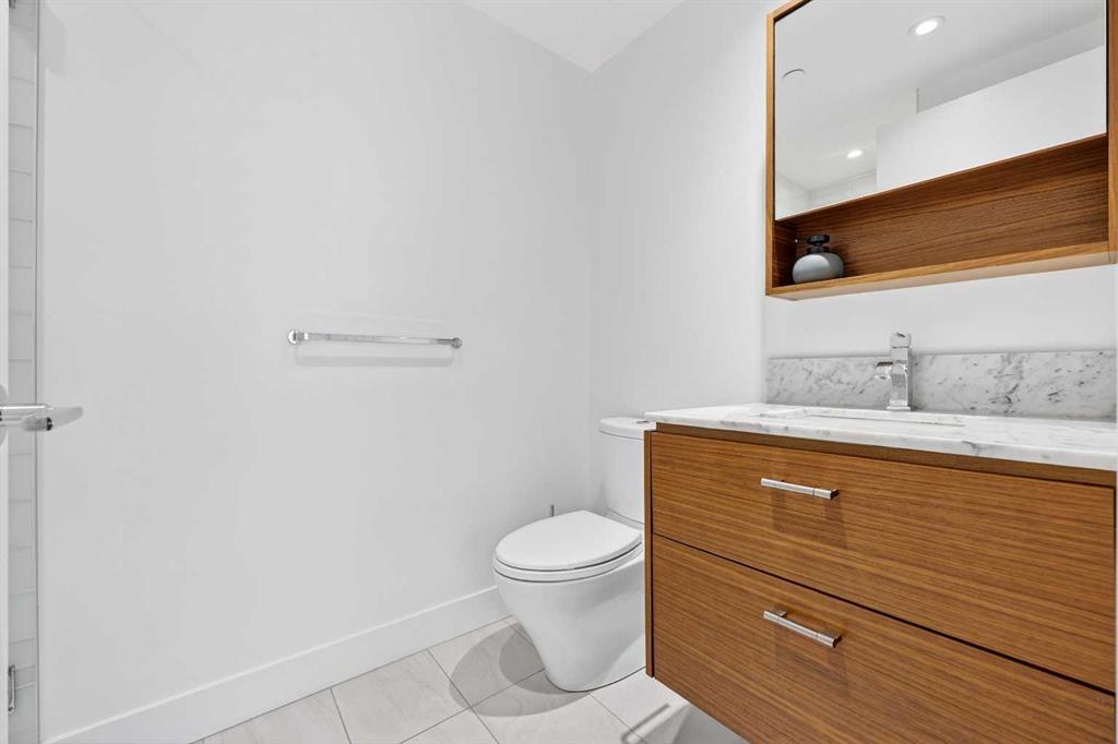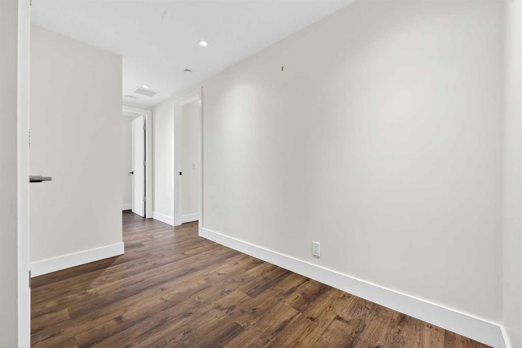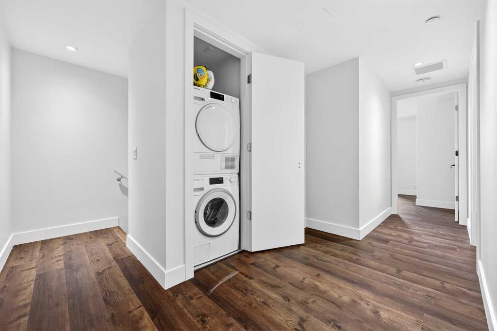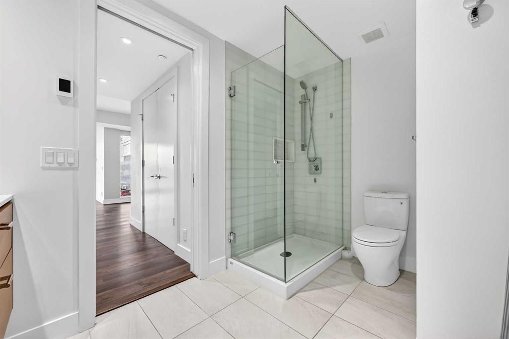Upstairs, the primary suite offers a private retreat with three organized closets and a spa-inspired ensuite featuring dual vanities, a glass walk-in shower, and heated floors. The second bedroom is generously sized and ideally located next to the main four-piece bathroom, which also includes in-suite laundry and heated tile floors—adding both comfort and convenience.