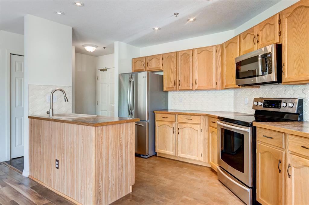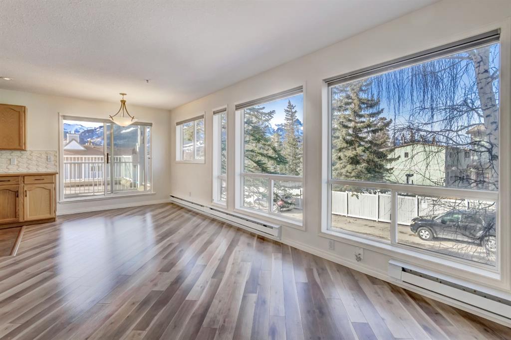 Two bedroom apartment with amazing views. This bright two bedroom, two bathroom corner suite offers over 980 sqft of single level living, perfectly positioned to capture breathtaking mountain views. Oversized windows and the coveted corner location flood the home with natural light, while its sunny valley side setting enhances the warm, inviting atmosphere. The open concept kitchen, dining and living area is ideal for both everyday living and entertaining, anchored by a cozy fireplace. Step outside to the spacious private patio, an extension of the living space and the perfect spot to relax and take in the surrounding alpine scenery. The primary bedroom features a walk in closet and private ensuite, while a second bedroom, full bathroom, walk-in laundry room and ample storage complete the layout. Residents enjoy excellent on site amenities, including an outdoor hot tub, a common gathering space, underground parking and storage. Located just steps from hiking and biking trails plus numerous Bow Valley attractions.