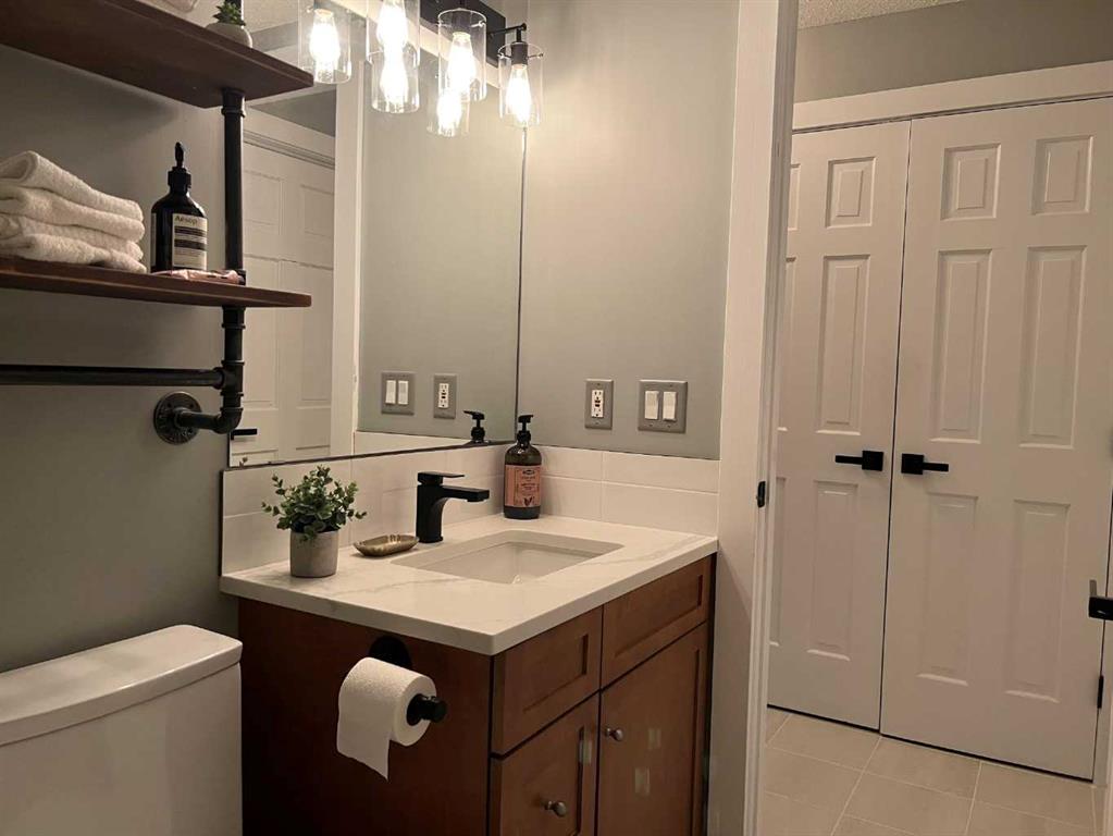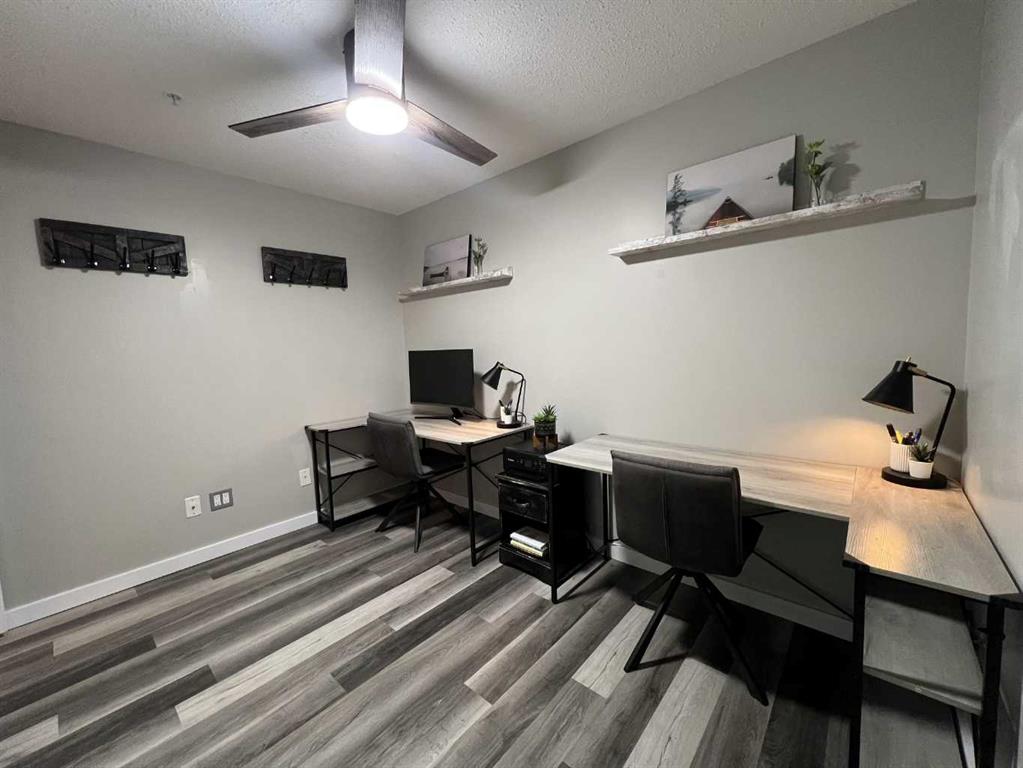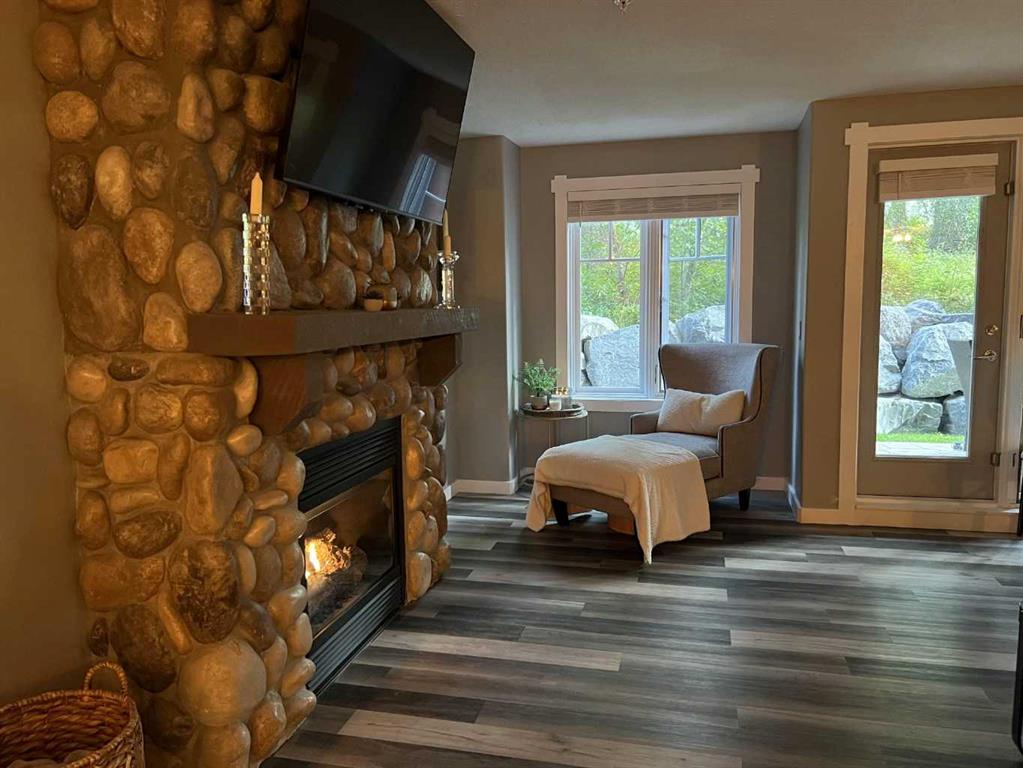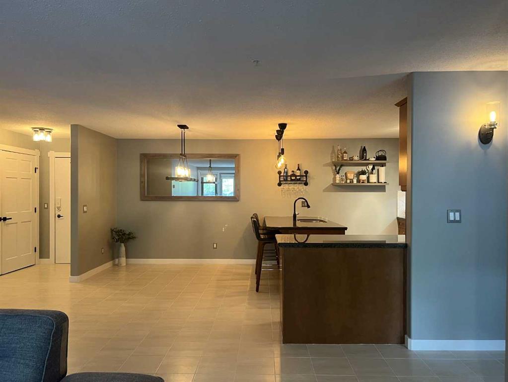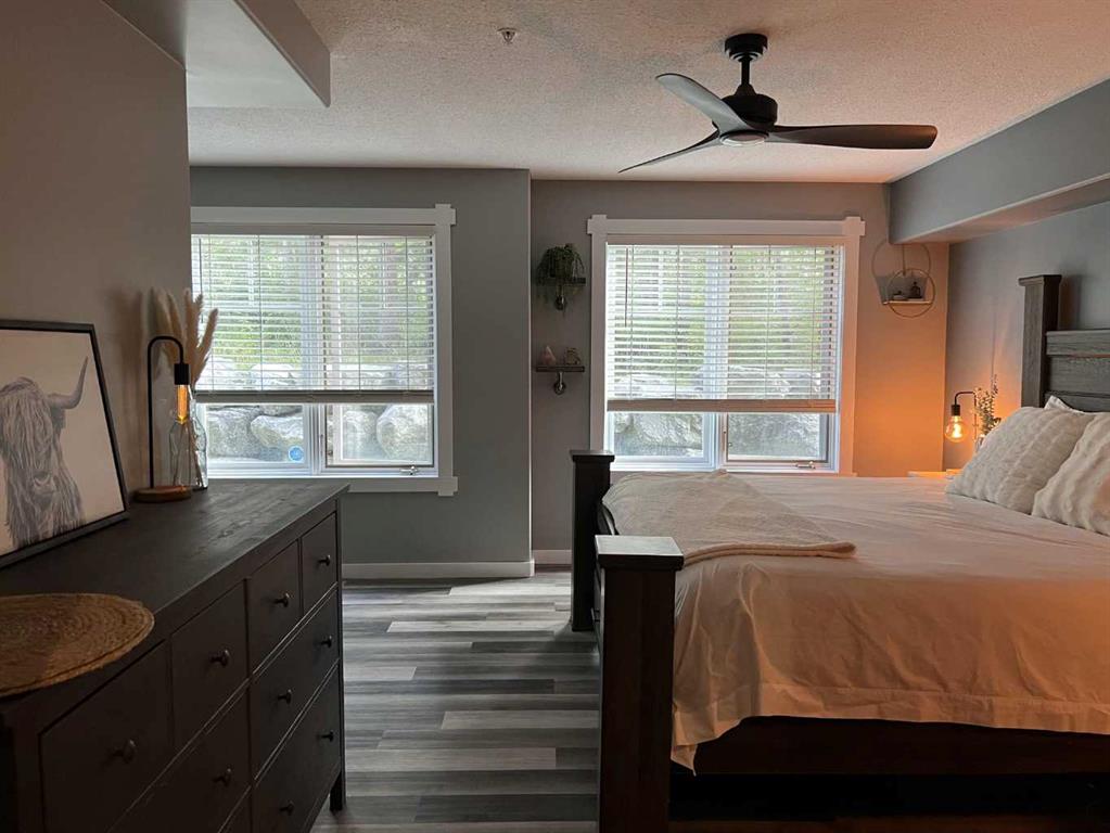 Crossbow Landing offers the best in Canmore living. This west facing 2 bedroom plus den (or third bedroom), 2 bathroom, single level apartment features large square footage and updates throughout. Renovations include paint, flooring, countertops, faucets, stone work and ceiling fans. Storage abounds in the kitchen, bathrooms, laundry room and multiple closets. Host guests in the open concept kitchen, dining room and living room. Enjoy the warmth of the in-floor heat and river stone gas fireplace. The amenities building, offering indoor and outdoor hot tubs, sauna, well-equipped fitness room, and a huge common room with games, library, TV and lounge areas is among the best in the valley. To top it off, you get TWO titled parking stalls in the heated parkade, plus TWO large storage units in front of the parking stalls. Located near the Bow River and trails, and the new retail zone that is currently being developed.