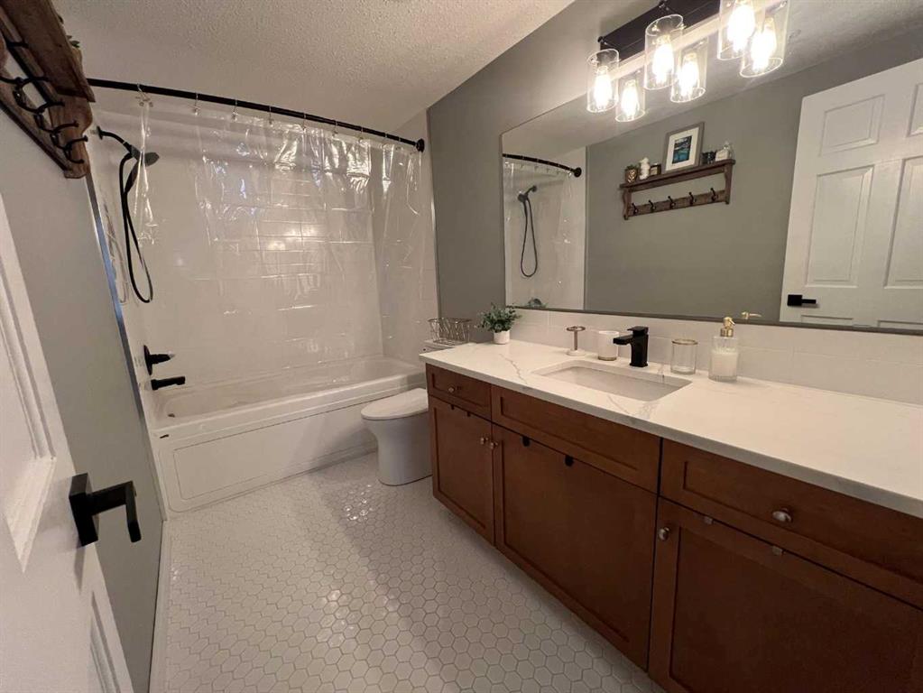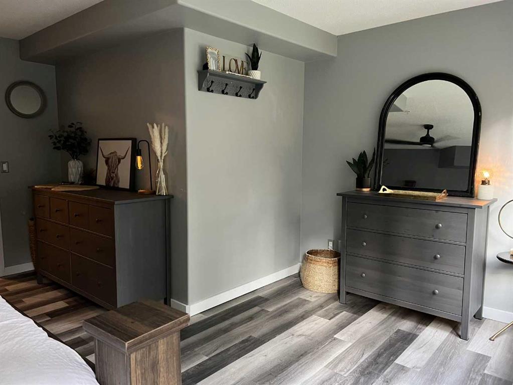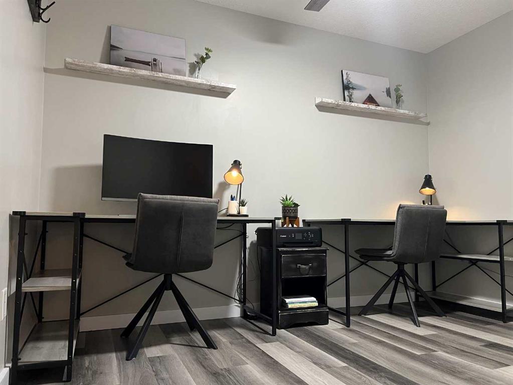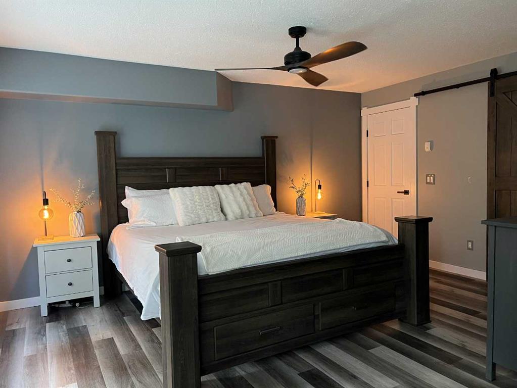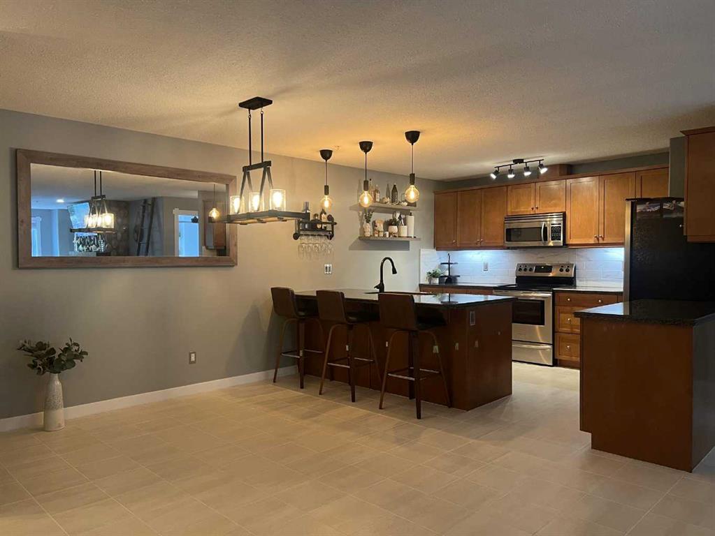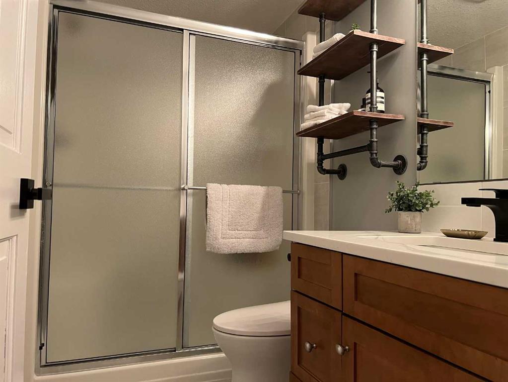 Crossbow Landing offers the best in Canmore living. This west facing 2 bedroom plus den (or third bedroom), 2 bathroom, single level apartment features large square footage and updates throughout. Renovations include paint, flooring, countertops, faucets, stone work and ceiling fans. Storage abounds in the kitchen, bathrooms, laundry room and multiple closets. Host guests in the open concept kitchen, dining room and living room. Enjoy the warmth of the in-floor heat and river stone gas fireplace. The amenities building, offering indoor and outdoor hot tubs, sauna, well-equipped fitness room, and a huge common room with games, library, TV and lounge areas is among the best in the valley. To top it off, you get TWO titled parking stalls in the heated parkade, plus TWO large storage units in front of the parking stalls. Located near the Bow River and trails, and the new retail zone that is currently being developed.