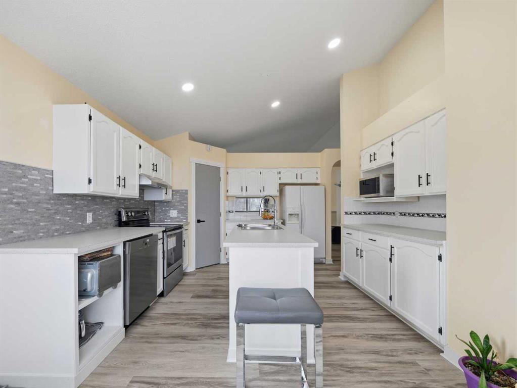 The eat-in kitchen is well designed with a centre island, ample cabinetry and counter space, and direct access to a two-tiered deck overlooking a large, fully fenced backyard—perfect for kids, pets, and summer gatherings.